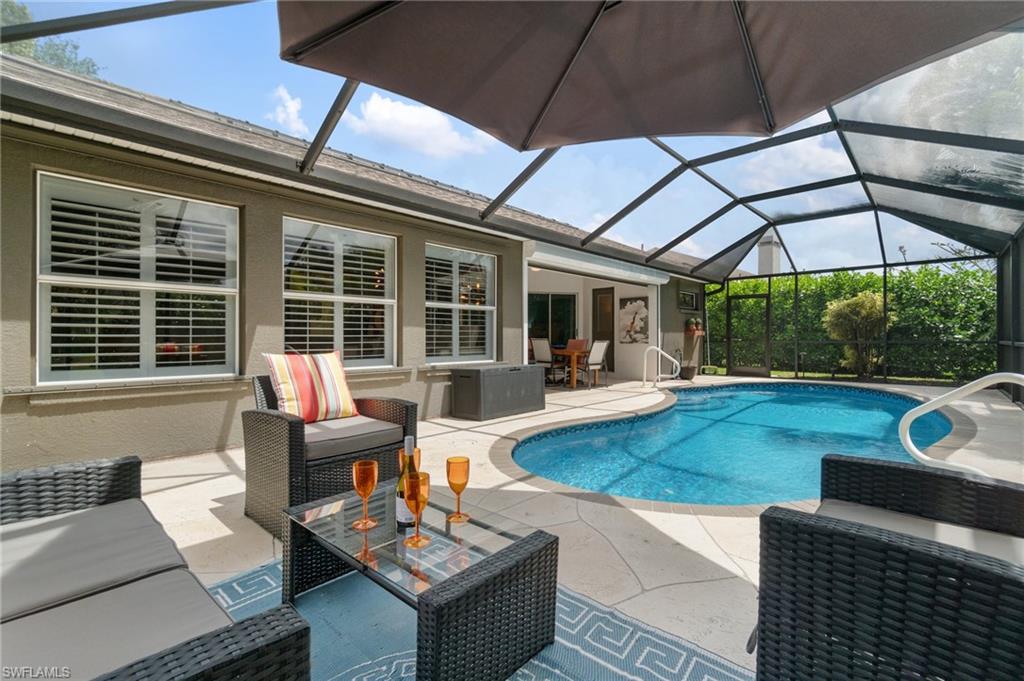 Resort-Style Living in Fountain Lakes – Turnkey, Updated, and Minutes from Shops, Dining & Gulf Beaches! Great Rental Investment! This beautifully updated southern exposure pool home with a 3-car garage is nestled in the gated golf community of Fountain Lakes, just west of US-41. Offering impressive upgrades and resort-style amenities, this home checks all the boxes. Notable enhancements include a new roof in 2023 with new solar panels for efficient pool heating, a freshly painted pool cage with new screens and doors, and lush tropical landscaping. Additional improvements include a new HVAC system, hot water heater, and updated plumbing throughout. The interior boasts high ceilings, abundant natural light, and designer touches that create a luxurious atmosphere. The remodeled kitchen features quartz countertops and a custom-built barn door leading to the pantry. Plantation shutters add elegance and allow for effortless control of natural light, setting the perfect ambiance in every room. The screened lanai, with its new custom-stamped concrete, serves as a seamless extension of the interior living space, offering comfortable seating and a sparkling, resurfaced pool with a brand new pump, all heated by solar panels. For added peace of mind, the lanai is equipped with an electric roll-down storm shutter. Fountain Lakes offers an array of amenities with low HOA fees, including a 9-hole executive golf course, pickleball and tennis courts, and a community pool. Located just minutes from Coconut Point Mall’s vibrant dining and shopping scene and only a short 20-minute drive to Southwest Florida’s renowned Gulf beaches, this home is also conveniently close to SW International Airport. Don’t miss this opportunity to own a top-notch residence in an unbeatable location!