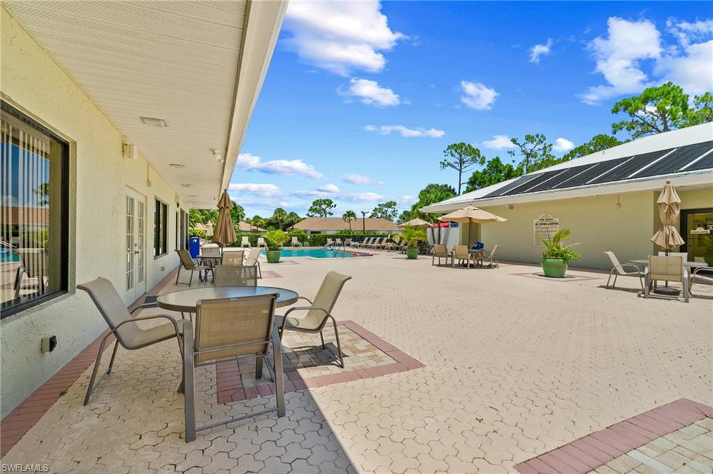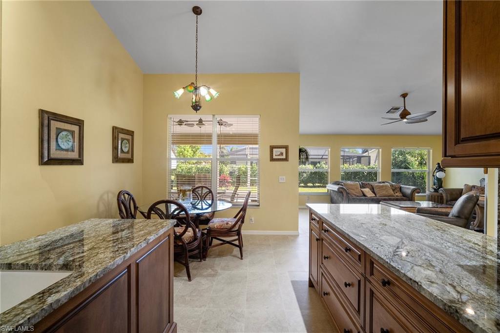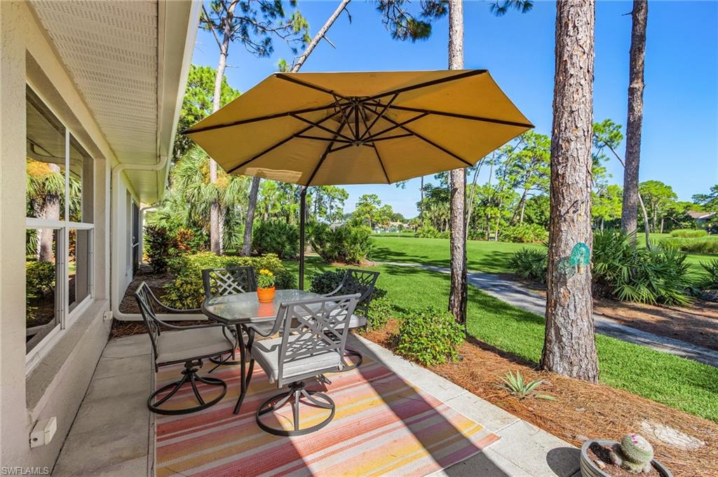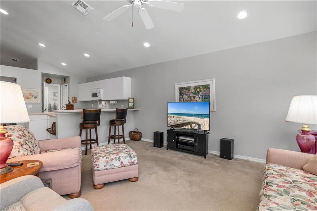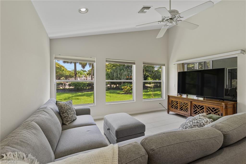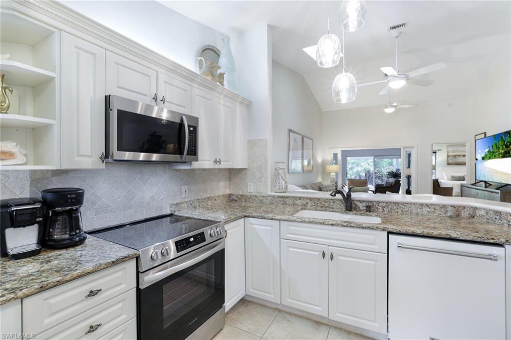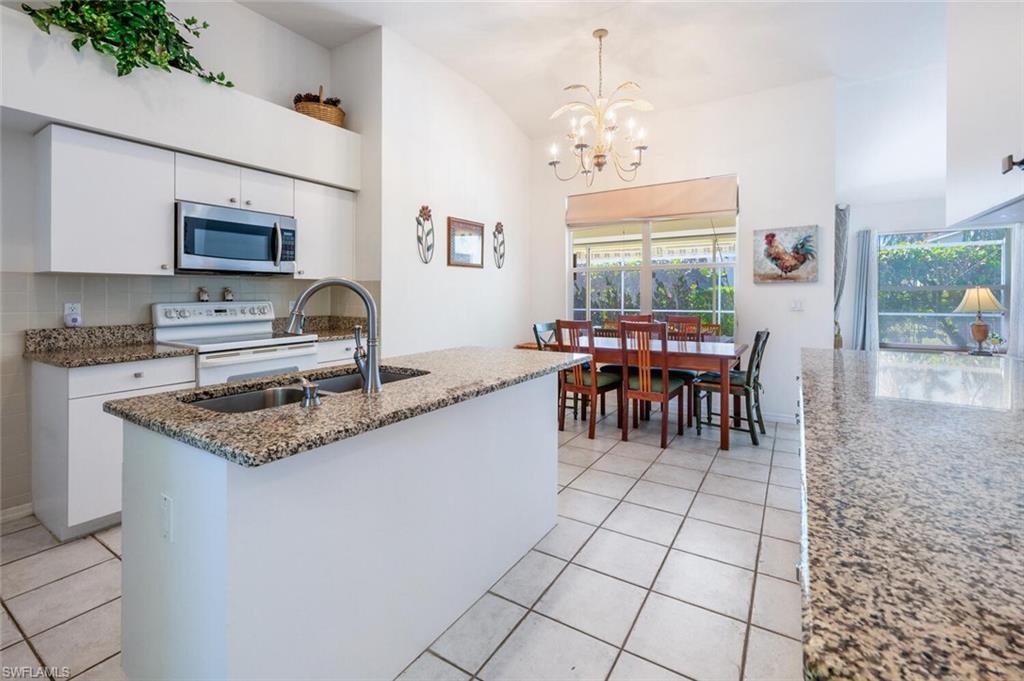 Discover a blend of privacy, comfort and convenience in this move-in-ready, turnkey three-bedroom, two-bath attached villa. Offering privacy of a single-family home with the maintenance-free lifestyle of a condominium, this 1,760-square-foot residence features an updated kitchen with granite countertops, newer appliances, a cozy breakfast nook, custom lighting, plantation shutters and tile and laminate flooring throughout. Enjoy year-round comfort and versatility in the fully air-conditioned Florida room, featuring an enclosed pantry with a convenient sink, ideally next to a spacious, paved outdoor area, ideal for entertaining guests in a peaceful and private setting. A recently replaced roof (2023) and rolldown hurricane shutters provide added security and peace of mind during storm season. This home is in the desirable Fountain Lakes community, directly across from Coconut Point Mall and just minutes from Southwest Florida's stunning beaches, dining, entertainment and airport. Residents enjoy an impressive array of amenities, including unlimited golf, a community pool, tennis courts, shuffleboard, bocce ball, billiards, pickleball, a fitness center, a community center with a library and an active social calendar. Whether you're seeking relaxation or recreation, this home offers it all. Don't miss the opportunity to make this home your next Florida dream!