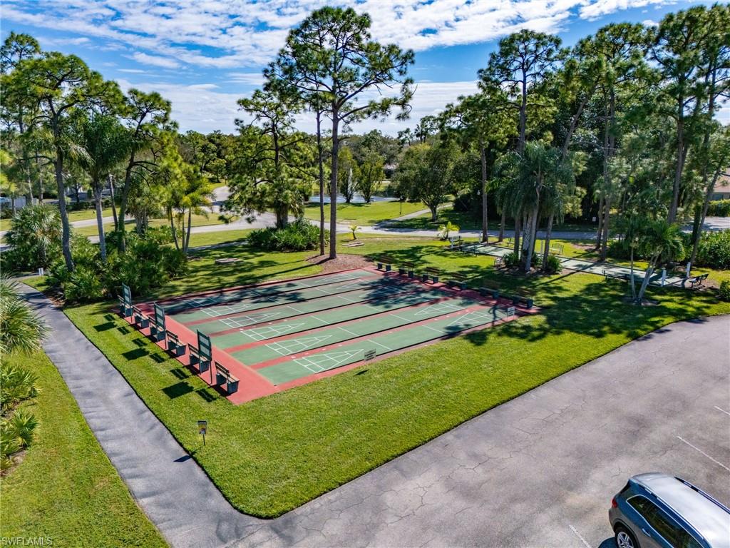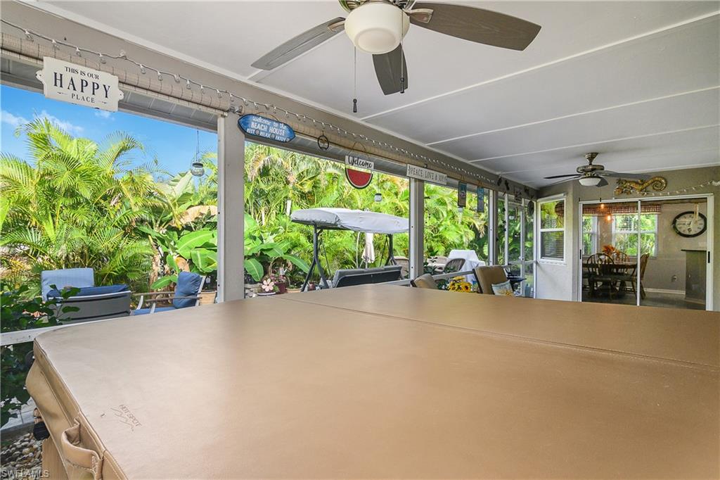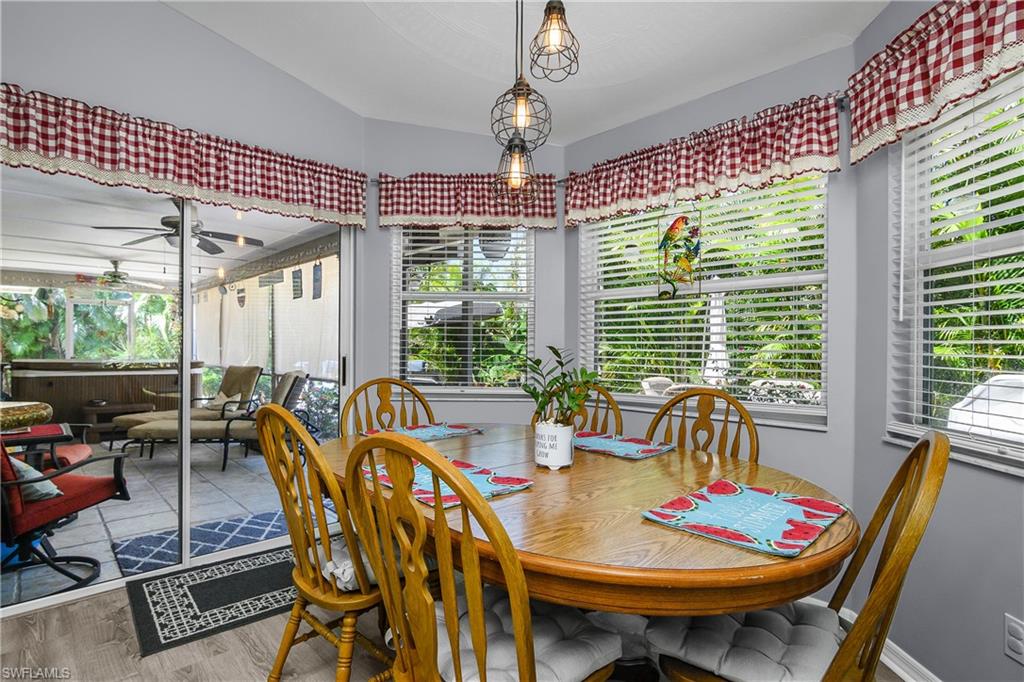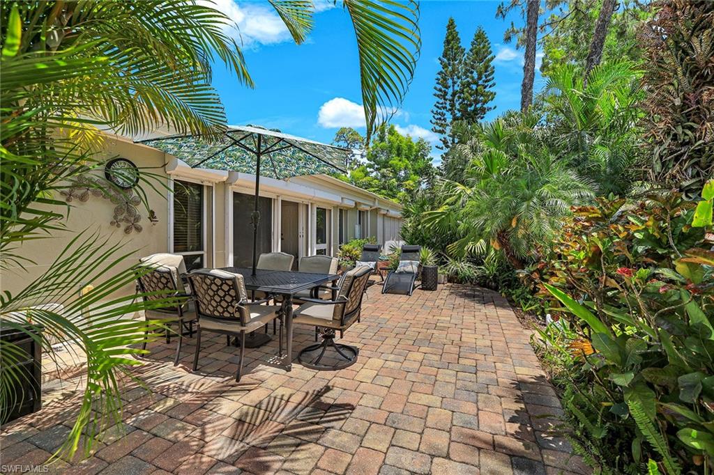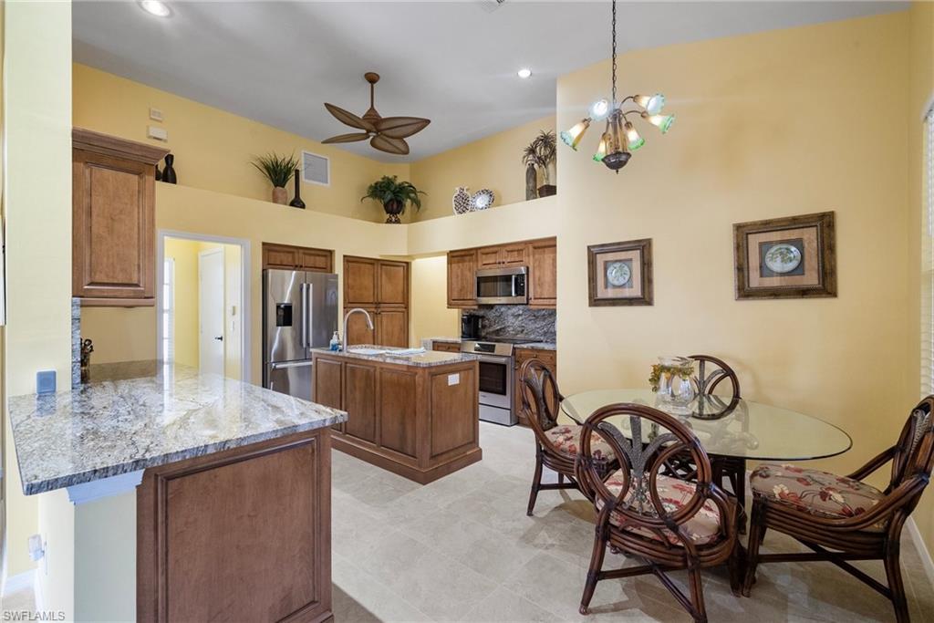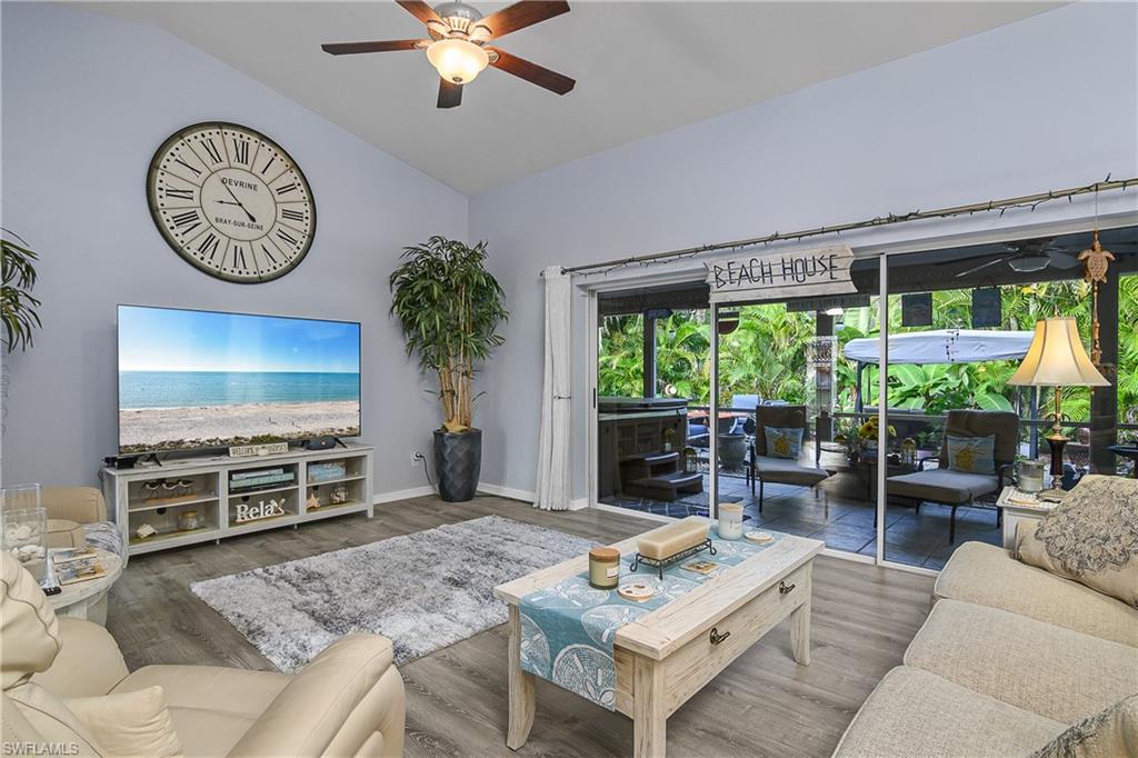 Discover a blend of privacy, comfort and convenience in this move-in-ready, turnkey three-bedroom, two-bath attached villa. Offering privacy of a single-family home with the maintenance-free lifestyle of a condominium, this 1,760-square-foot residence features an updated kitchen with granite countertops, newer appliances, a cozy breakfast nook, custom lighting, plantation shutters and tile and laminate flooring throughout. Enjoy year-round comfort and versatility in the fully air-conditioned Florida room, featuring an enclosed pantry with a convenient sink, ideally next to a spacious, paved outdoor area, ideal for entertaining guests in a peaceful and private setting. A recently replaced roof (2023) and rolldown hurricane shutters provide added security and peace of mind during storm season. This home is in the desirable Fountain Lakes community, directly across from Coconut Point Mall and just minutes from Southwest Florida's stunning beaches, dining, entertainment and airport. Residents enjoy an impressive array of amenities, including unlimited golf, a community pool, tennis courts, shuffleboard, bocce ball, billiards, pickleball, a fitness center, a community center with a library and an active social calendar. Whether you're seeking relaxation or recreation, this home offers it all. Don't miss the opportunity to make this home your next Florida dream!