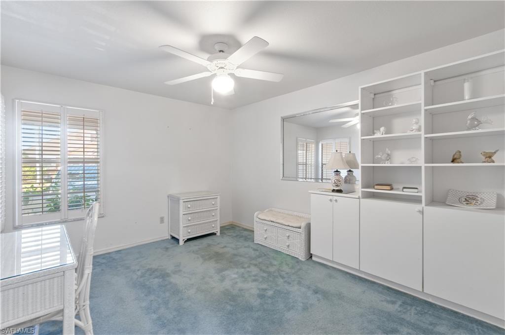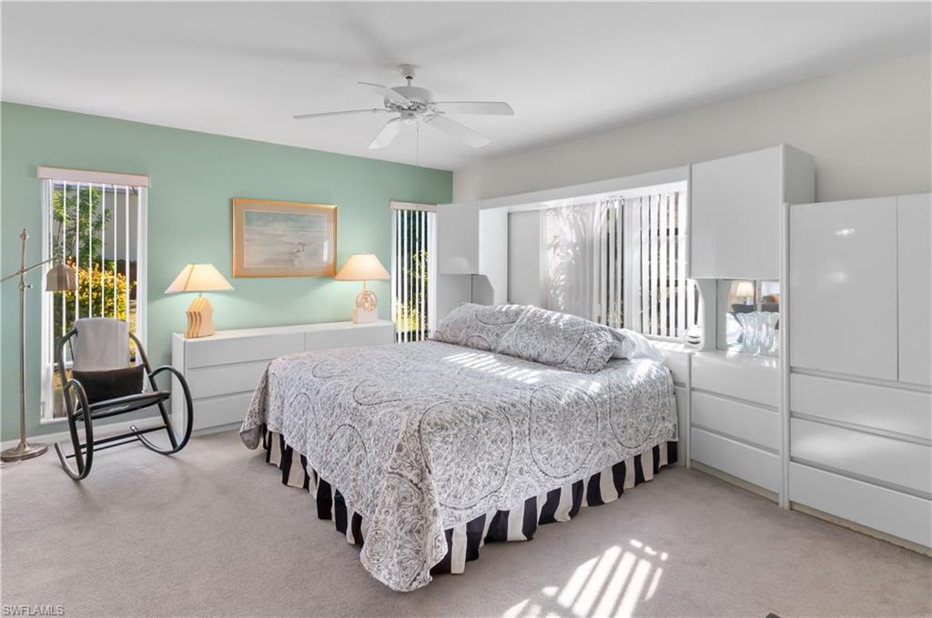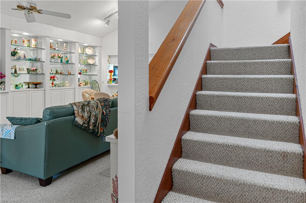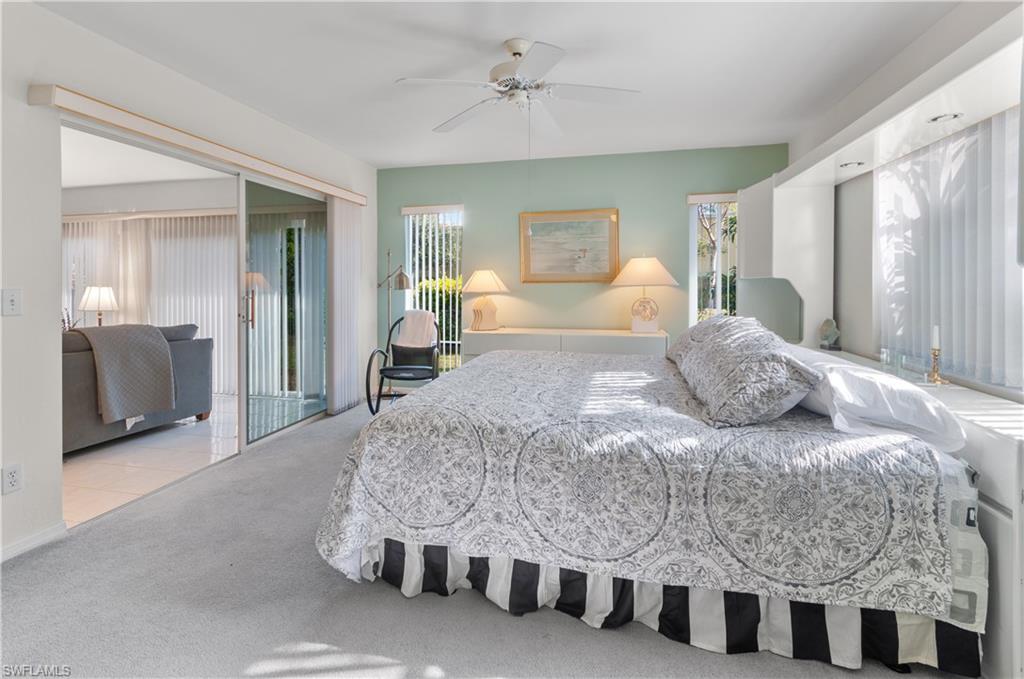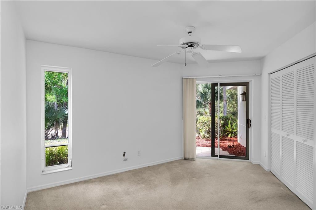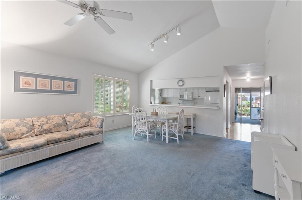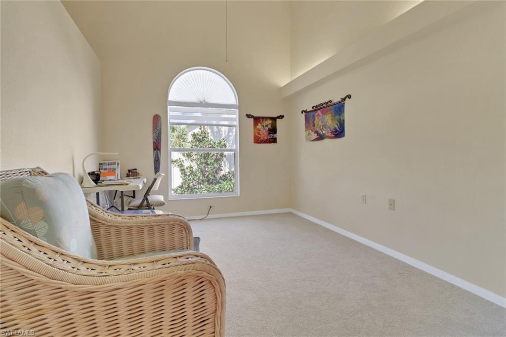 Friendly, Cooperative Listing Agent Ready to Work with You and Your Buyers! This must-see second-floor condo is filled with natural lighting, features high ceilings, and boasts lots of windows, creating an open and airy atmosphere throughout. The spacious 2-bedroom, 2-bath unit also includes charming plant shelves and an enclosed den, offering plenty of flexible living space for your needs. Step outside to the tiled lanai and take in the beautiful landscaped view—perfect for both relaxing and entertaining. The unit also comes with a 1-car garage that has extra storage space above, offering added convenience. The well-maintained community provides an abundance of amenities, including tennis courts, bocce courts, a 9-hole golf course, a clubhouse, fitness room, and a pool. All of this is conveniently located right across the street from Coconut Point Mall, which offers a variety of shopping, dining, and entertainment options. This home is ideally situated, just a short drive from Southwest Florida International Airport and Florida Gulf Coast University (FGCU), making it the perfect blend of comfort and convenience. Don’t miss out on this incredible opportunity—schedule a showing today and experience the lifestyle this condo offers!