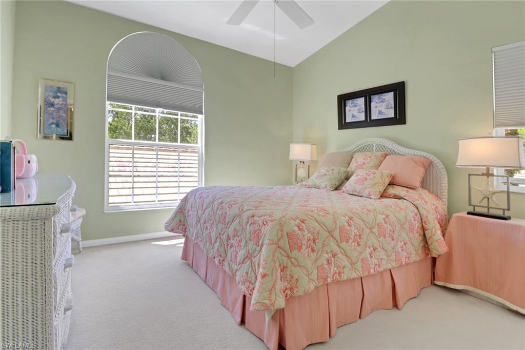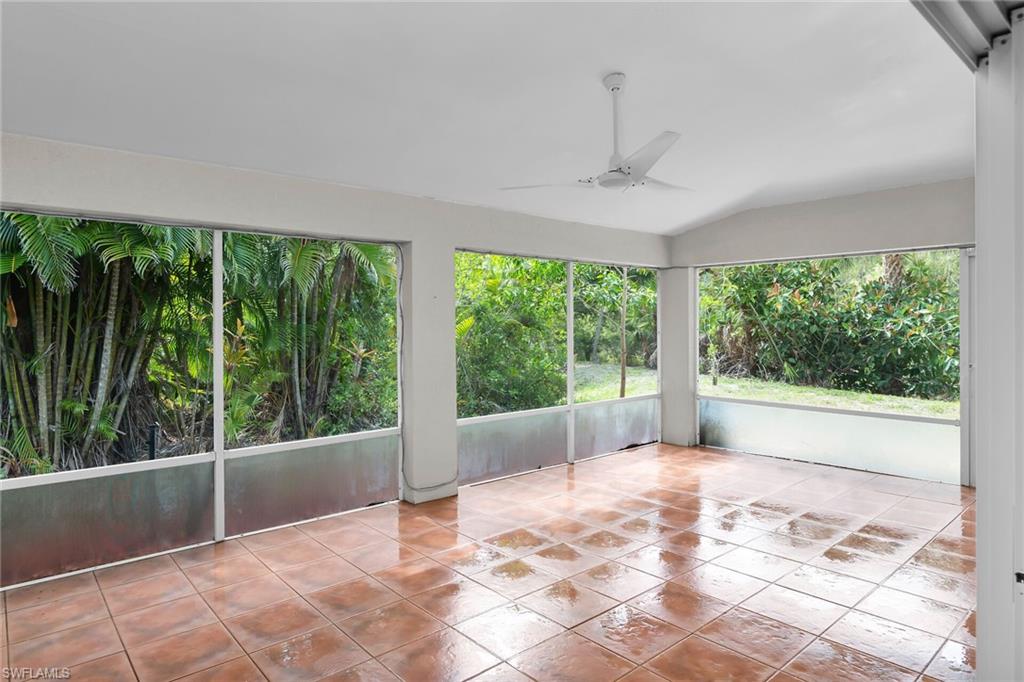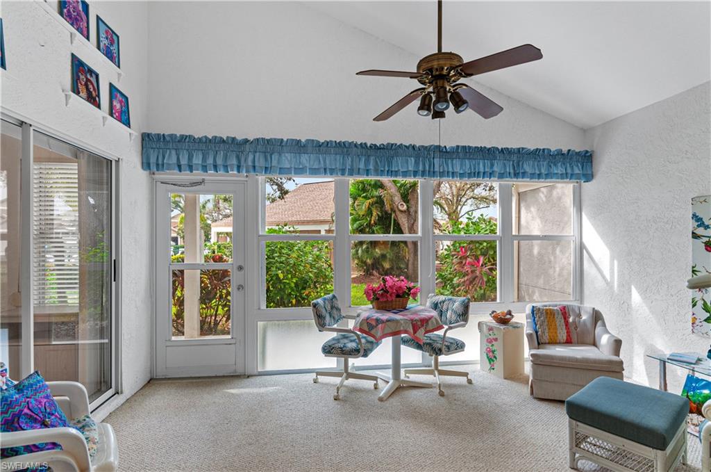 This beautiful Furnished Optional turnkey home in Fountain Lakes is peaceful and just 15 min from the beach! This home is not in a flood zone! Fountain Lakes is a very sought after gated community with events & amenities such as: a Free Par 3 Golf Course, Community Pool (7ft deep), Gym, Tennis, Bocce, Shuffleboard, Pickleball, Basketball, Fishing lakes, Lakeside Walking paths, Billiards, and a Library. This home includes all exterior structural maintenance, painting, landscaping, roof, irrigation, etc. The golf course and amenities are walking distance from this home! Coconut Point Mall is across the street with shopping and many restaurants! This home has soaring vaulted ceilings & an open floor plan. The kitchen has been totally redone with white cabinets, GRANITE countertops, an island, and large custom mirrors. The backyard offers a nice quiet serene view with robins and blue jays. The primary bedroom has vaulted ceilings & an en-suite bathroom with brand NEW GRANITE, an updated shower, and custom closet. The counter has room to add a second vanity easily. The primary opens up to the air conditioned sunroom (sliders can also be opened for use as a screened in patio) and landscaped backyard. The guest room fits a Queen bed but is shown as an office. Buyer may also prefer to use the air conditioned sunroom as an office and the second room as a guest room if preferred. **This home includes all appliances, a perfectly maintained HVAC, and a new roof & gutters (2023). Buyer to verify all information. Furnishings will be removed if buyer prefers.