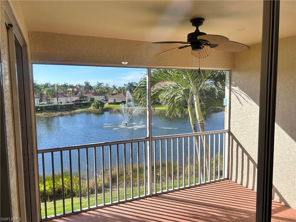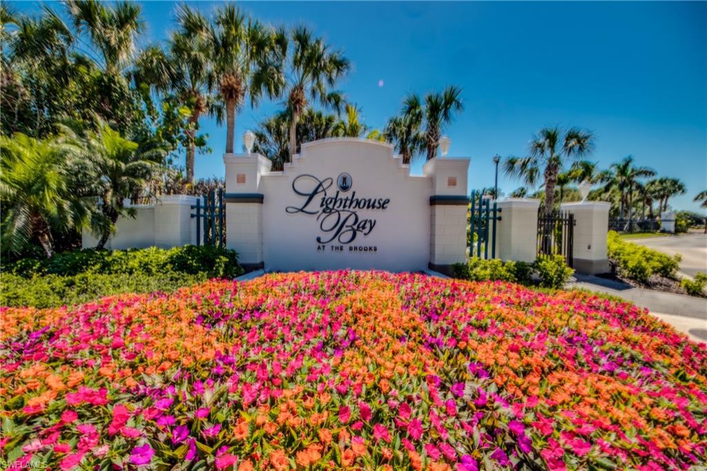 Welcome home to this inviting 1st floor end unit condo with gorgeous sunset views of the lake and four water fountains! This TURNKEY home features 3 beds, 2 baths, in the highly desired community of Lighthouse Bay at the Brooks. The home has abundant natural light and a western exposure overlooking breathtaking lake and fountain views. Start or end your day on your private screened in lanai while listening to the serene water fountains or the sounds of nature. This home's comfortable layout offers so much flexibility with a bright, airy living space and is ideal for those seeking style and minimal upkeep. The primary suite overlooks the lake and fountains and includes a sliding door to the lanai along with an ensuite bathroom with a walk-in shower. The additional bedrooms are spacious and nicely appointed, one is currently used as a den but has a like-new pullout couch for overnight guests. This unit is located walking distance from most of the resort-style amenities. The A/C unit was just replaced in January 2025, hot water heater replaced in June 2025, and the roofs in Lighthouse Bay were replaced in 2020 with durable Stone Coated Steel shingles, ensuring peace of mind. Lighthouse Bay is a gated community offering an array of resort-style amenities, including five pools, an enclosed 25-meter Olympic lap pool, three cabana pools, and a magnificent 2,500 Sq Ft lagoon pool. 3 miles of walking/jogging paths, a bocce program, tennis courts with a pro, pickleball, two boat houses, a fitness center, sauna, clubhouse, library, arts and learning center, and more! The condo also includes Bronze Membership to the Brooks Commons Club featuring a private restaurant, enrichment center, numerous social programs, pickleball, and more. Located just minutes from Coconut Point Mall, dining, entertainment, SWFL Airport, and our beautiful beaches. This condo is perfectly situated to enjoy everything Southwest Florida has to offer.