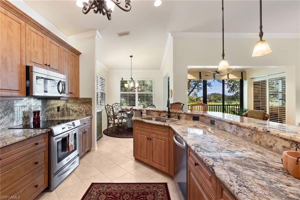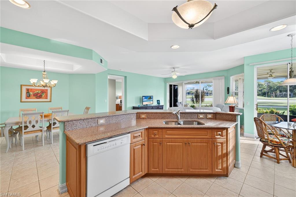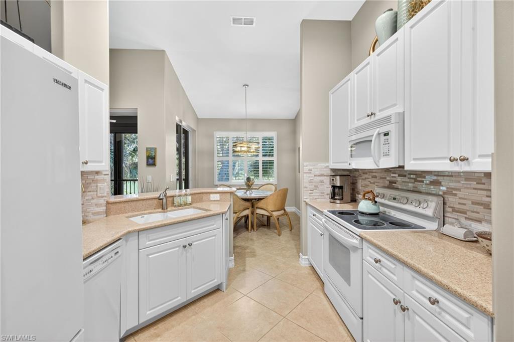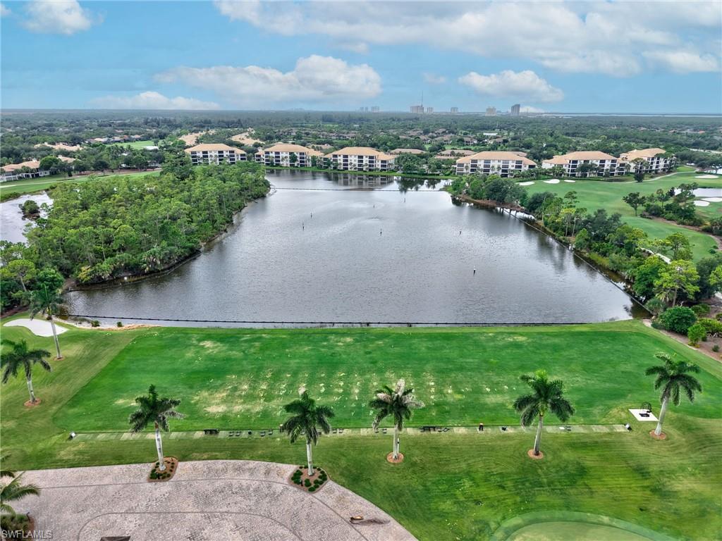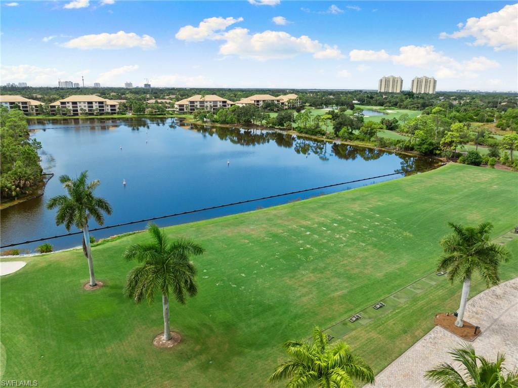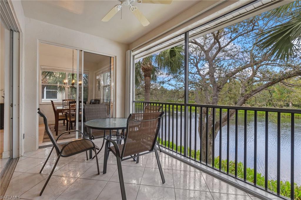 Enjoy the soothing breeze and terrific views from the lanai of this gorgeous 2nd floor end unit condo overlooking the water on hole number 1 of The Lake Course at Pelican Sound Golf and River Club. This outstanding open floor plan residence is being sold turnkey furnished, and offers 2 bedrooms plus den with closet, and 2 full baths. Luxury features include a new updated kitchen (2024) with extra cabinets and undercabinet lighting, all new stainless steel appliances, beautiful quartz countertops, subway tile backsplash & nice pantry area. The morning room off the kitchen offers plenty of space and terrific views of the lake from 3 windows. The master suite features a large walk-in closet and spacious bath with dual sinks & large walk-in shower with natural light that shines through the overhead window. The AC is new (2023), and the attached 1 car garage is perfect for storing your personal golf cart. Pelican Sound is located West US41 and nestled up to the Estero River. The community really has it all…27 holes of Championship Bundled Golf, resort style pool, Estero River access with boat launch and boat storage, a boat shuttle to a private beach, racquets center with 8 tennis courts, 14 pickleball courts, multiple restaurants and bars, state-of-the art fitness center, 5 bocce courts, and a very active social calendar.