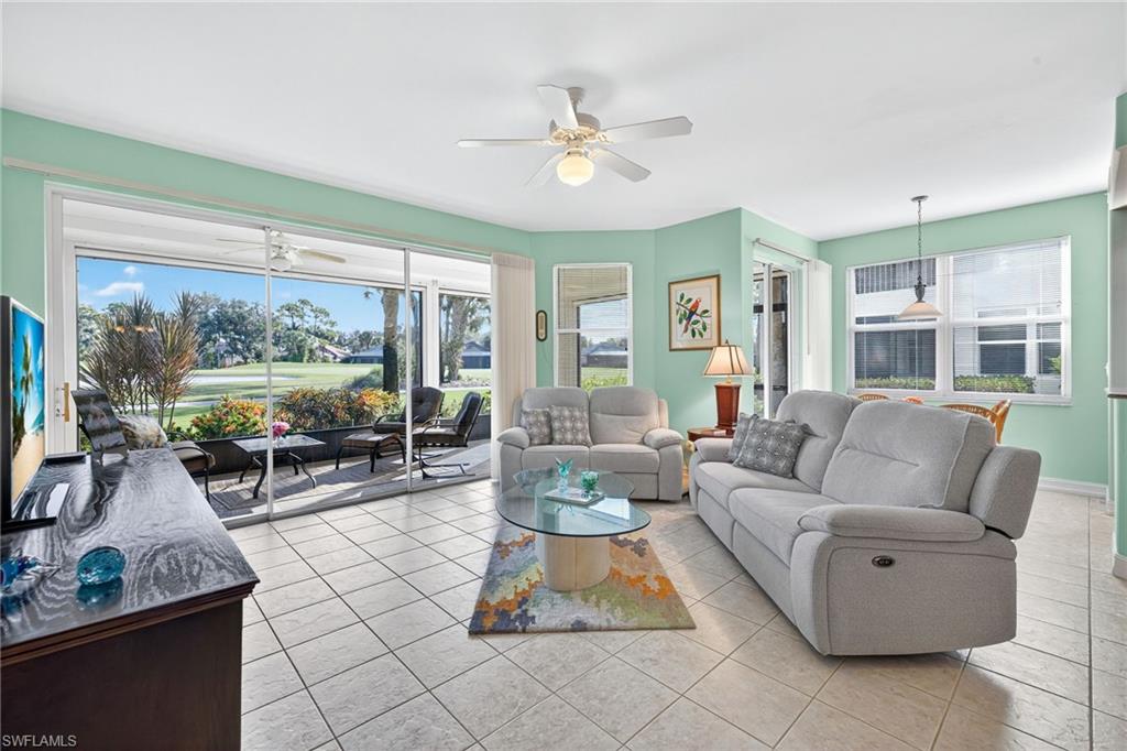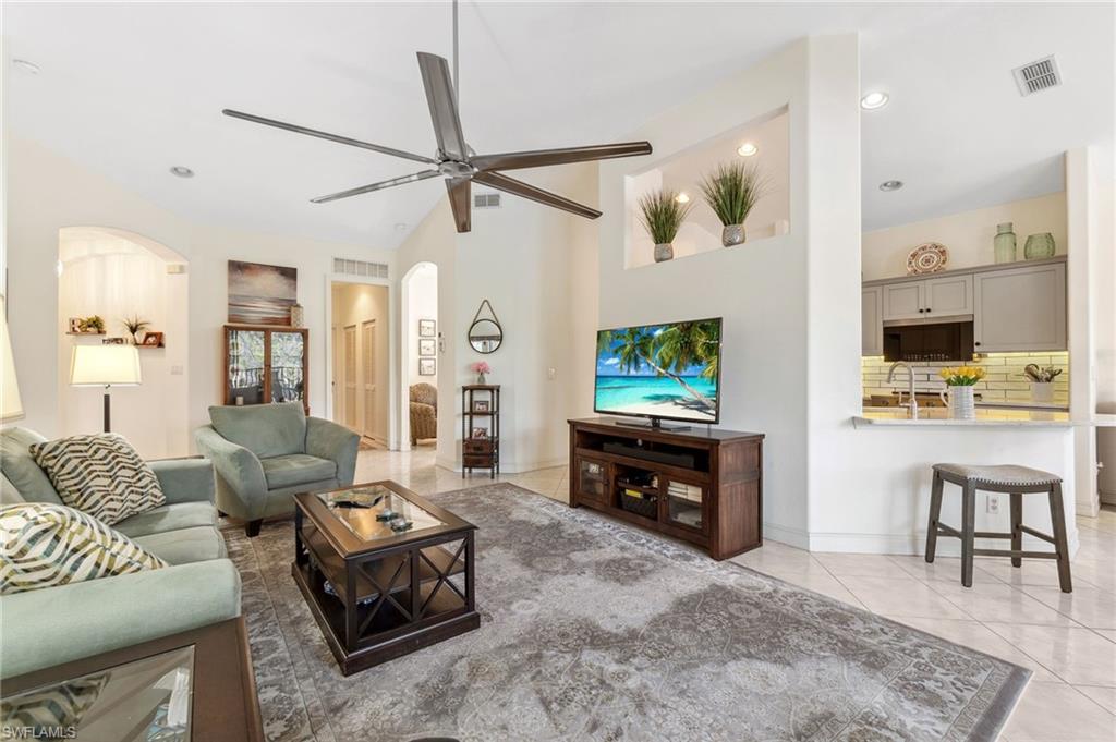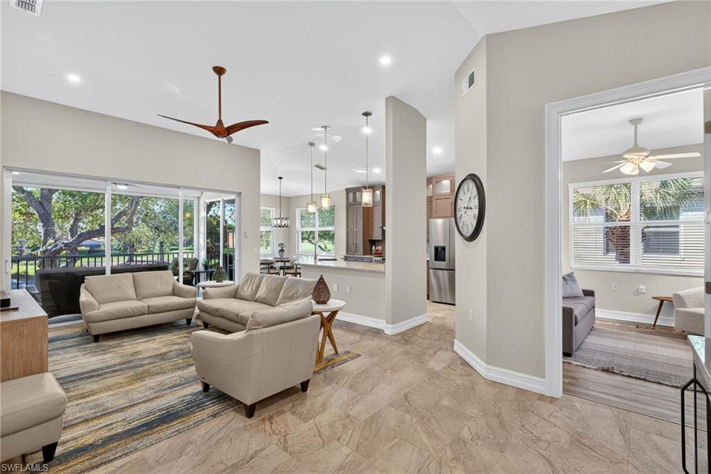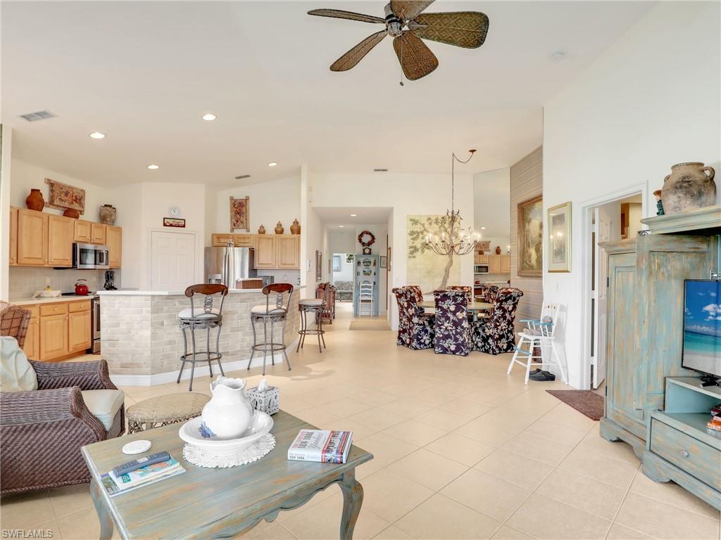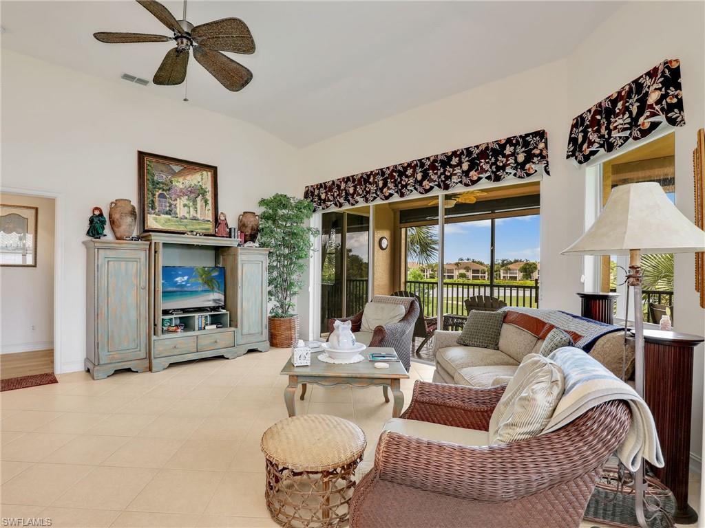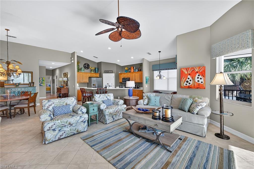 Bright & Spacious Lakeview Home with Desirable Open Floor Plan! Step into this beautiful residence featuring an open kitchen and great room layout, with chic contemporary decor and furniture. Perfect for entertaining and everyday living! Enjoy tile flooring in the main living areas and newer carpet in the bedrooms for comfort and style. The eat-in kitchen boasts a breakfast bar and flows seamlessly into the vaulted-ceiling living space, filled with natural light from its eastern exposure. The primary suite offers a tranquil retreat with a tray ceiling, private lanai access, and a custom walk-in closet system. The en-suite bath includes dual sinks and a sleek frameless glass shower. Guests will appreciate the privacy of a separate bedroom and bath, while the spacious den—complete with laminate wood flooring, a pull-out couch, and plantation shutters—adds versatility for work or relaxation. Unwind on the screened lanai overlooking the serene lake, and enjoy modern conveniences like a tankless hot water heater and a laundry room with cabinetry and newer washer/dryer. This home combines comfort, functionality, and scenic charm, and is being offered turnkey furnished. Just unpack and enjoy the resort life! If you are looking for an active lifestyle look no further: 27 holes of Championship golf, 14 pickleball, 8 tennis and 6 bocce courts. State of the art fitness center that is professionally staffed. Pelican Sound is nestled up to the Estero River with access to the Gulf. The community offers dry boat storage, kayaks, canoes and paddle boarding, along with a shuttle boat to Lovers Key State Beach Park. Minutes from RSW International airport and surrounded by fabulous shopping and restaurants. Start Living The Dream!