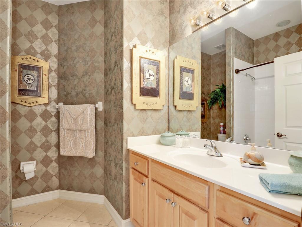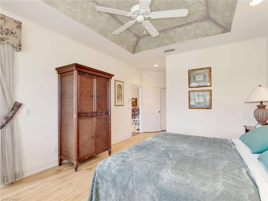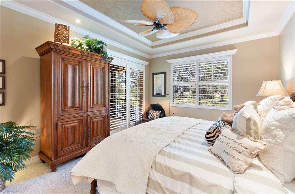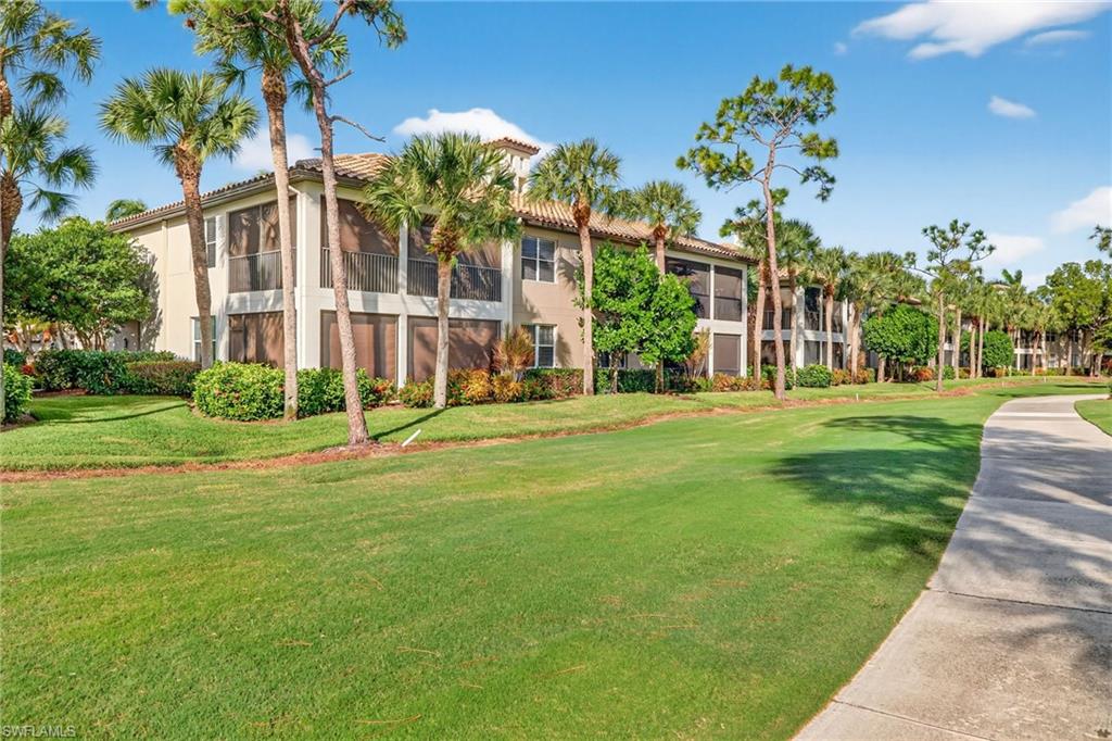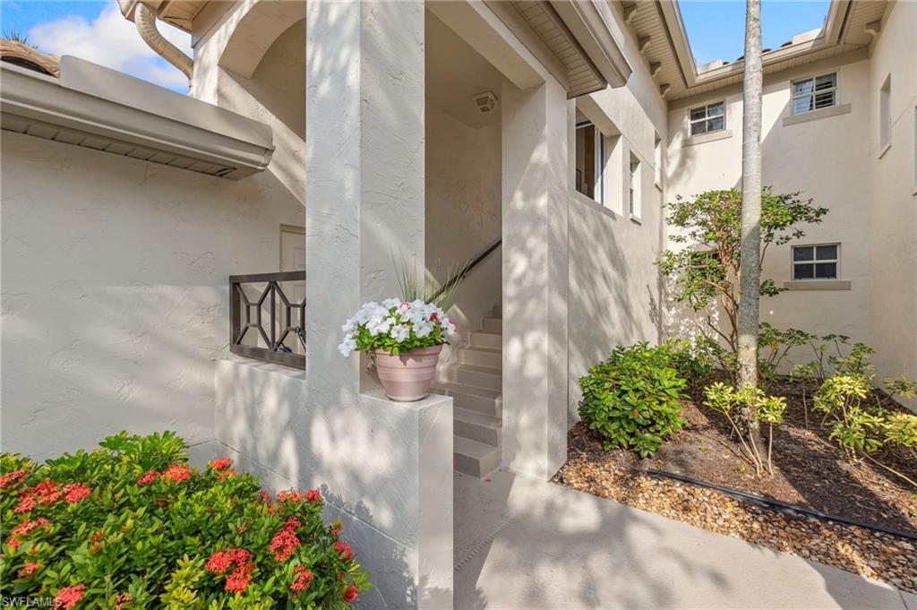 Located in the tranquil, quiet sought after neighborhood of Classic Court. Discover this spacious second-floor carriage home offering stunning southeast exposure with serene golf and lake views. The kitchen is a chef’s delight, featuring honed quartz countertops, KitchenAid stainless steel appliances, wood cabinets and a pantry with custom wood shelving. The primary suite boasts lanai access, a walk-in closet with an upgraded closet system, and a luxurious bath with dual sinks and a walk-in shower. Two guest bedrooms and an updated bath featuring new vanity, granite counter-top, decorative mirror and updated fixture. This guest suite has been thoughtfully positioned for privacy, complemented by a versatile den/office space. Enjoy outdoor living on the tiled wraparound lanai overlooking the 5th hole green of the Sound course, complete with 2024 hurricane screens for peace of mind. This home combines elegance, functionality, and breathtaking views—perfect for your Florida lifestyle! A/C and water heater 2024. If you are looking for an active lifestyle look no further: 27 holes of Championship golf, 14 pickleball, 8 tennis and 6 bocce courts. State of the art fitness center that is professionally staffed. Pelican Sound is nestled up to the Estero River with access to the Gulf. The community offers dry boat storage, kayaks, canoes and paddle boarding, along with a shuttle boat to Lovers Key State Beach Park. Minutes from RSW International airport and surrounded by fabulous shopping and restaurants. Start Living The Dream!