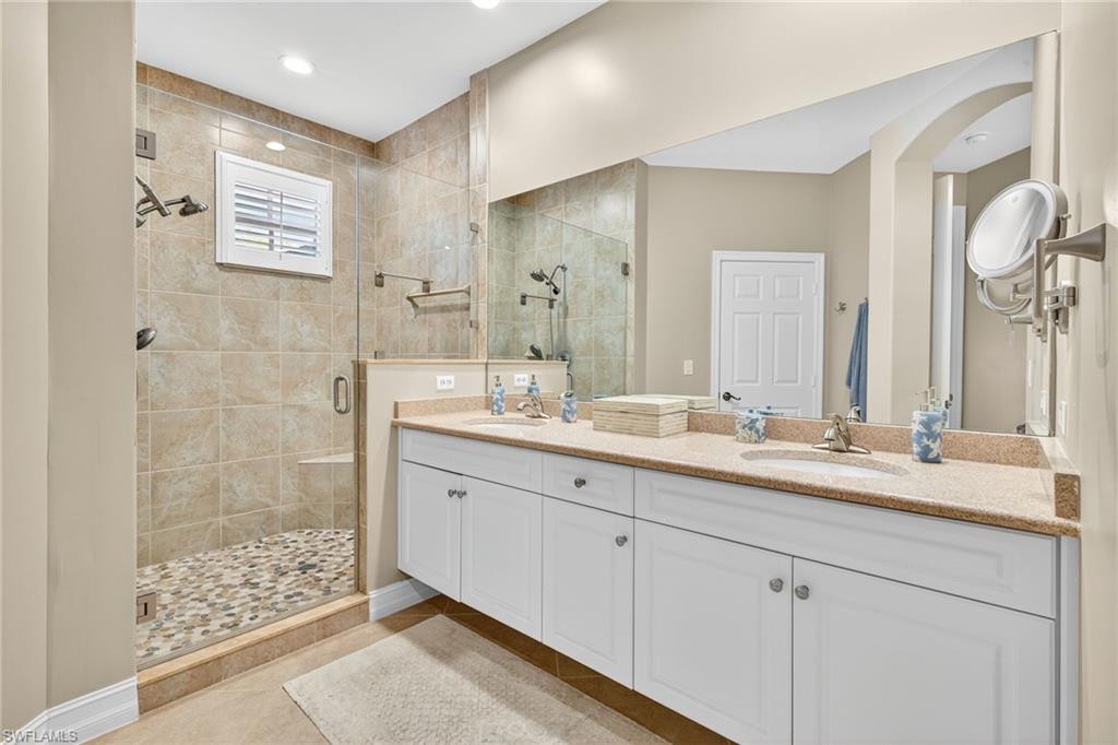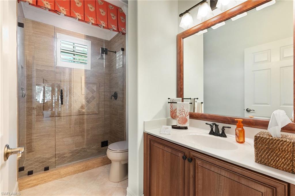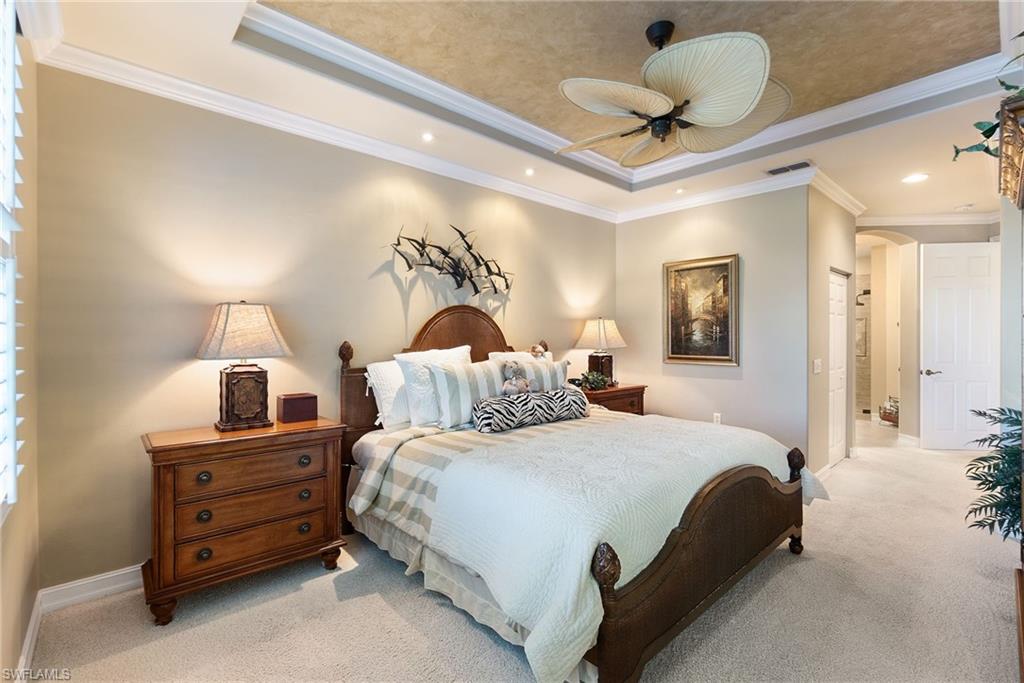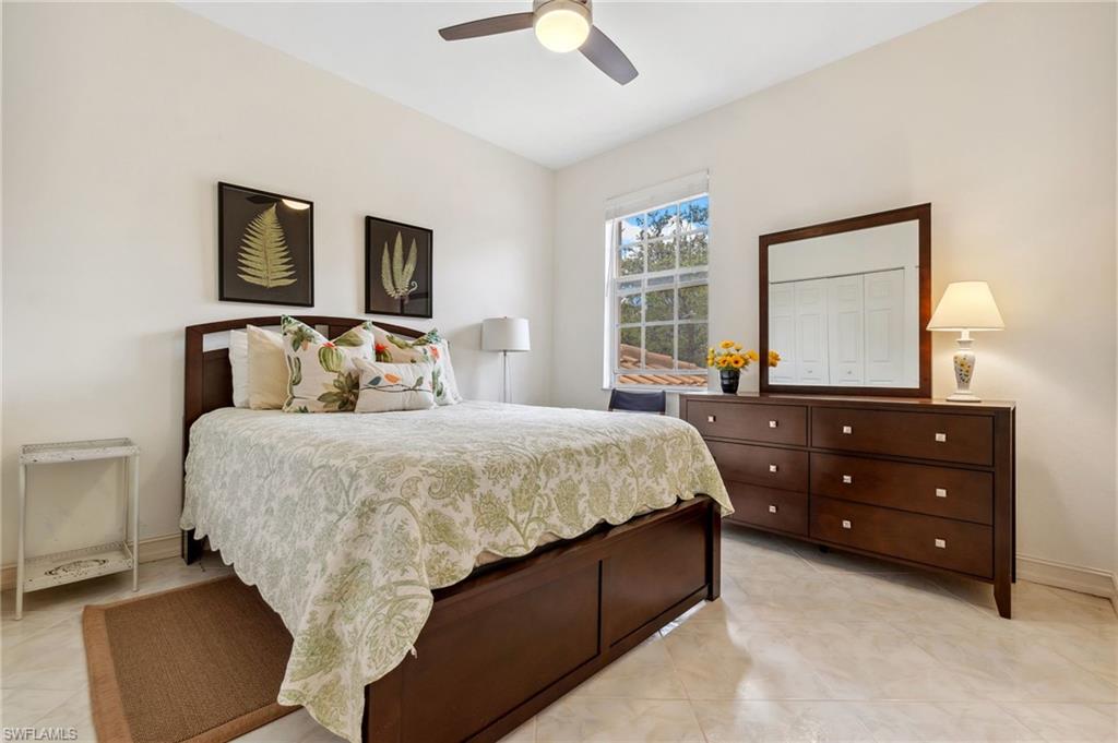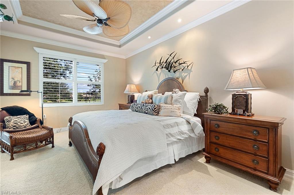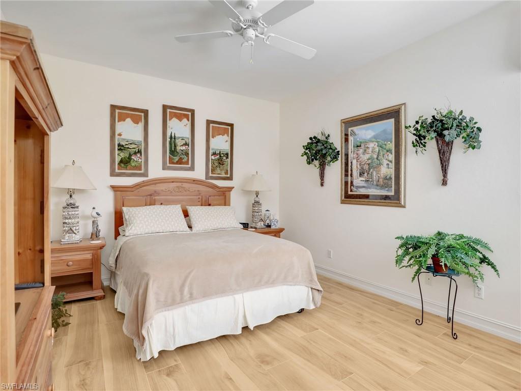 Located in the tranquil, quiet sought after neighborhood of Classic Court. Discover this spacious second-floor carriage home offering stunning southeast exposure with serene golf and lake views. The kitchen is a chef’s delight, featuring honed quartz countertops, KitchenAid stainless steel appliances, wood cabinets and a pantry with custom wood shelving. The primary suite boasts lanai access, a walk-in closet with an upgraded closet system, and a luxurious bath with dual sinks and a walk-in shower. Two guest bedrooms and an updated bath featuring new vanity, granite counter-top, decorative mirror and updated fixture. This guest suite has been thoughtfully positioned for privacy, complemented by a versatile den/office space. Enjoy outdoor living on the tiled wraparound lanai overlooking the 5th hole green of the Sound course, complete with 2024 hurricane screens for peace of mind. This home combines elegance, functionality, and breathtaking views—perfect for your Florida lifestyle! A/C and water heater 2024. If you are looking for an active lifestyle look no further: 27 holes of Championship golf, 14 pickleball, 8 tennis and 6 bocce courts. State of the art fitness center that is professionally staffed. Pelican Sound is nestled up to the Estero River with access to the Gulf. The community offers dry boat storage, kayaks, canoes and paddle boarding, along with a shuttle boat to Lovers Key State Beach Park. Minutes from RSW International airport and surrounded by fabulous shopping and restaurants. Start Living The Dream!