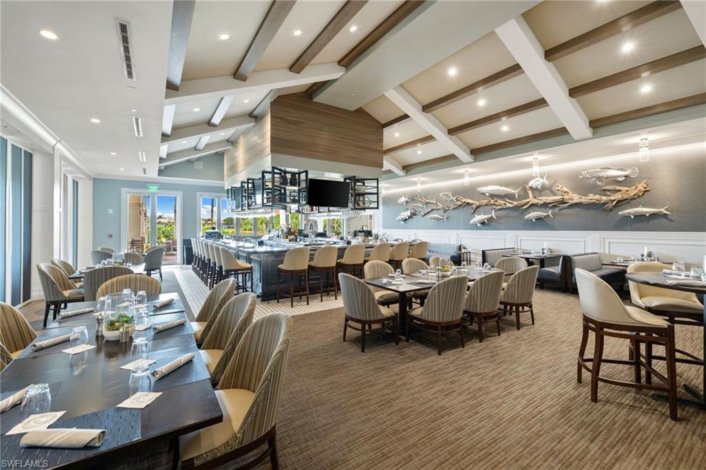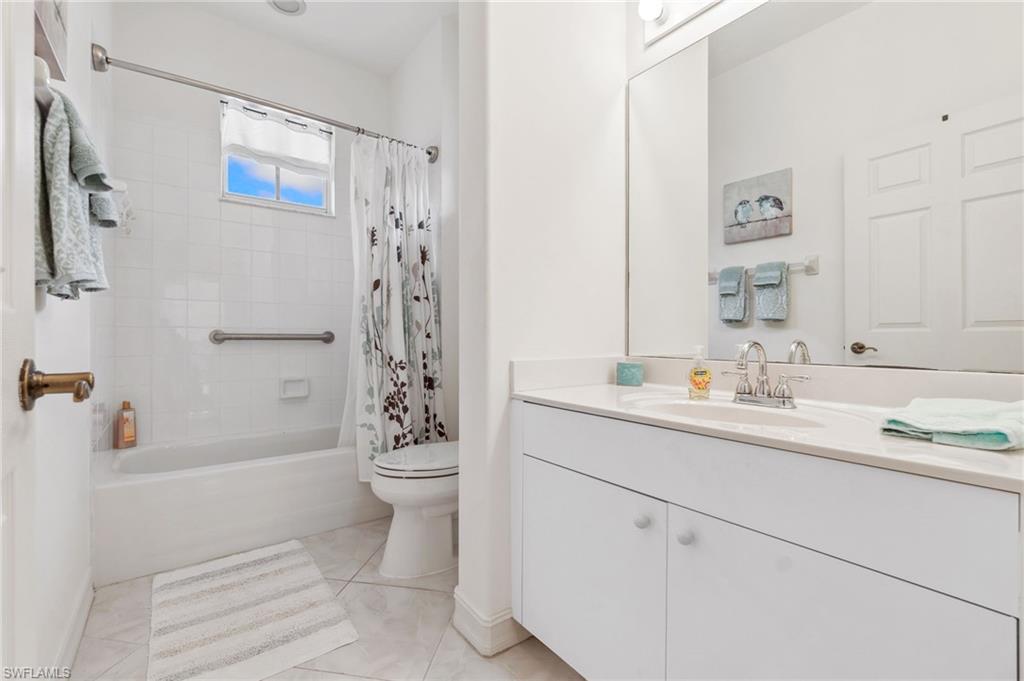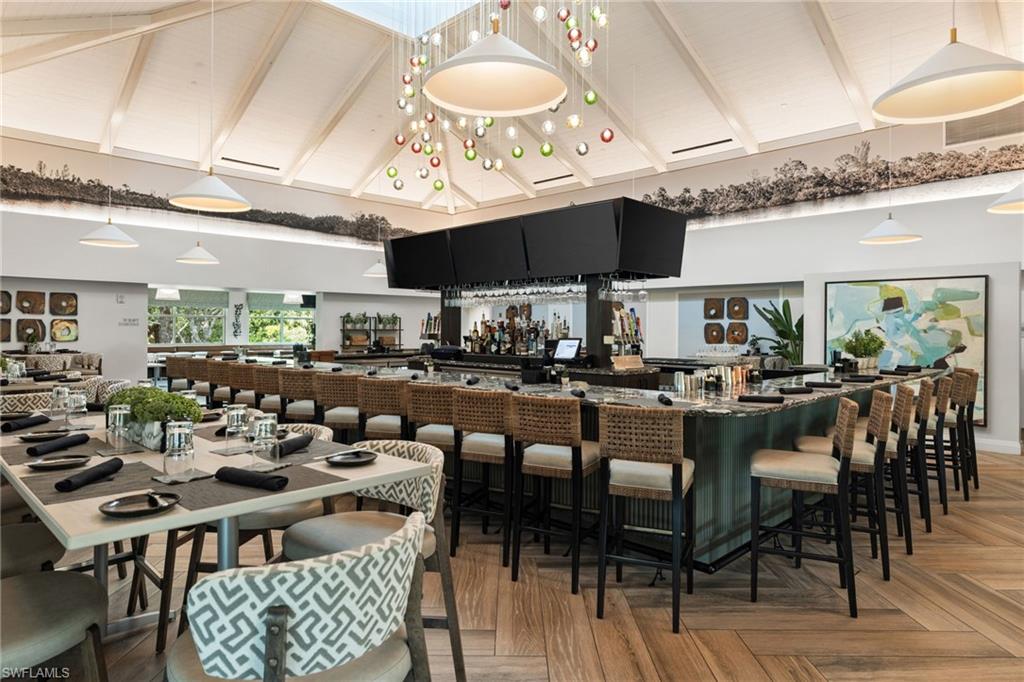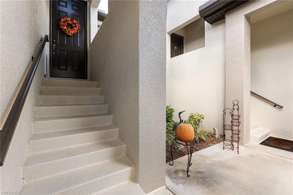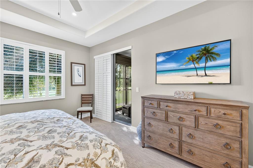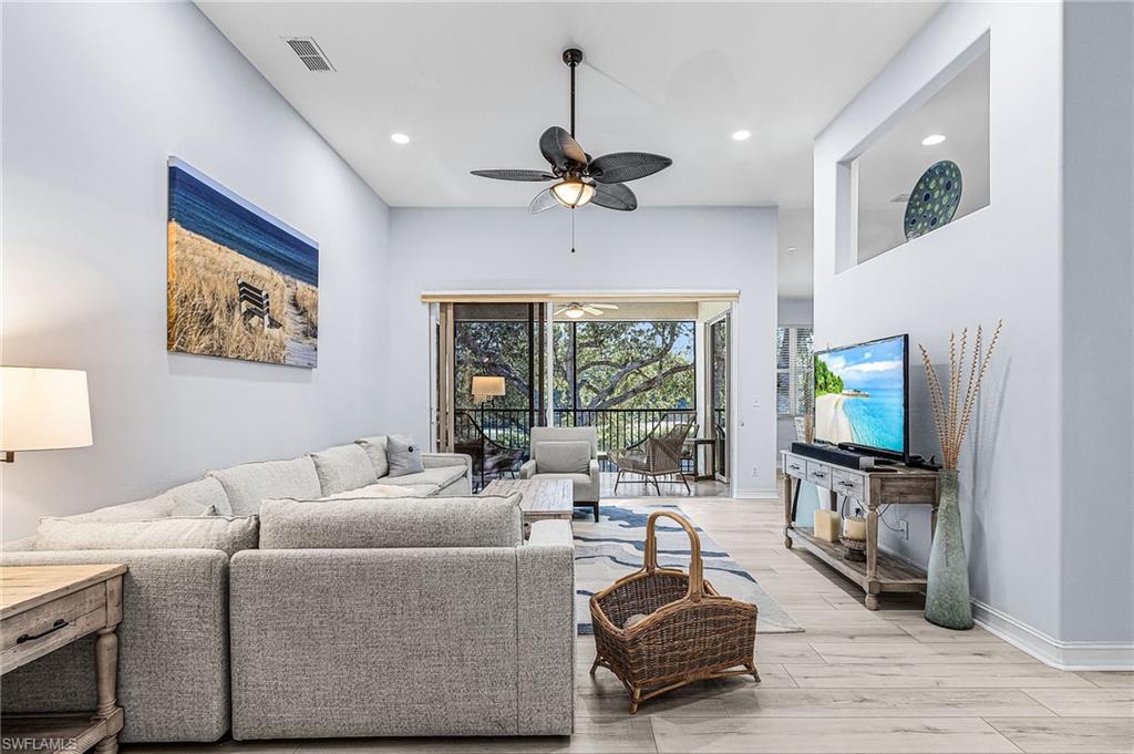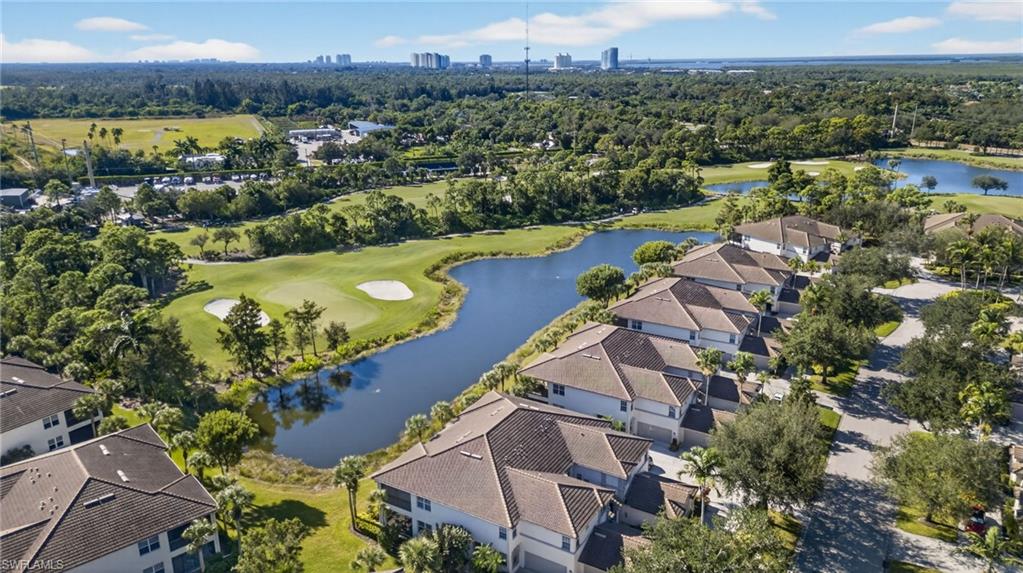 Step into this pristine second-floor coach home in Pelican Sound, one of Southwest Florida's top bundled golf communities. Offered turnkey furnished in a fresh coastal style with stylish accents, this residence boasts stunning views from the lake to the first fairway of the Lakes course. The updated kitchen features sleek quartzite countertops, tall 42-inch white cabinets, crisp white appliances, and convenient pull-out drawers for easy organization. Throughout the main living areas, soaring volume ceilings enhance the sense of space, complemented by durable luxury vinyl plank flooring that runs seamlessly from room to room. Recent upgrades—such as hurricane-resistant windows and sliding doors installed in 2025, refreshed baths, modernized kitchen elements, and new flooring—ensure the entire home feels thoughtfully refreshed and contemporary. Relax in the tranquil primary suite, which includes a tray ceiling, direct lanai access, and a spacious walk-in closet. The fully renovated primary bath offers a long vanity with dual sinks, an updated tiled shower, and a seamless shower door. For guests, a pocket door provides privacy along the hallway to the guest bedroom and its adjacent bath, which has been updated with a new vanity and quartzite countertop. The versatile third bedroom, with double doors, currently serves as a home office or den. Outside, park your car or golf cart in the one-car garage, with additional pads for two more vehicles and nearby guest parking. Access your private entrance via a dedicated stairwell, and enjoy the bright east-facing exposure that fills the space with morning light. Conveniently located near the Corkscrew Road gate, this lightly used vacation condo remains in exceptional condition—simply unpack and settle in! For an active lifestyle, Pelican Sound offers 27 holes of championship golf, 14 pickleball courts, 8 tennis courts, and 6 bocce areas, plus a state-of-the-art fitness center with professional staff. Bordering the Estero River with Gulf access, the community provides secure dry boat storage, kayaks, canoes, and paddleboards. A standout feature is the shuttle service—a scenic pontoon boat ride through Estero Bay to Lovers Key State Park Beach, perfect for spotting wildlife and soaking in breathtaking views. Residents also enjoy the clubhouse with exceptional dining options right in the neighborhood, so you never need to venture far for a memorable meal. Just moments from RSW International Airport, Coconut Point, and an array of shopping and restaurants, this is the ultimate spot to live the Florida dream!