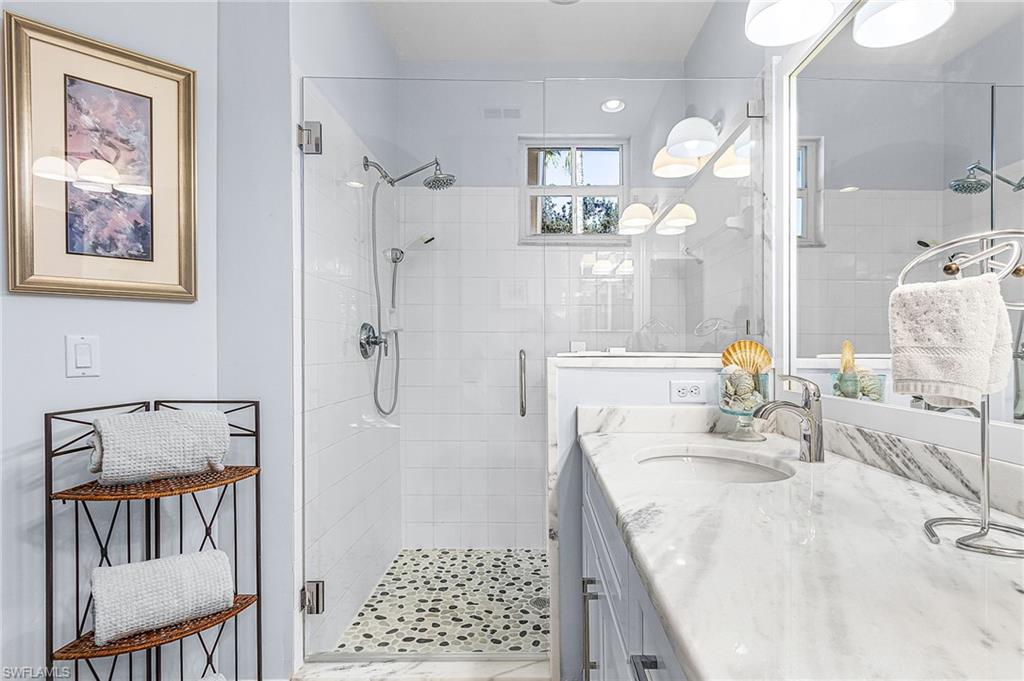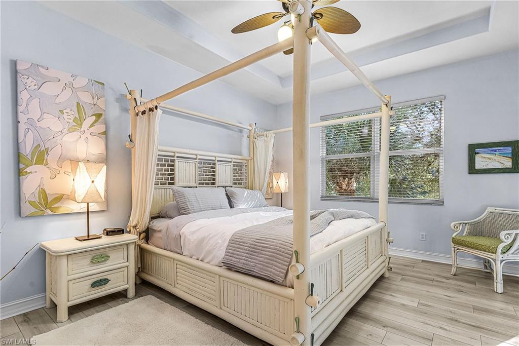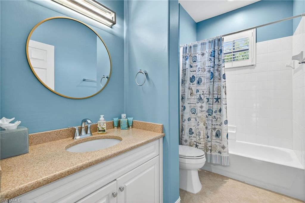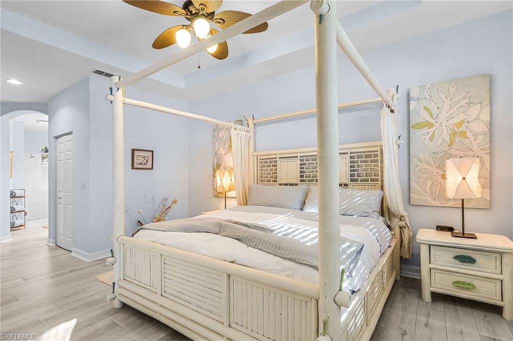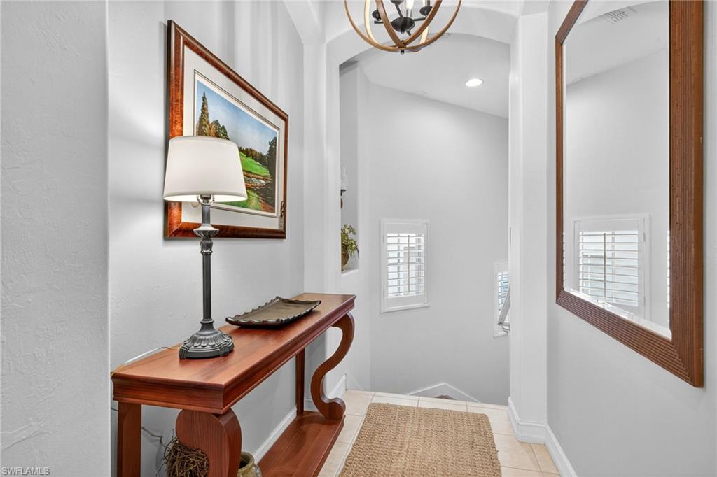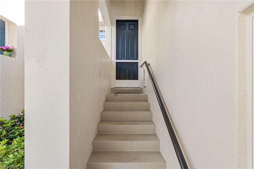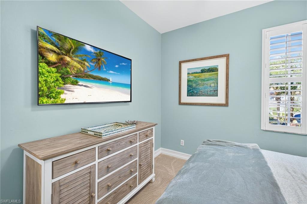 Step into this pristine second-floor coach home in Pelican Sound, one of Southwest Florida's top bundled golf communities. Offered turnkey furnished in a fresh coastal style with stylish accents, this residence boasts stunning views from the lake to the first fairway of the Lakes course. The updated kitchen features sleek quartzite countertops, tall 42-inch white cabinets, crisp white appliances, and convenient pull-out drawers for easy organization. Throughout the main living areas, soaring volume ceilings enhance the sense of space, complemented by durable luxury vinyl plank flooring that runs seamlessly from room to room. Recent upgrades—such as hurricane-resistant windows and sliding doors installed in 2025, refreshed baths, modernized kitchen elements, and new flooring—ensure the entire home feels thoughtfully refreshed and contemporary. Relax in the tranquil primary suite, which includes a tray ceiling, direct lanai access, and a spacious walk-in closet. The fully renovated primary bath offers a long vanity with dual sinks, an updated tiled shower, and a seamless shower door. For guests, a pocket door provides privacy along the hallway to the guest bedroom and its adjacent bath, which has been updated with a new vanity and quartzite countertop. The versatile third bedroom, with double doors, currently serves as a home office or den. Outside, park your car or golf cart in the one-car garage, with additional pads for two more vehicles and nearby guest parking. Access your private entrance via a dedicated stairwell, and enjoy the bright east-facing exposure that fills the space with morning light. Conveniently located near the Corkscrew Road gate, this lightly used vacation condo remains in exceptional condition—simply unpack and settle in! For an active lifestyle, Pelican Sound offers 27 holes of championship golf, 14 pickleball courts, 8 tennis courts, and 6 bocce areas, plus a state-of-the-art fitness center with professional staff. Bordering the Estero River with Gulf access, the community provides secure dry boat storage, kayaks, canoes, and paddleboards. A standout feature is the shuttle service—a scenic pontoon boat ride through Estero Bay to Lovers Key State Park Beach, perfect for spotting wildlife and soaking in breathtaking views. Residents also enjoy the clubhouse with exceptional dining options right in the neighborhood, so you never need to venture far for a memorable meal. Just moments from RSW International Airport, Coconut Point, and an array of shopping and restaurants, this is the ultimate spot to live the Florida dream!