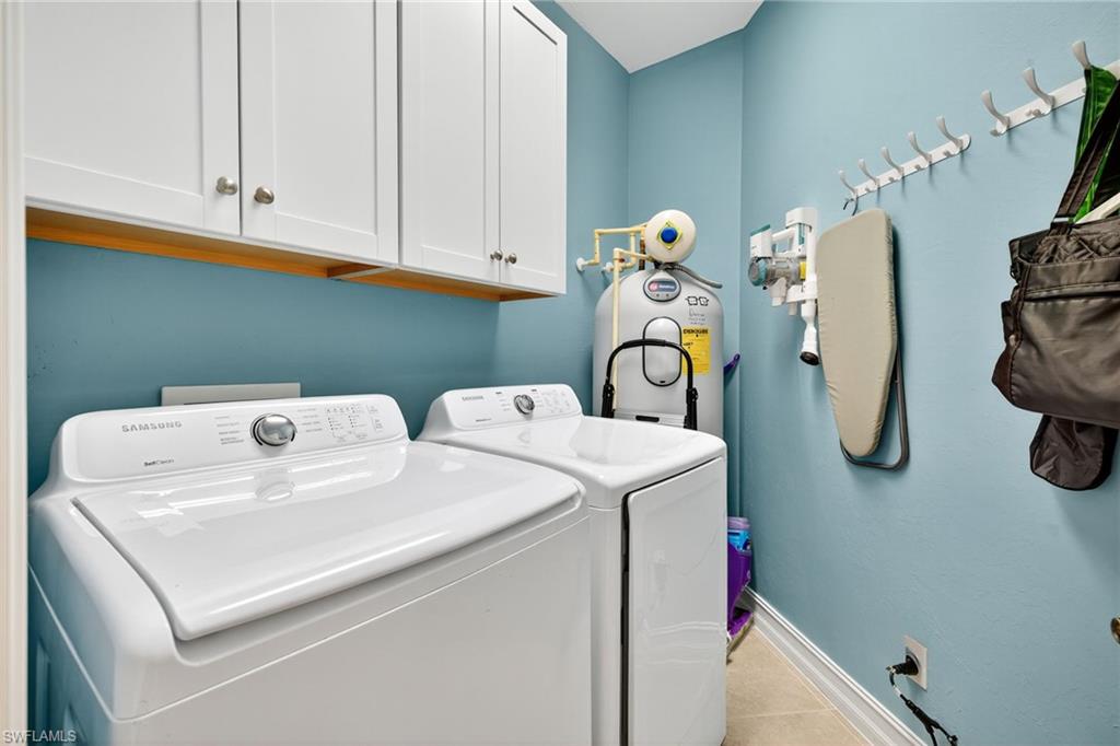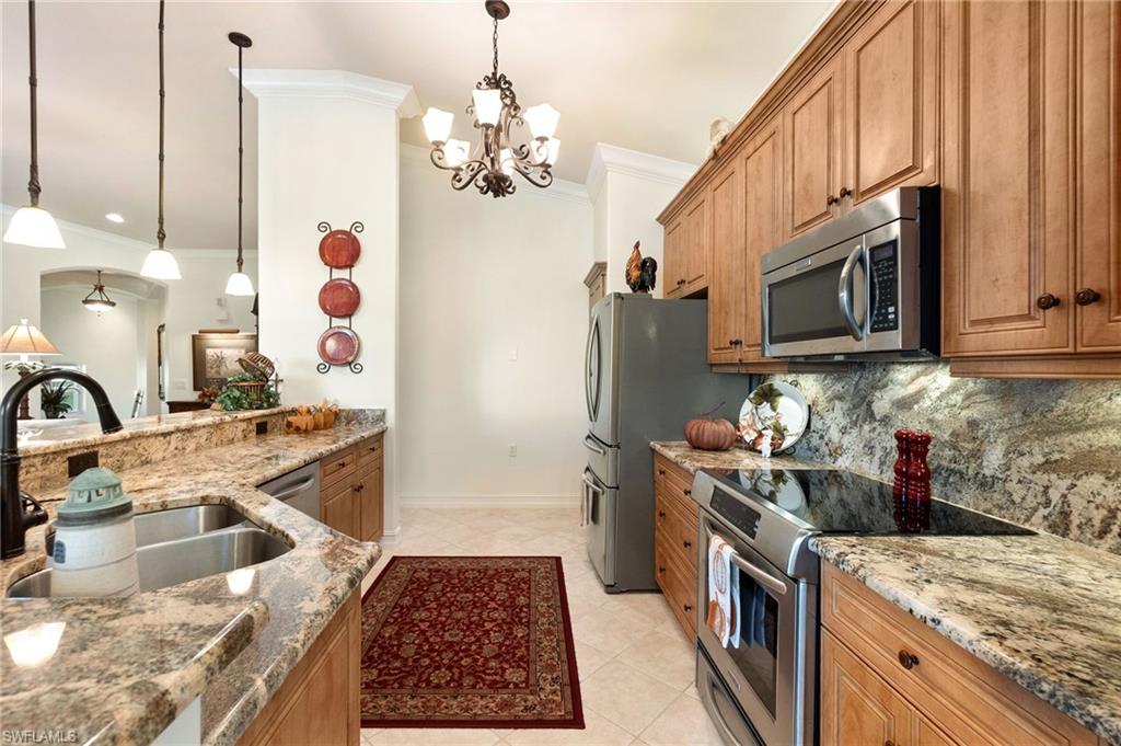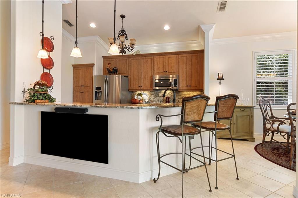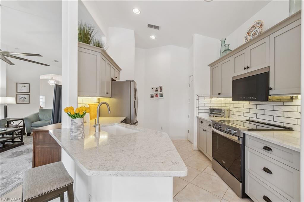 Step into this meticulously updated end unit coach home in Pelican Sound, Southwest Florida's premier bundled golf community. Beautifully updated and tastefully decorated, featuring ceramic tile in the living areas and stairs, and luxury vinyl flooring in both the primary and guest bedroom. The spacious living room boasts a built-in bar with wine cooler, recessed lighting, and elegant pocket doors—perfect for entertaining. The updated kitchen shines with brand new LG stainless steel appliances, granite countertops, gorgeous rich gray cabinetry, a pantry with pull-out shelves, designer lighting, and is completely open to the living area. The primary suite offers a tray ceiling, lanai access, and a luxurious bath with a seamless glass shower door, dual sinks with pull-out shelves below, and touch-light mirrors. The guest bedroom is adjacent to the guest bath, and offers privacy for visiting family and friends. The den/flex room offers a pull out couch for extra sleeping space when needed. The tiled lanai is a relaxing retreat, with wonderful lake and golf course views through the new "noseeum" screens. Additional upgrades include electric hurricane shutters on the lanai, new impact windows and sliders, a 2022 LG washer and dryer, a 2024 tankless water heater, a 2022 A/C system, and a 2023 roof. This home combines style, comfort, and peace of mind— plus an attached one car garage, perfect for your golf cart! If you are looking for an active lifestyle look no further: 27 holes of Championship golf, 14 pickleball, 8 tennis and 6 bocce courts. State of the art fitness center that is professionally staffed. Pelican Sound is nestled up to the Estero River with access to the Gulf. The community offers dry boat storage, kayaks, canoes and paddle boarding, along with a shuttle boat to Lovers Key State Beach Park. Minutes from RSW International airport and surrounded by fabulous shopping and restaurants. Start Living The Dream!