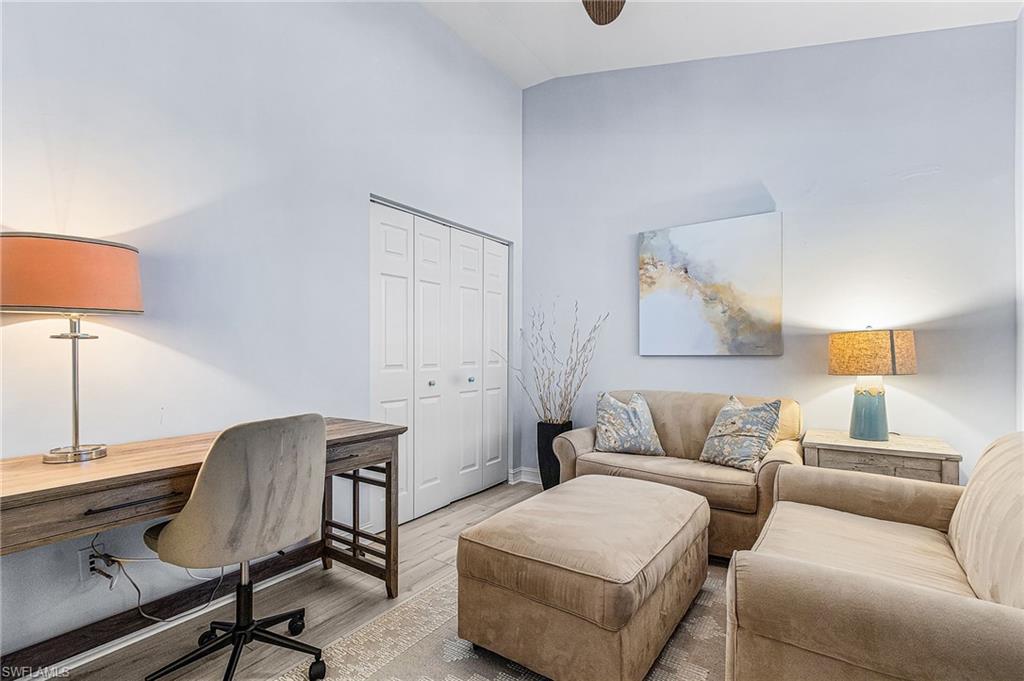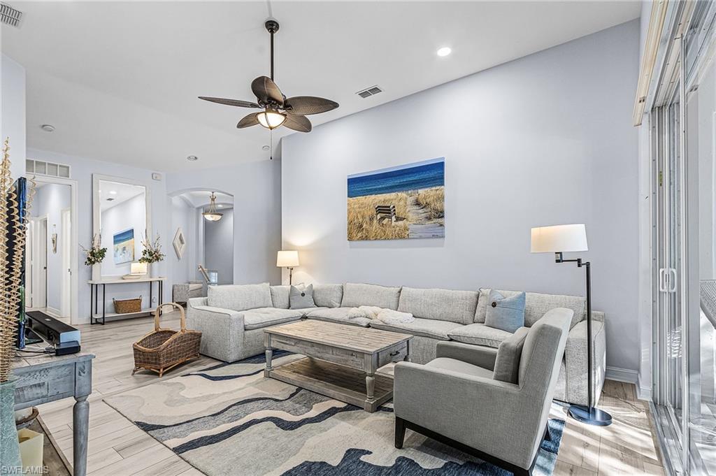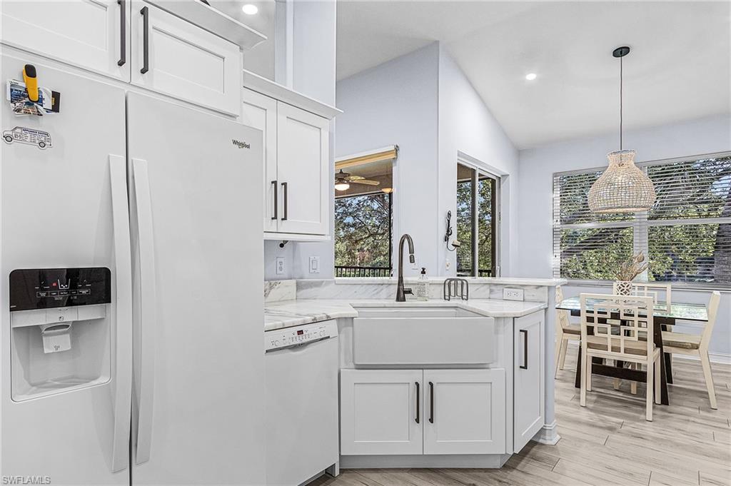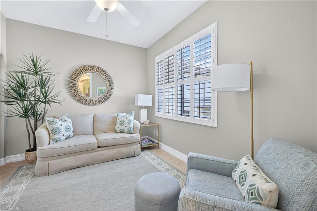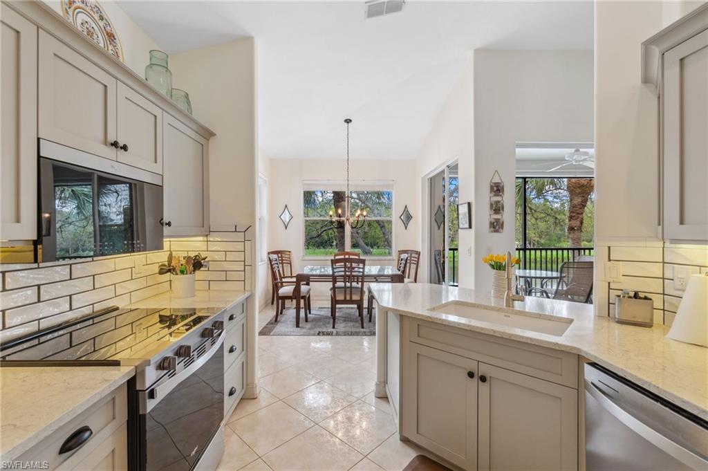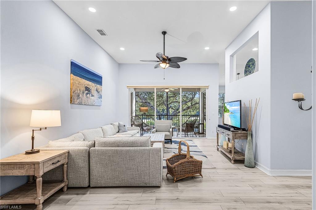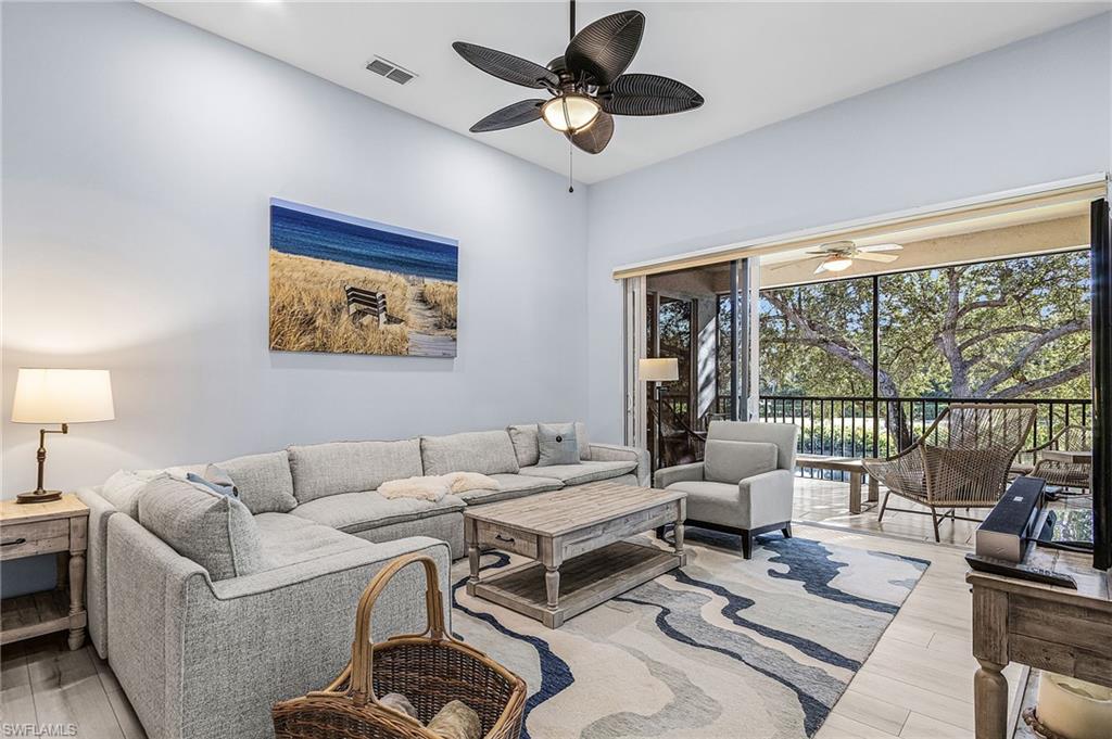 Beautifully updated first-floor coach home featuring luxury vinyl flooring and plantation shutters throughout. The completely renovated kitchen boasts KitchenAid stainless steel appliances, soft-close drawers, and quartz countertops. Sophisticated touches include a shiplap accent wall in the living room, designer light fixtures and sliding barn doors leading to the den. The den offers a closet and can serve as a third bedroom. The primary suite includes lanai access, a custom walk-in closet, and an updated bath with dual sinks, a walk-in shower with bench, and a frameless glass door. The guest bedroom and bath are tucked away for privacy, with the guest bath also updated and featuring a frameless glass shower door. Additional highlights include a newer LG front-load washer and dryer, extra cabinetry in the laundry room, and electric hurricane shutters across the lanai. Enjoy morning coffee or evening cocktails on the peaceful lanai overlooking the fairway. If you are looking for an active lifestyle look no further: 27 holes of Championship golf, 14 pickleball, 8 tennis and 6 bocce courts. State of the art fitness center that is professionally staffed. Pelican Sound is nestled up to the Estero River with access to the Gulf. The community offers dry boat storage, kayaks, canoes and paddle boarding, along with a shuttle boat to Lovers Key State Beach Park. Minutes from RSW International airport and surrounded by fabulous shopping and restaurants. Start Living The Dream!