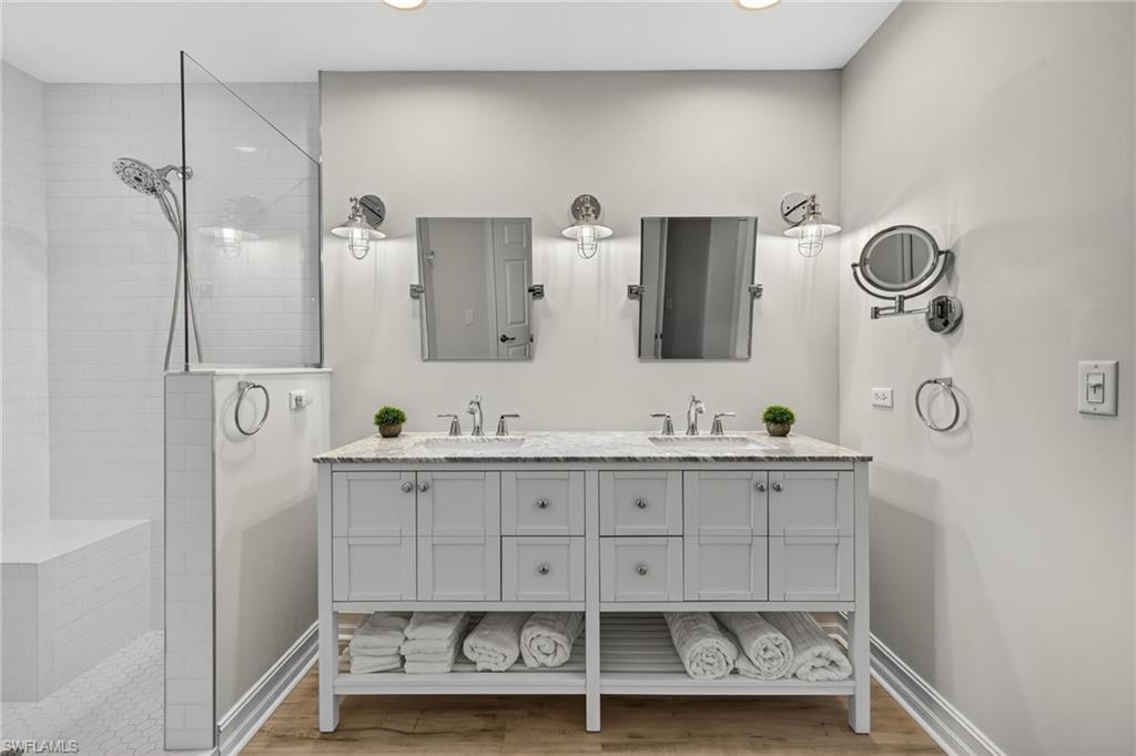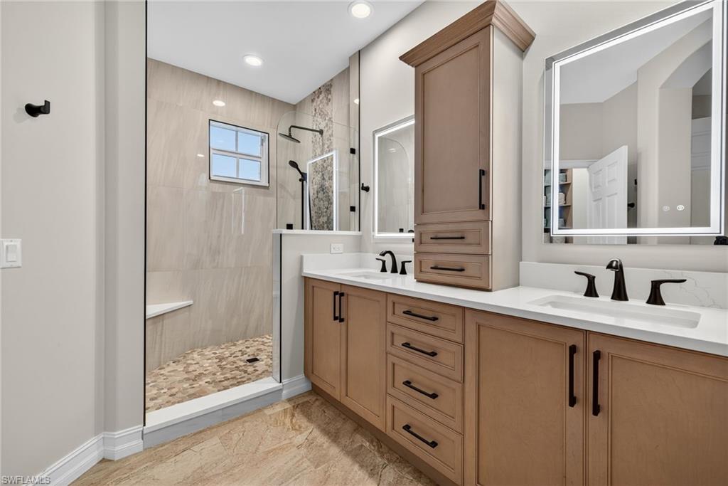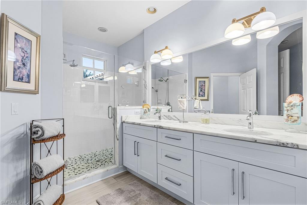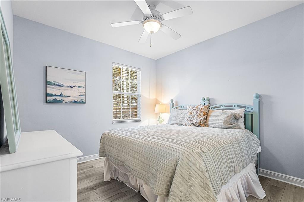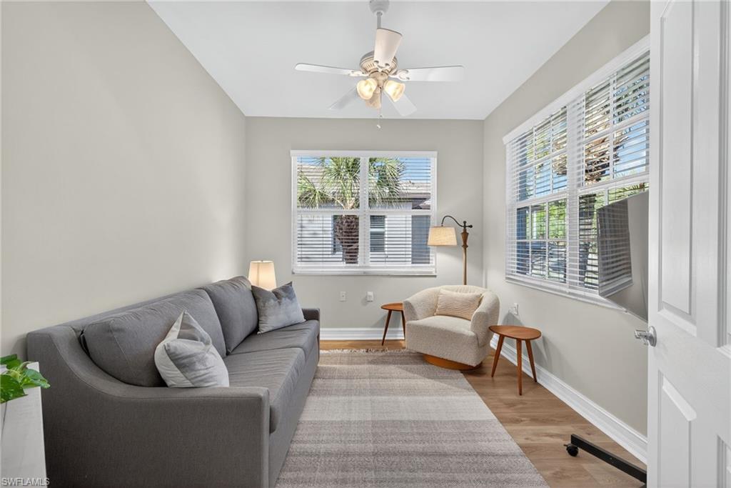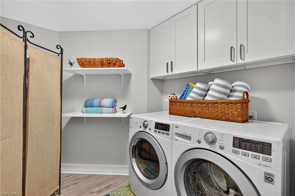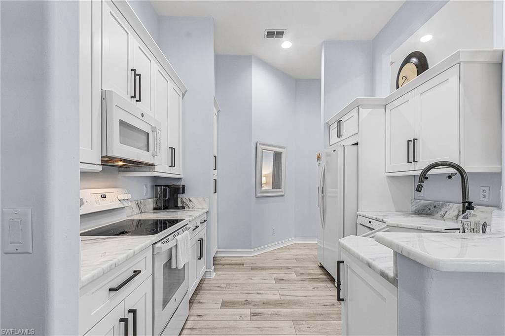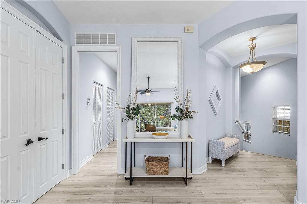 Beautifully updated first-floor coach home featuring luxury vinyl flooring and plantation shutters throughout. The completely renovated kitchen boasts KitchenAid stainless steel appliances, soft-close drawers, and quartz countertops. Sophisticated touches include a shiplap accent wall in the living room, designer light fixtures and sliding barn doors leading to the den. The den offers a closet and can serve as a third bedroom. The primary suite includes lanai access, a custom walk-in closet, and an updated bath with dual sinks, a walk-in shower with bench, and a frameless glass door. The guest bedroom and bath are tucked away for privacy, with the guest bath also updated and featuring a frameless glass shower door. Additional highlights include a newer LG front-load washer and dryer, extra cabinetry in the laundry room, and electric hurricane shutters across the lanai. Enjoy morning coffee or evening cocktails on the peaceful lanai overlooking the fairway. If you are looking for an active lifestyle look no further: 27 holes of Championship golf, 14 pickleball, 8 tennis and 6 bocce courts. State of the art fitness center that is professionally staffed. Pelican Sound is nestled up to the Estero River with access to the Gulf. The community offers dry boat storage, kayaks, canoes and paddle boarding, along with a shuttle boat to Lovers Key State Beach Park. Minutes from RSW International airport and surrounded by fabulous shopping and restaurants. Start Living The Dream!