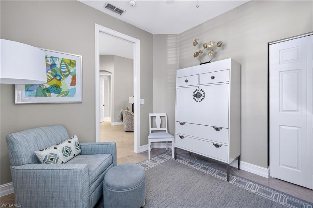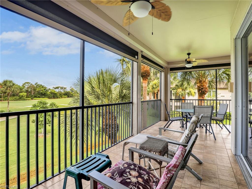 Membership Included in this amenity-rich community of Pelican Sound! Finally what you have been looking for! Exceptional turnkey furnished second floor carriage home with volume ceiling and wide open living space. Features include 3 bedrooms all with walk-in closets, plus a den and 2 full baths. Located just off the 8th fairway, offering continuous enjoyment as you relax on the wrap around lanai with Lexan sliders and watch the the golfers from fairway to putting green. Additional features include renovated kitchen with granite counters, stainless appliances, staggered rich wood cabinets with underlighting to accentuate the gorgeous decorative backsplash. Spacious primary suite with recently renovated bathroom offering gorgeous tiled shower, seamless shower door, granite counter top and more. Unique to the carriage home the door to the laundry room has been moved giving the den a much more finished look. Plantation shutters throughout and A/C replaced in 2024. If you are looking for an active lifestyle look no further: 27 holes of Championship golf, 14 pickleball, 8 tennis and 6 bocce courts. State of the art fitness center that is professionally staffed. Pelican Sound is nestled up to the Estero River with access to the Gulf of Mexico. The community offers dry boat storage, kayaks, canoes and paddle boarding, along with a shuttle boat to Lovers Key State Beach Park. Minutes from RSW International airport and surrounded by fabulous shopping and restaurants. Start Living The Dream!