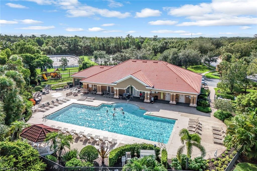 Brand new to the Rookery Pointe market is this lovely, bright, 3 Bed+Den/2 Bath+powder room, Single-Family pool home! Located on an oversized lot, the area beyond the pool is both open green space and lake with the added bonus of Sunsets as the home is West-facing! Huge volume ceilings set this floor-plan apart from most others in the community! The primary bedroom suite/bath is on the first floor along with a convenient half bath and den/office. Upstairs are 2 more bedrooms, a bath and a great office or homework nook! Newer roof and HVAC systems (2), storm windows + shutters add to the home's desirability. The open kitchen leads to a spacious partially-covered patio area for BBQ's and pool time on sunny days. X FLOOD ZONE!! (Not in a flood zone) The home is vacant and ready for your personal touches! Rookery Pointe is a beautiful gated community located in Estero, FL, nestled between Three Oaks Pkwy and Estero Pkwy. Rookery offers lush landscaping with five lakes, two preserves, a junior olympic community pool, gorgeous clubhouse, fitness center, covered and screened lanai, bbq grill, inline skate rink, basketball court, clay tennis courts, and pickleball courts.