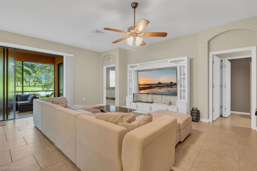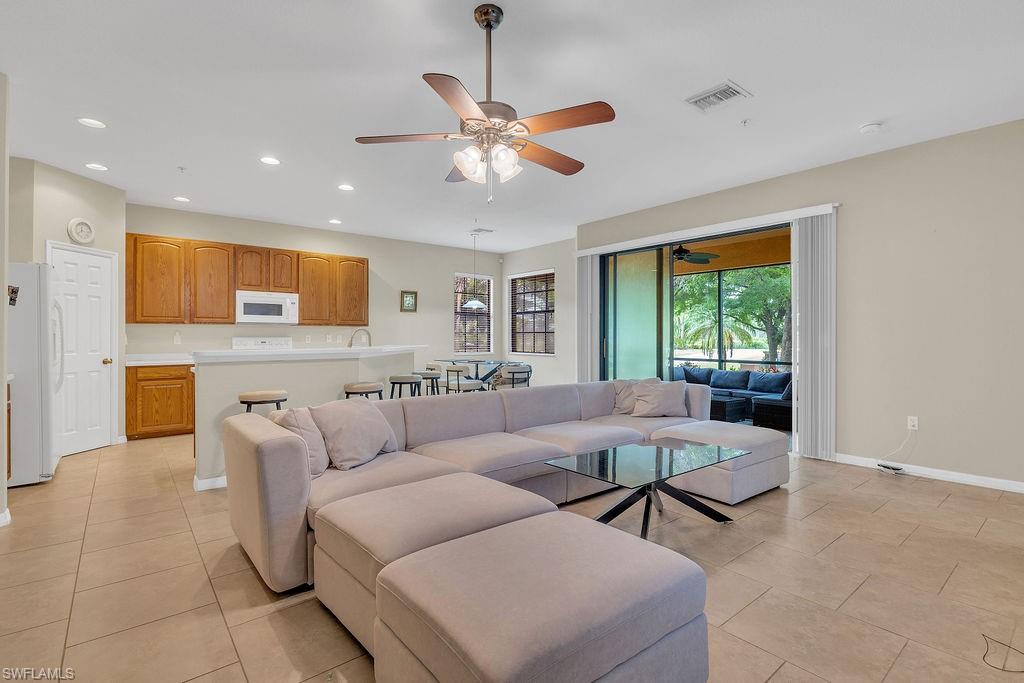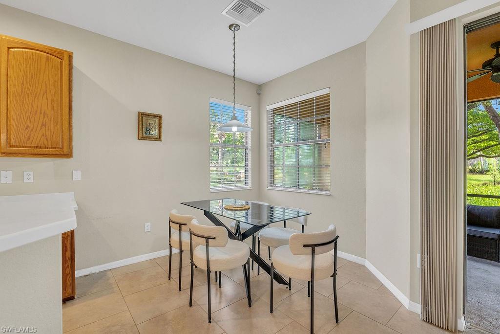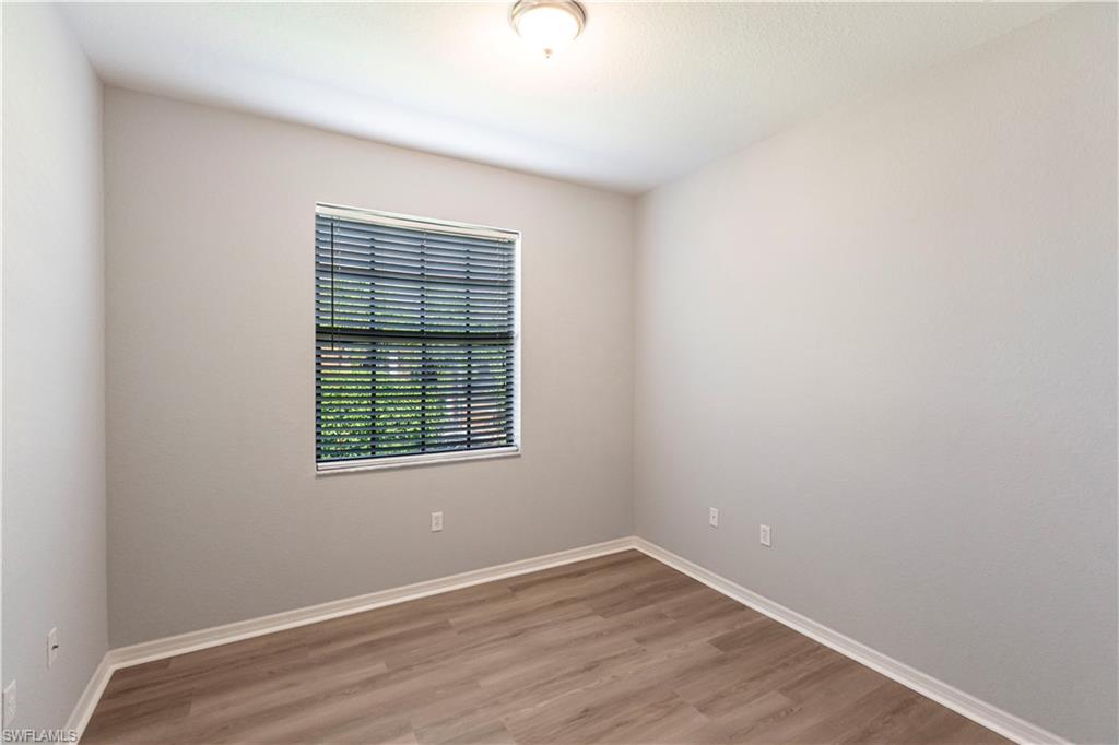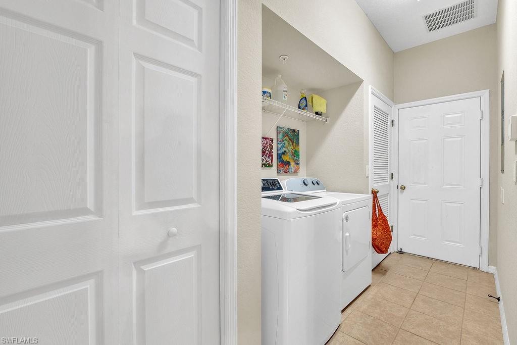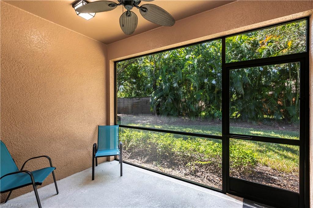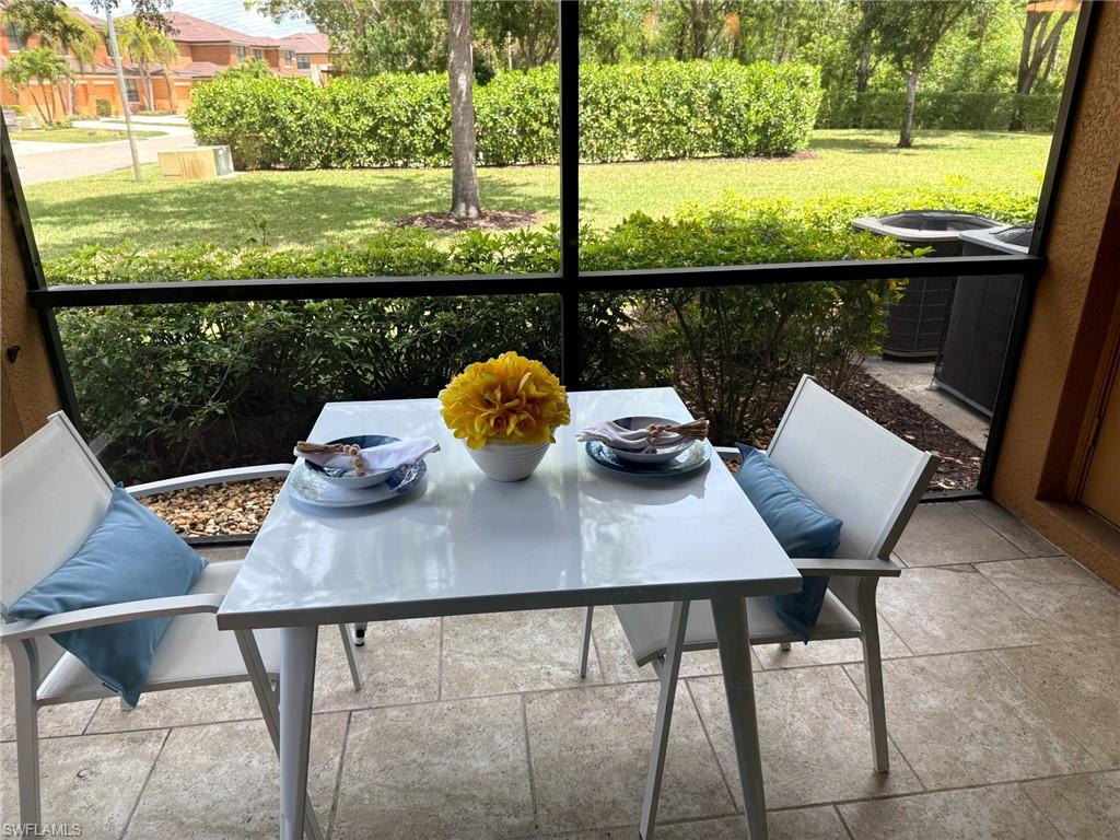 Owner ANXIOUS TO SELL and thus is PRICED TO SELL! BRING AN OFFER! Lowest Priced Condo in Terra Vista and this is a Gorgeous FIRST FLOOR condo in an "X" FEMA Zone which means you don't have to worry about any flooding and you don't have to pay for flood insurance! Also, the beauty of the FIRST FLOOR is there are NO STAIRS to climb! This meticulously maintained condo is virtually MAINTENANCE FREE with NO CARPET, just beautiful TILE and WOOD PLANK CERAMIC FLOORING throughout. Offering a split floor plan with 2 bedrooms, plus a den (which could be a 3rd bedroom), and an OPEN FLOOR PLAN with timeless wood cabinetry and granite counter tops. The kitchen offers high end Samsung appliances. The Primary Bedroom Suite is complete with a tiled walk-in shower & huge walk-in closet. Feel the peace on your lanai enjoying the birds and butterflies while overlooking the landscape views. There are new screens on the lanai and on the front door screen that prevents any bugs from entering, making it that much more enjoyable and even more private. Also, there are two roller blinds on the lanai for the ultimate in privacy. The A/C system was replaced in 2024! ELECTRIC, WATER AND CABLE ARE INCLUDED IN THE HOA! Terra Vista offers a private gated community with a relaxing community pool and clubhouse. It is located west of US-41 and north of Corkscrew Rd, so it is close to the beaches, close to fabulous restaurants, 20 minutes to RSW Airport. Just minutes to local grocery stores and shopping, to Coconut Point Outdoor Mall, and to Miromar Outlet Mall.