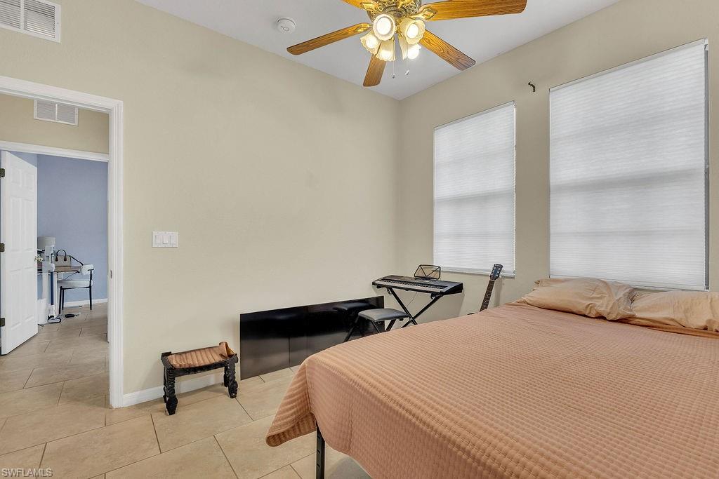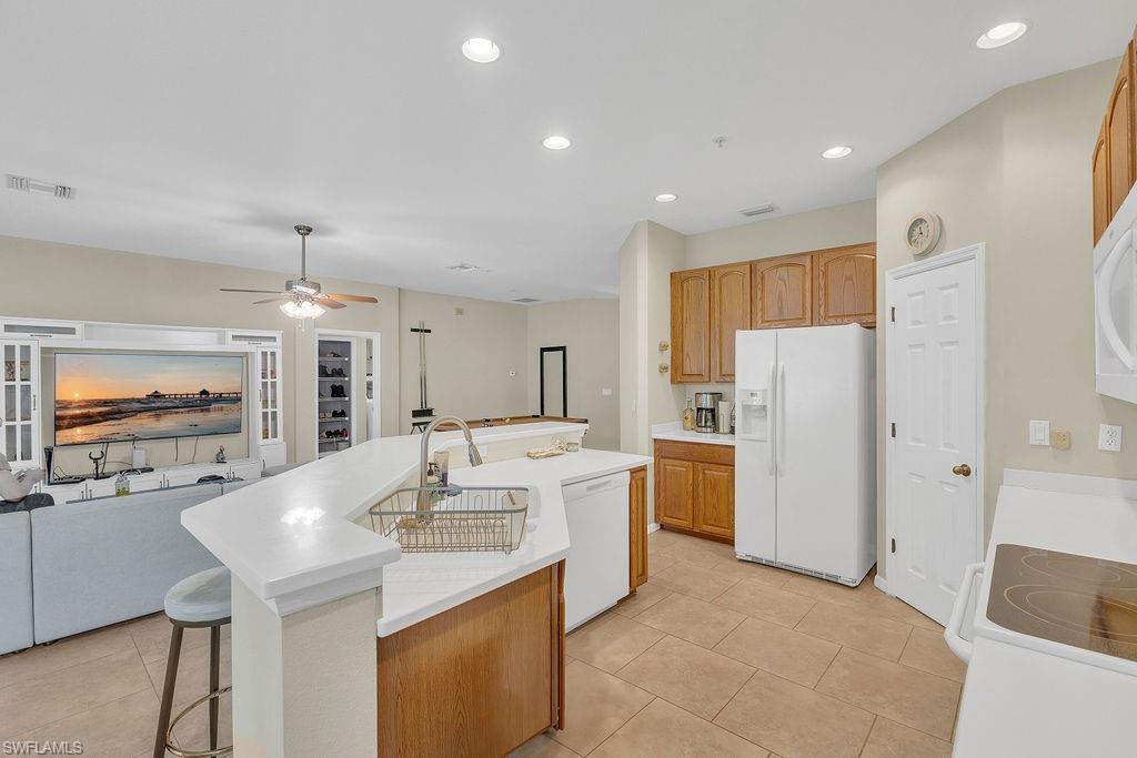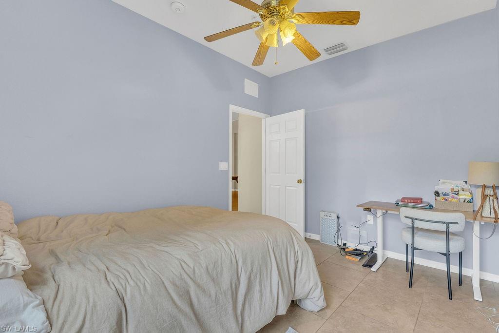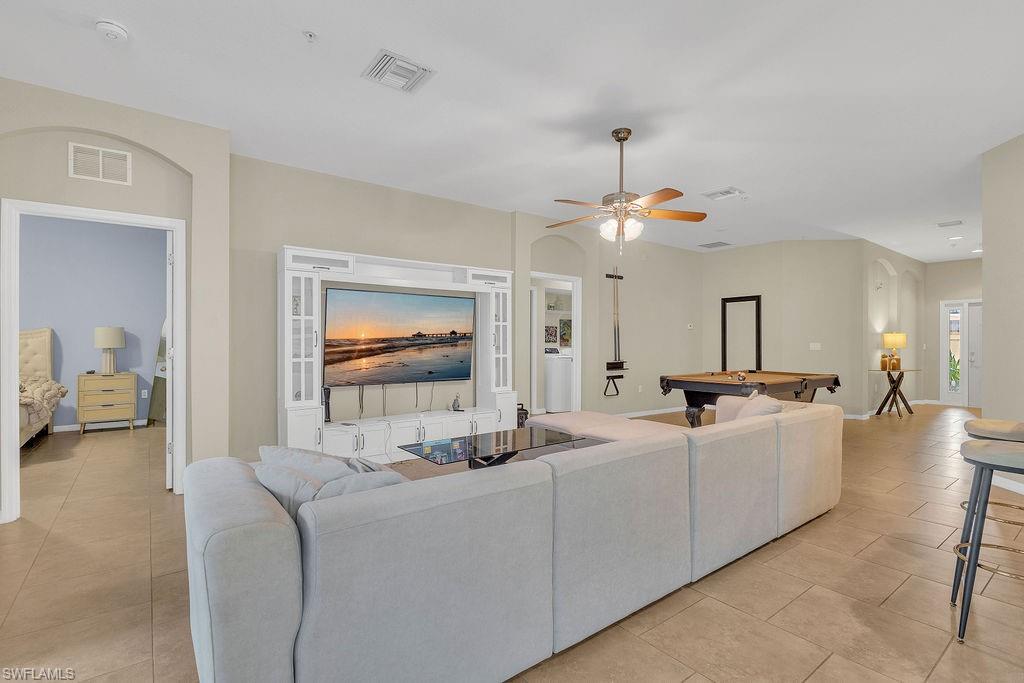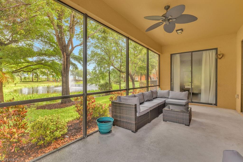 Enjoy one of the most stunning views in Terra Vista from this beautifully designed second-floor condo with southern exposure. Featuring an open floor plan, this residence offers 3 bedrooms plus a versatile den, 2 full bathrooms, and an attached one-car garage with a spacious double driveway. The large kitchen boasts ample cabinetry, sleek granite countertops, stainless steel appliances (all replaced in 2023), and a seamless flow into the living area and lanai overlooking the lake and fountain—perfect for entertaining. The expansive owner’s suite includes a luxurious ensuite bath leading into a generous walk-in closet. Upgraded with tile flooring in the kitchen and bathrooms, and luxury vinyl flooring with extra soundproofing throughout the main living areas, this home is both stylish and practical. Additional highlights include a professionally installed storage system in the garage, a new water heater (installed fall 2024), a well-maintained AC unit (installed fall 2017), and a new roof installed in 2023. Relax on the lanai and take in breathtaking lake and fountain views with desirable southern exposure. Plus, enjoy peace of mind knowing this home is situated in Flood Zone X. Terra Vista is a quiet gated community with lots of green space, a clubhouse and community pool. Conveniently located near Shopping, dining, RSW International airport and the beautiful beaches of Southwest Florida. This condo is perfect for a seasonal retreat or full-time residence. Don’t miss the chance to own this exceptional Terra Vista Condo!