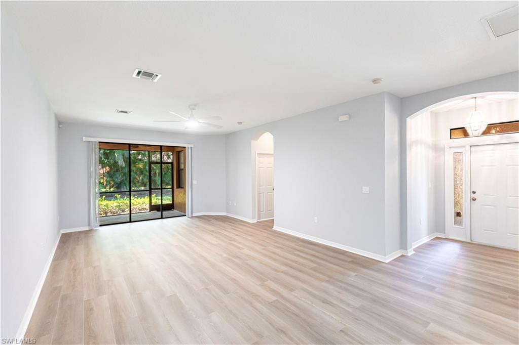 Welcome to 3705 Pino Vista Way in the heart of Estero! This beautifully maintained villa features 2-bedrooms and 2-bathrooms, along with a versatile den! This attached villa offers the perfect blend of comfort, style, and convenience with the feel of a Single-Family home. You will love your oversized attached two car garage! Step inside to find rich brown cabinetry that adds warmth and elegance to the open-concept kitchen, paired with Lifeproof Pergo flooring that offers durability and modern appeal throughout the main living areas. The split floor plan ensures privacy, with the spacious primary suite tucked away in the back of the home—featuring tranquil lake views that make every morning feel serene. The den provides flexible space ideal for a home office, reading nook, or guest room. The second bedroom and full bath are located on the opposite side of the home, perfect for visitors or family. A screened lanai offers a peaceful outdoor retreat to enjoy your morning coffee or evening sunsets. Enjoy stunning lake views from your back yard! Located in the highly desirable Terra Vista, a gated and well-kept community WEST of US-41-- yet NOT IN A FLOOD ZONE (Zone X) and has never flooded! All OF THIS with easy access to world class shopping, dining, and beaches! This villa combines privacy with low maintenance living, with no worry of exterior maintenance. Don’t miss this opportunity to own your piece of paradise in the heart of Estero!
