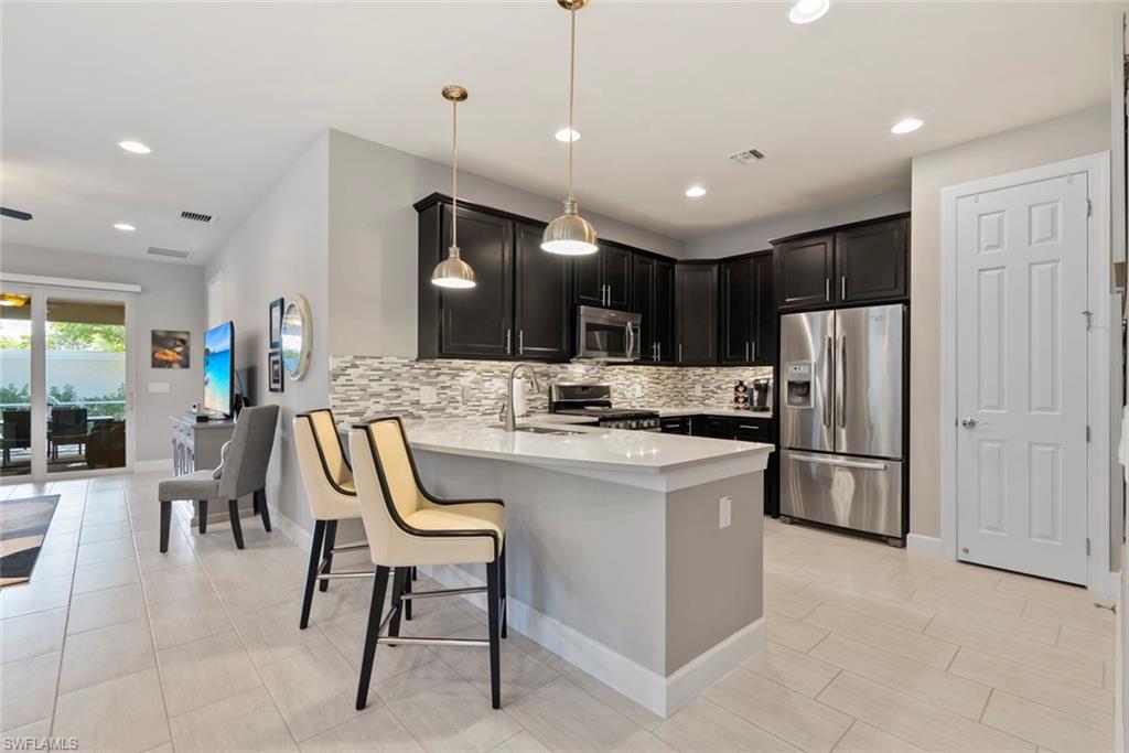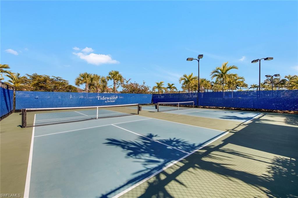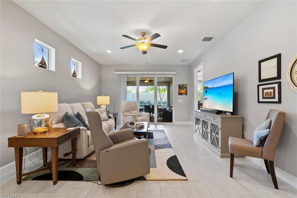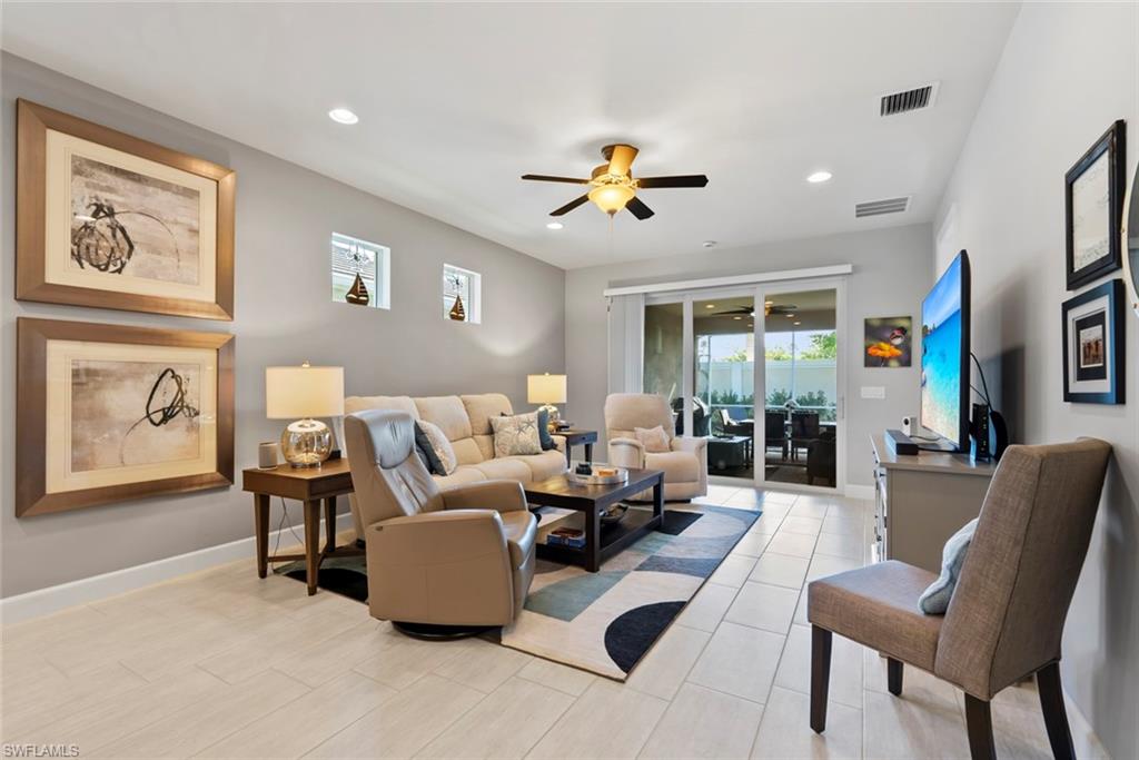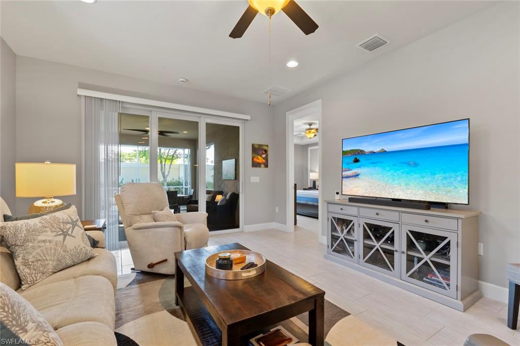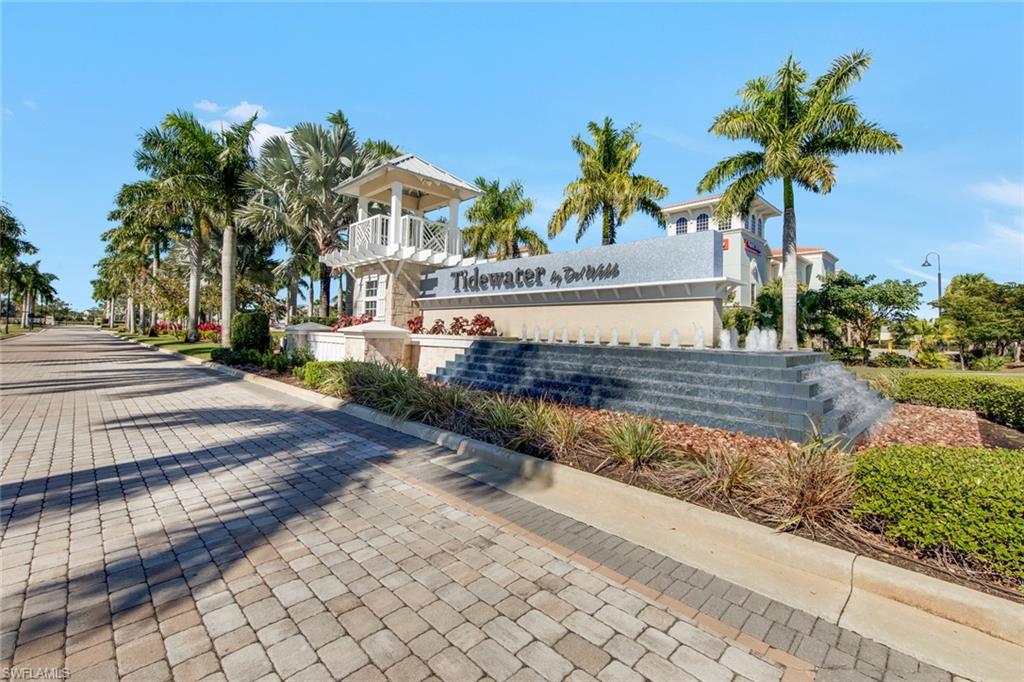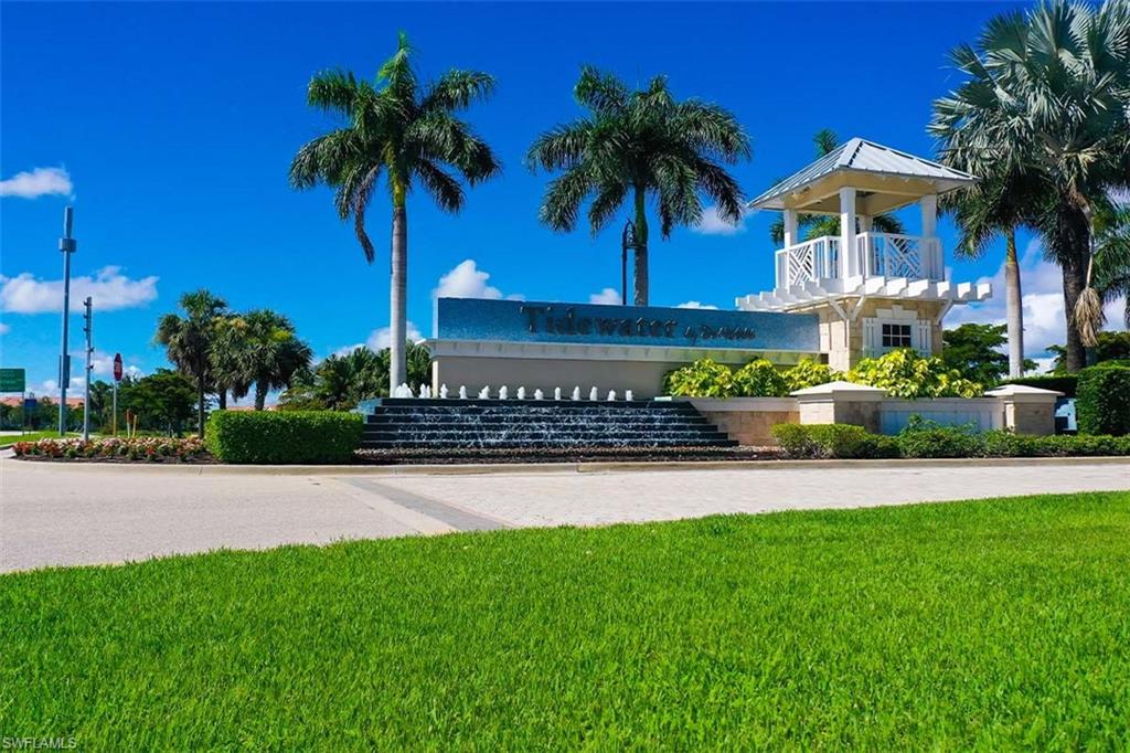Incredible opportunity! Call today to schedule your private showing of this STUNNING 2 bedroom, 2 bath, plus DEN, attached 2 car garage, villa in one of the area's premier 55+ communities ... Tidewater by Del Webb! Your new home feels like a NEW home ~ as it's been occupied roughly only 3 years since it was built! As you step inside you'll immediately notice the staggered plank tile throughout the entire home; making home maintenance incredibly easy! The kitchen is absolutely gorgeous and boasts a GAS RANGE, pantry, breakfast bar, Expresso hard wood cabinetry, glass tile backsplash, and stainless appliances. The adjacent great room, with combination dining and living areas, is light and bright with transom windows, additional recessed lighting, and sliders that lead to your screened, OVERSIZED, lanai! With upgraded dropped tray ceiling - you'll be amazed at how spacious your new primary suite feels! Other features include double sinks, walk-in shower, separate water closet and walk-in closet. Just outside the guest room is the second bath with upgraded shower complete with tile that runs to the ceiling, glass tile accents and linen closet. With pocket slider that closes off the guest room and bath, essentially making it an additional en suite, guests will love the privacy! The den, closed off by French doors, could easily be utilized as a third bedroom, or could be the perfect space for home office, gym or craft room. The expansive lanai offers a secluded feel with privacy wall in the back additional and an additional privacy wall on the side; making it the perfect place to entertain. Plus, it's already pre-plumbed for a summer kitchen and offers a natural gas line for your grilling needs. You'll also appreciate the impact windows and doors for extra efficiency! And the community? Second to none! Del Webb's Tidewater offers a 13,000 sq ft amenity center that includes a resort style heated pool (with lanes for laps), poolside cabanas, BBQ grills, clubhouse, fitness center (with a myriad of classes), tennis, pickleball, and bocce courts, dog park, spa, library, and business center. From games, clubs and fitness classes, to excursions, educational lectures and social gatherings, Tidewater has something for everyone! Copy/follow this link to view their community calendar! #!calendar. It's true what they say ~ location, location, location! Here you 1.5 miles from the renowned Miromar Outlets, only 3 miles to Gulf Coast Town Center, and 5.5 miles to Coconut Point Mall! At Tidewater you are in the heart of what SW Florida has to offer ... not only endless sunshine, but also incredible access to a myriad of shopping, dining and healthcare options. Plus, only 8 miles from RSW International Airport so easy fly in-fly out! For beachgoers, Barefoot Beach is a short 8 mile drive. This isn't just the home you've been looking for, it's your new lifestyle. Call today!
