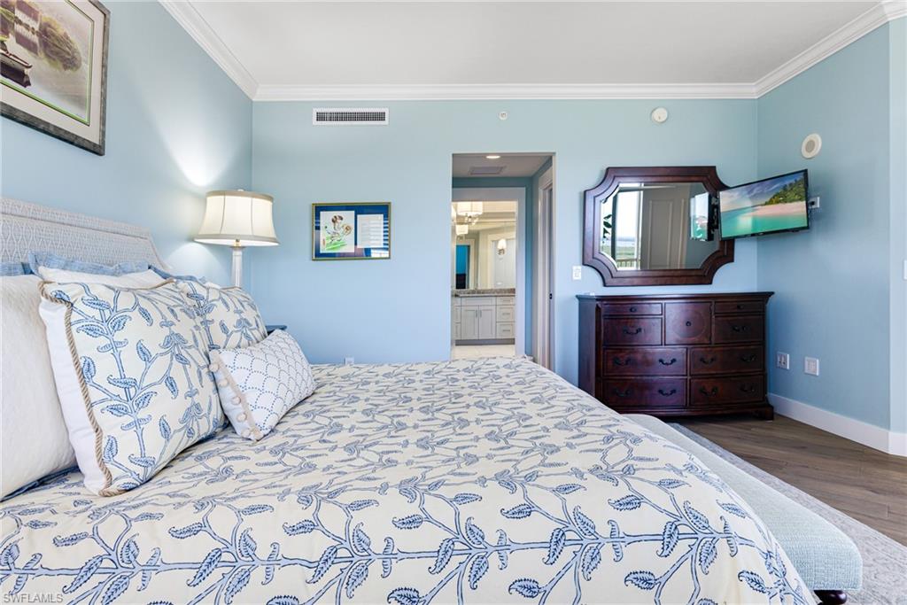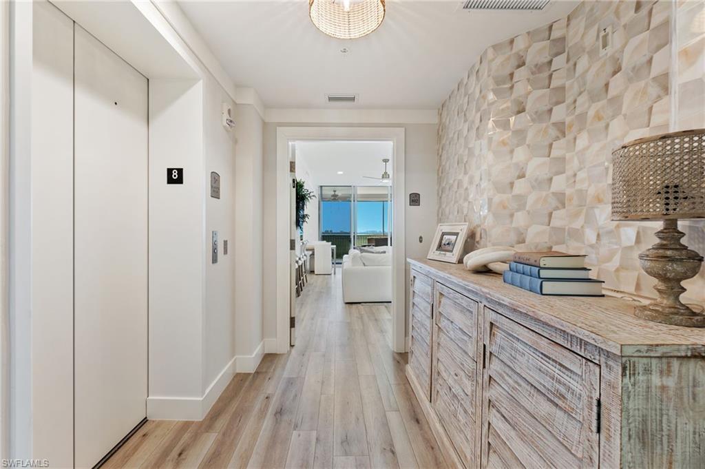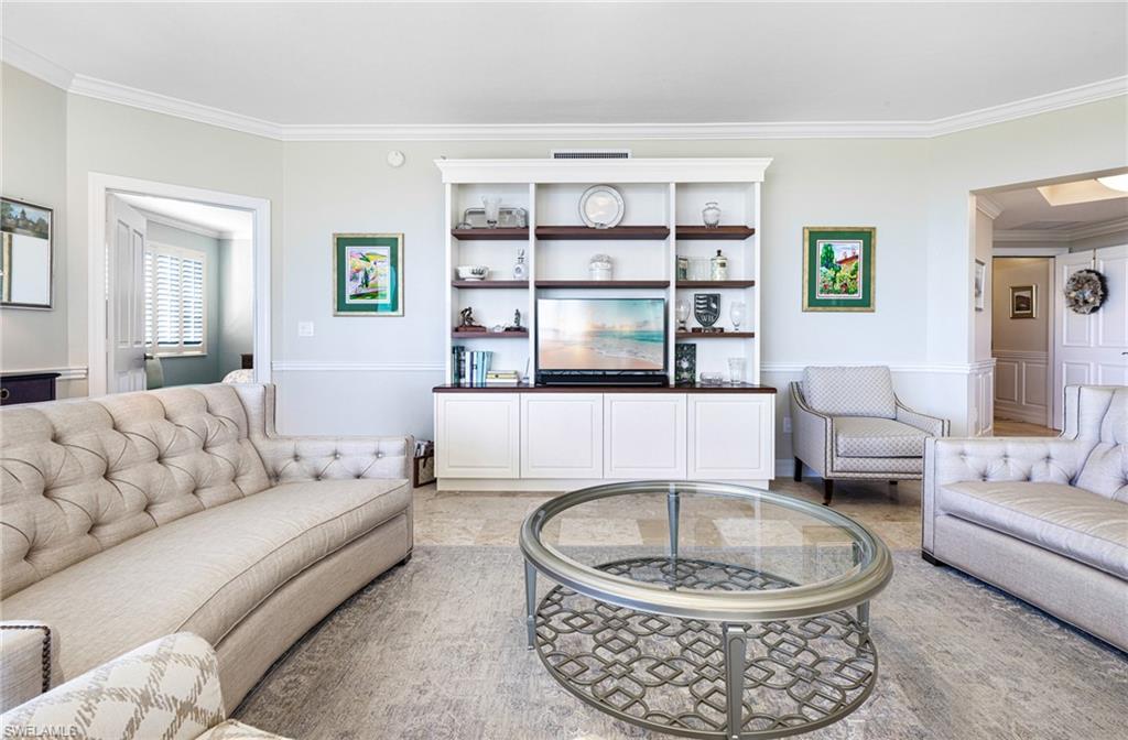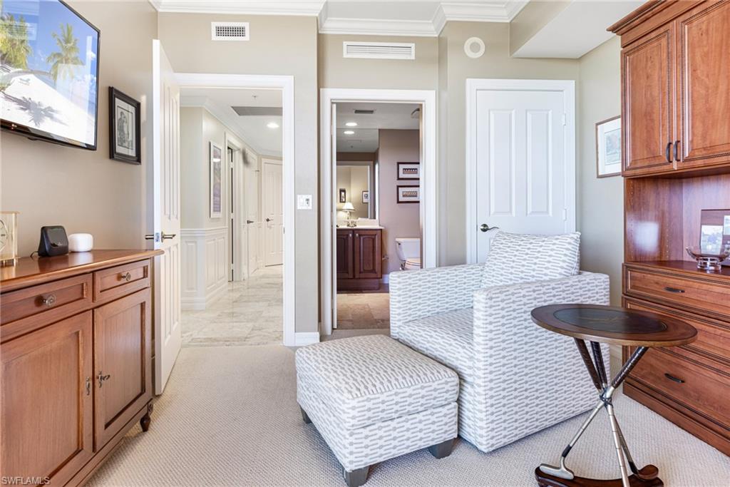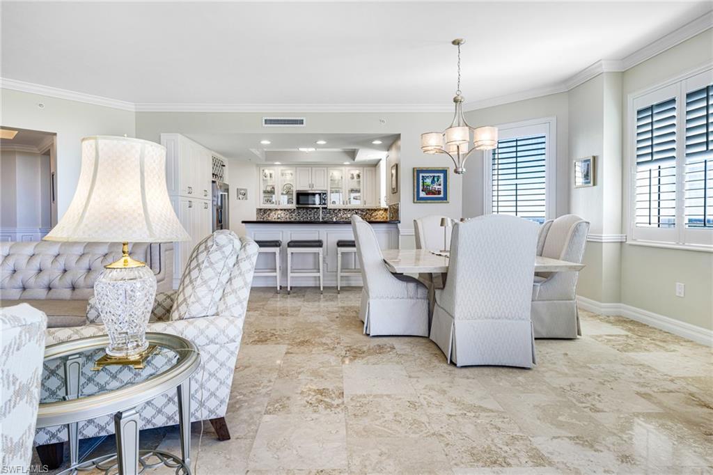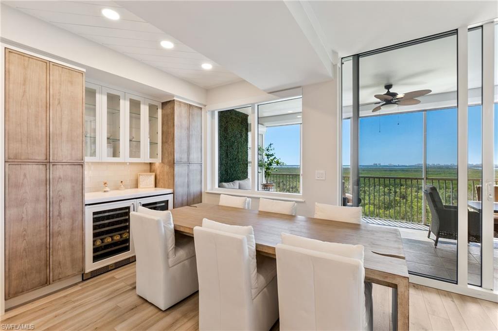 Experience elevated coastal living in this beautifully appointed 3-bedroom, 3-bath residence on the 10th floor of Jasmine Bay South at West Bay Club. Offering 2,150 square feet of refined comfort, this home showcases beautiful wood flooring throughout, tray ceilings, crown molding, recessed lighting, and custom window treatments. The gourmet kitchen features European-style wood cabinetry, granite countertops, and new high-end stainless-steel appliances. The dining area offers custom cabinetry for additional storage plus dual wine refrigerators below the bar area – perfect for entertaining. The third bedroom can be an office area or double as a 3rd bedroom with built-in Murphy bed on the south wall. The spacious great room opens to a private balcony with sweeping, unobstructed views of the golf course, Estero Bay, and the Gulf—an ideal backdrop for morning coffee or evening sunsets. A private elevator entry enhances the sense of exclusivity, while hurricane shutters provide added peace of mind. Jasmine Bay residents enjoy an array of luxury amenities, including an infinity-edge pool, hot tub, private cabanas, gas grills, guest suites, a clubroom, and a fitness center. West Bay Club further elevates the lifestyle with its newly built Beach Club on the Gulf of Mexico, complete with restaurant/bar and chair/towel service. Additional community amenities include the renovated Bay House with resort pool and Aqua Café, 8 clay tennis courts, a Technogym fitness center, pickleball complex, bocce, dog parks, a 1.5-mile nature trail, and the River Park with boat launch, kayak/canoe access, fishing pier, and more. Optional memberships are available for the private 18-hole Pete & P.B. Dye championship golf course and clubhouse. This exceptional residence offers luxury, lifestyle, and breathtaking views in one of Southwest Florida’s most sought-after communities.