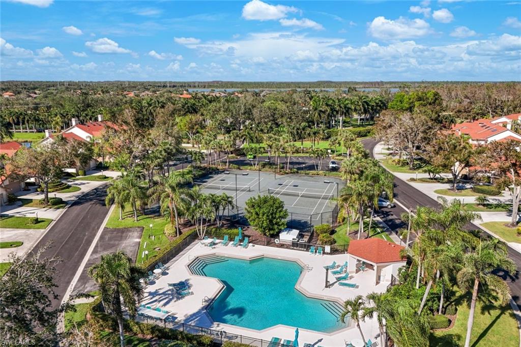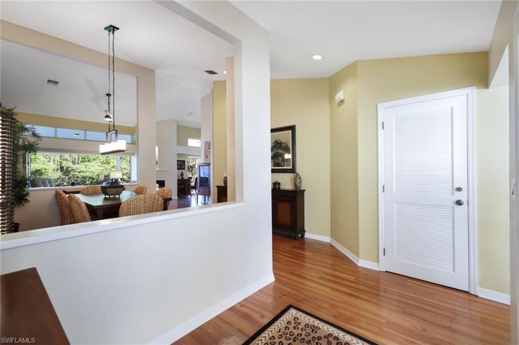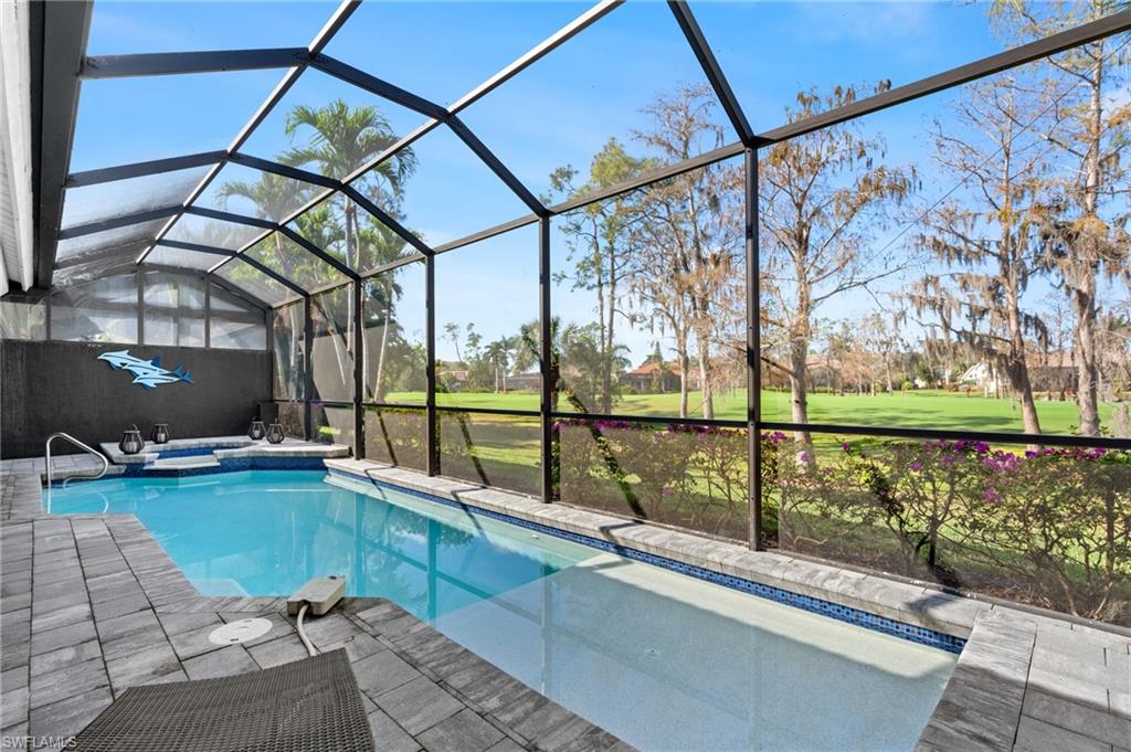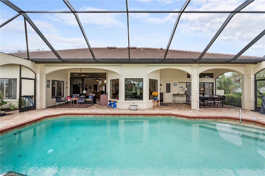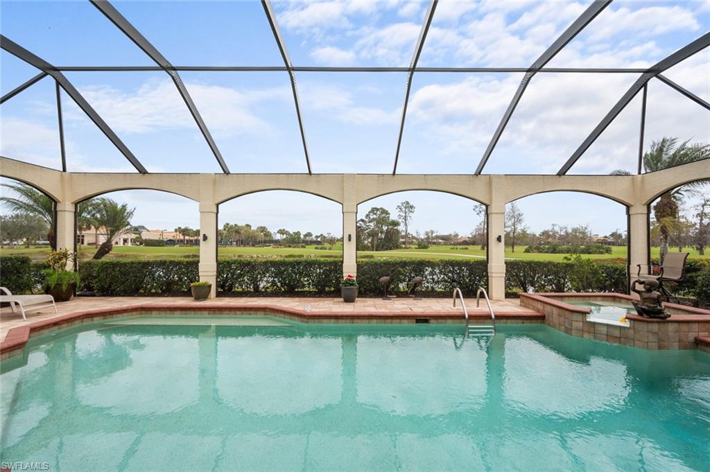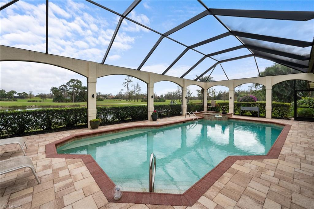 This 3 bedroom, 3 full and 1/2 bath attached villa pool/spa property lives like a single family home. A few updates are the beautifully engineered wood flooring throughout and the refurnished pool/spa. A new pool heater was installed in Dec. 2024. Exterior freshly painted in the spring of 2025. The new roof was installed in 2018. The kitchen stone backsplash is neutral in color and was also installed under the breakfast bar for a nice accent. The property is being sold turnkey for the convenience of both sellers & buyers. Being situated on the 14th fairway of the Arnold Palmer Signature 18 hole golf course provides a beautiful view of the fairway and approach to the green. The 1/2 bath is located on the lanai and serves as a pool bath for convenience. Along with the golf course, Wildcat Run offers tennis, pickleball, bocce and the state of the art fitness center which is fully staffed by a professional certified trainer. Two restaurants on campus allow you to enjoy lunch and dinner in the Grillroom with indoor/outdoor seating or dinner in the Clubhouse for a more formal atmosphere. Outdoor gathering is a popular spot when meeting up with friends after your day of activities. Wildcat Run is convenient to 3 large shopping malls, fine & casual dining, SWFL International airport and white sandy Gulf beaches.