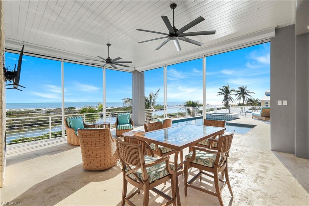 An exclusive & spectacular beachfront home located on the tranquil south end of Fort Myers Beach offers unrivaled panoramic gulf & beach front views stretching from Naples to Sanibel on clear days & evenings serving as a perfect backdrop of luxury & privacy. Positioned on a rare section of beach w/ultra-private backyard yet, from the home, you have direct access to the sandy beach & gulf waters. Featuring 6 spacious ensuite bedrooms or 5 ensuites & a den w/full bathroom, the residence boasts 10’ to 15’ high ceilings, stunning hardwood & tile flooring, fully color-coordinated accents, an open 3-tiered floorplan drawing in natural light throughout plus, an elevator that provides easy access to all levels, ensuring convenience throughout the home. The chef-inspired kitchen is equipped with top-tier appliances, dual ovens, dual dishwashers, large walk-in pantry, wet bar, multiple dining options from casual to formal both inside & outside, ideal for both everyday living, entertaining & those special gatherings. Step outside to the expansive patio, where you’ll enjoy a full outdoor experience from lounging, sunbathing, dining & more. Complete outdoor kitchen, fireplace, infinity pool & spa, all designed for taking full advantage of the mesmerizing sunsets & living the ultimate beach front lifestyle. Designed with comfort, efficiency & luxury at top-of-mind, this home features high-impact windows & doors, electric Clear Choice Storm Shutters, motion-senor automated sliders that open up to the beach, a garage that follows the footprint of the home to accommodate 6+ cars, double laundries (main & upper level) & Lutron lighting system. Additional highlights include two new A/C systems (2024), on-demand gas water heaters, a 1,000-gallon underground propane tank, a MyQ WiFi-controlled garage & beautiful, irrigated landscaping. A short drive, bike ride or trolley connection can take you to Lovers Key State Park, a variety of local marinas, various local shopping & dining venues as well as easy access to a number of public boat launches. The trolley-stop is just across the street. This home is perfect for enjoying the finest in beachfront living as well as both current & future local attractions as investment in the community continues to unfold.
