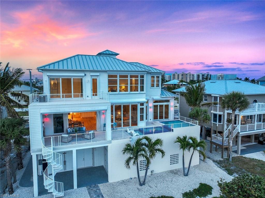 Beautifully renovated direct beachfront home on South Estero Island with breathtaking Gulf views! Sits on a rare stretch of beach with an ultra-private backyard with no passersby to be seen, providing optimal privacy. This 4 bed/4.5 coastal delight has been completely remodeled and features a NEW METAL ROOF, Generac whole house generator (2021), 2 new HVACS (2020), new instant water heater (2020), hurricane impact windows/sliders throughout, and new interior staircase. Step outside onto your open-air wraparound balcony and enjoy endless views of the turquoise waters of the Gulf of Mexico. Stunning chef’s kitchen contributes to the wide-open floor plan and offers custom-built white cabinetry, gorgeous white quartz countertops, waterfall island, walk-in pantry, and new high-end Jenn-Air appliances (2020) including double ovens and induction cooktop. The spacious primary bedroom is a tranquil haven with floor to ceiling windows/slider to fully indulge in the Gulf views and has a spa-like bath with dual vanities, large jetted soaking tub, and separate walk-in shower with multiple shower heads. The top floor is perfect for a private guest wing or an extra bonus room with an ensuite bathroom and top floor sun deck for picture-perfect sunsets over the Gulf. Just steps from the beach, your outdoor oasis awaits — featuring a fenced-in heated saltwater pool and spa, along with a brand-new summer kitchen ideal for poolside dining and sunset entertaining. Other features include a Lutron lighting system, Savant sound system upstairs, tile flooring, and coffered ceiling details. This is a fantastic vacation home or investment opportunity located in a weekly rental zone allowing for maximum rental income if desired! Perfectly situated on the coveted South-end of Estero Island near Lovers Key, Bonita Beach & the South bridge to the mainland with dining and shopping walking distance.