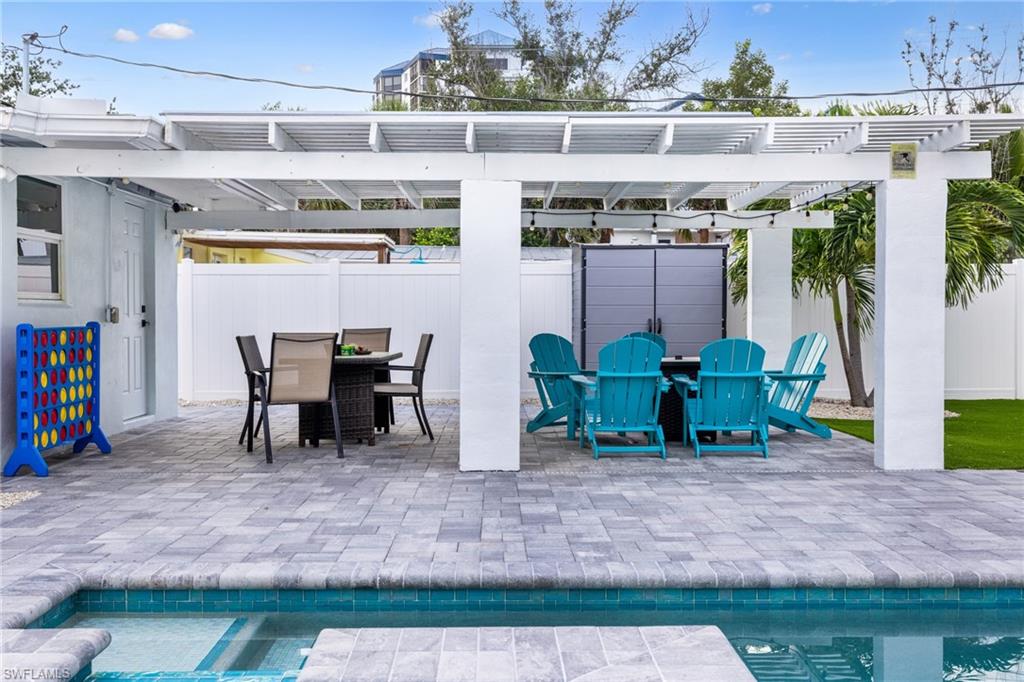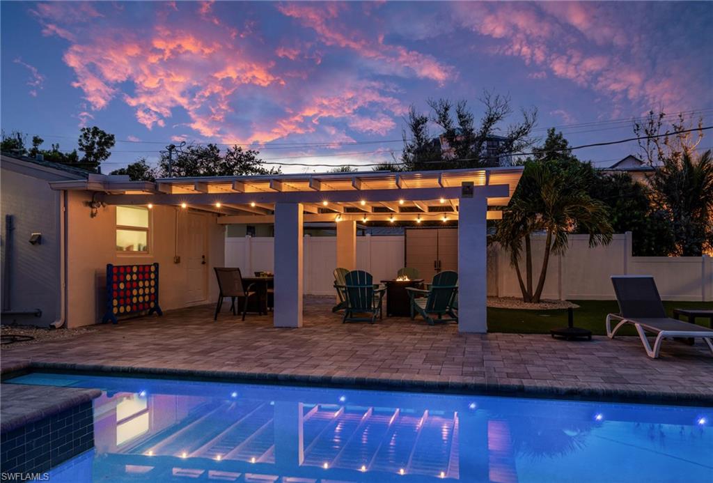 Welcome to our beautiful property on Fort Myers Beach. WHY THIS PROPERTY IS SPECIAL: INCOME PRODUCING GUEST QUARTERS AVERAGING UPWARDS TO $5,500 MONTHLY, WHILE OWNERS RESIDE IN THE HOME, OFFERING DEEDED BEACH ACCESS, ALL NEW IMPACT RESISTANT DOORS & WINDOWS, HEATED POOL, NEW ROOF, NEWLY CONSTRUCTED TIKI HUT, TASTEFUL PAVER POOL DECK AND FULLY FURNISHED TURNKEY HOME! Centrally located, mid Island location next to Publix, full-service marina and restaurant with relaxing back bay views. Convenient 5-minute walk to a deeded beach access and spectacular Gulf sunsets. Charming beach style home offering no HOA fees in a highly desirable rental community. Home offers amazing 3 bedrooms and 2 bathrooms on the main floor and a single bedroom and bathroom in the grandfathered guest quarters. This impressive property is offered fully furnished turnkey, with all new furniture, appliances, A/C system, hot water tank, new roof, 2 bay garage with a 50-amp outlet for a car charging station. All new impact resistant windows, upper and lower deck area, all new heated pool and newly constructed tiki hut on a tastefully pavered pool deck. The yard is completely fenced in for some privacy while enjoying your time outside. Call today for your private showing, you will not be disappointed. This property is in absolute pristine condition and move-in ready. Did I mention an endless supply of scenic and incredible sunsets?
