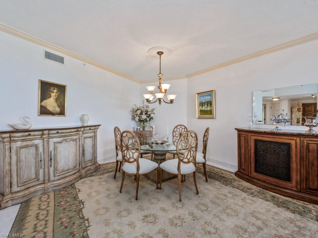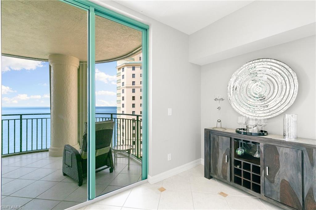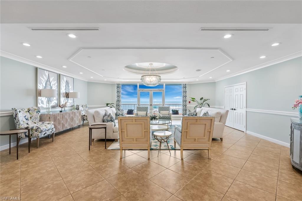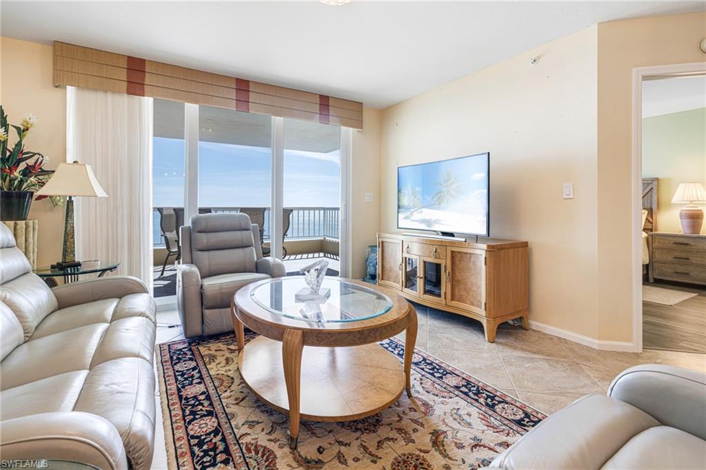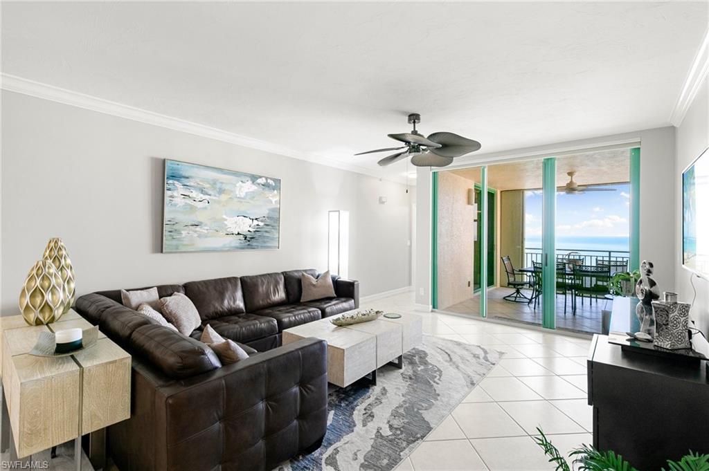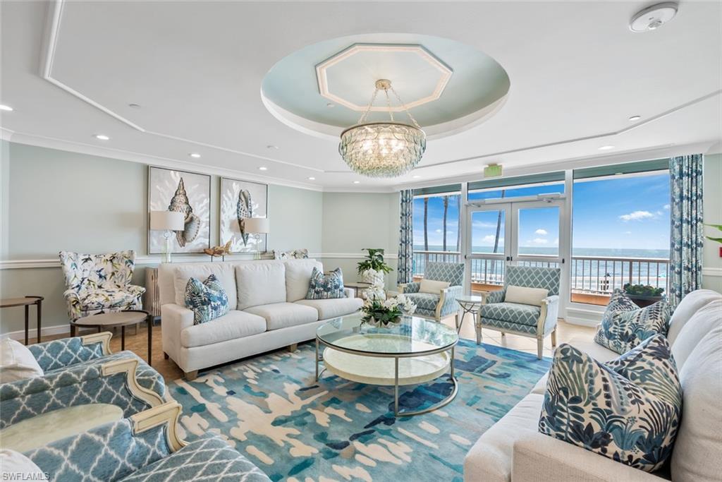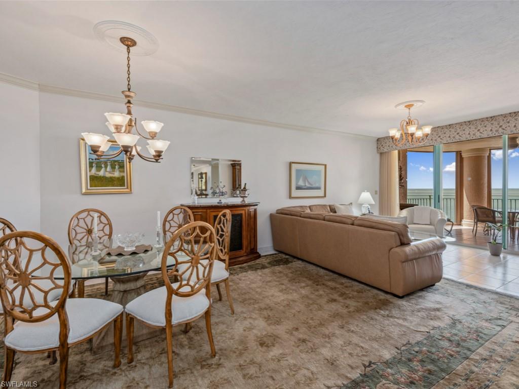 Experience unparalleled luxury and opulence in this beautifully appointed two-bedroom, two-bathroom plus flex room condo in Merida at Cape Marco. Situated on the 10th floor, this residence offers sweeping and boundless views of the Gulf of America, perfect for watching boating by day and gorgeous Florida sunsets. The condo is offered turnkey/furnished and is the lowest-priced unit in the building as of this listing, providing a rare opportunity to own in one of Marco Island's most coveted communities. The spacious open floor plan seamlessly integrates the living, dining, and kitchen areas, making it ideal for both relaxation and entertaining. The kitchen has been thoughtfully updated with wood cabinetry, granite countertops, recessed lighting, and a tumbled marble mosaic backsplash. The breakfast bar allows for casual dining and conversation. Stainless steel appliances, including a slide-in range, add a touch of modern elegance along with large block tile laid on the diagonal, crown moldings, and great natural light, creating a warm and inviting atmosphere throughout. High-impact resistant glass doors and windows provide security, quiet, and peace of mind. A flex room segregated just off the entry offers a versatile space that can be used as a guest bedroom, den, or study—perfect for accommodating your visitors or used as a peaceful retreat. The primary bedroom with views of the Gulf provides an en suite bathroom featuring a soaking tub, separate shower, twin vanity, and a walk-in closet. The split floor plan ensures privacy, with a generous guest bedroom with plenty of space for guests or family members. Additional features include in-residence laundry, extra storage space, and garage parking for added convenience. An ample balcony extends the living area outdoors, allowing you to enjoy the breathtaking Gulf views and the tropical surroundings. Merida at Cape Marco offers resort-style amenities that include a tropical beachfront heated pool, a well-equipped fitness room, Har-Tru tennis courts, and a social room, while the guard-gated entry and on-site management provide peace of mind. Bring your furry friends along with approval from the association to enjoy this incredible lifestyle. Located at the south end of Marco Island, this property offers a private exit to a beach access walkway and is within walking distance to the island’s finest dining, shopping, and entertainment. Don’t miss the chance to own this exceptional condo that combines modern luxury with relaxed island living. With its stunning views, elegant finishes, and unmatched location, this property defines coastal living at its finest.