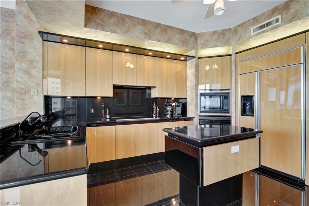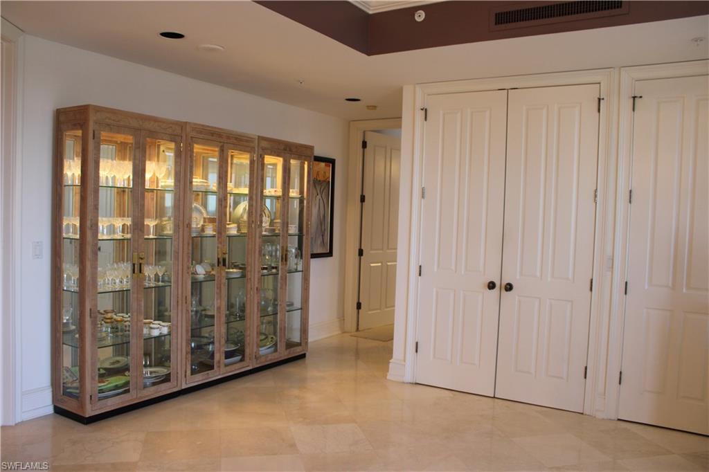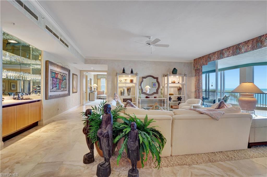 Experience the pinnacle of coastal living in this stunning three-bedroom, three-bath beachfront residence in Marco Island’s prestigious Riviera, located within the exclusive Hideaway Beach Club. Enjoy endless vistas of the Gulf of America and the Marco River from this recently renovated 4,050 sq.ft. condo, crafted with top-notch materials, superior craftsmanship and meticulous attention to detail. The state-of-the-art custom kitchen is a chef’s envy with features that include Ultracraft frameless lacquer-finished cabinetry, upper-level granite countertops, a prep island with pendant lighting, a six-seat breakfast bar with under-counter wine cooler, ice maker and beverage drawers. Appliances are all top-tier, including a Pro Series 48” Sub-Zero glass-front refrigerator with additional refrigerator, freezer, and ice maker drawers and an advanced water filtration system. The 36” convection oven, 36” induction cooktop, microwave, warming tray are all made by Wolf complimented by an illuminated vented exhaust hood, a Bosch dishwasher, farmhouse sink with Kinetico RO filtration system and a large walk-in pantry to complete this exceptional culinary space. Entertain guests in the formal dining area or on the adjacent screened loggia, perfect for morning coffee or evening relaxation enjoyed as either open-air or air-conditioned space. The main living areas showcase large-format travertine flooring, LED recessed lighting, plantation shutters, and designer chandeliers paired with modern ceiling fans for a refined coastal ambiance. Wake-up to breathtaking Gulf views from the primary suite, complete with a richly appointed en suite bath featuring dual vanities, a spacious walk-in shower, a private water closet with commode and bidet and a custom-fitted dressing room with extensive closet cabinetry. The guest suite, privately situated from the main living areas, offers its own en suite bath, walk-in closet, and private terrace. The third bedroom, currently serving as an office, enjoys panoramic Gulf views, sliding glass door entry to an expansive 577-SF terrace and easy access to the third full bath. The terrace, which can be enjoyed open-air or air-conditioned, includes a summer kitchen and leads to an extraordinary 711-SF outdoor patio, ideal for large gatherings or sunset entertaining. The condo is equipped with electric shutters, two (2020) A/C systems, two water heaters, an assigned Level-2 parking spot, a dedicated golf cart space, an extra owner garage space and two large storage closets. Hideaway Beach Club is a premier Southwest Florida beachfront community, offering a world-class lifestyle. Abundant amenities include a private executive golf course, a newly renovated beachfront clubhouse, a new wellness and fitness center, on-site formal dining room, ballroom, Sunset Lounge, and Sand Bar cafe. Residents also enjoy Har-Tru tennis courts, pickleball, bocce, and miles of nature trails through lush coastal preserves and a pristine beach. Make it yours!
