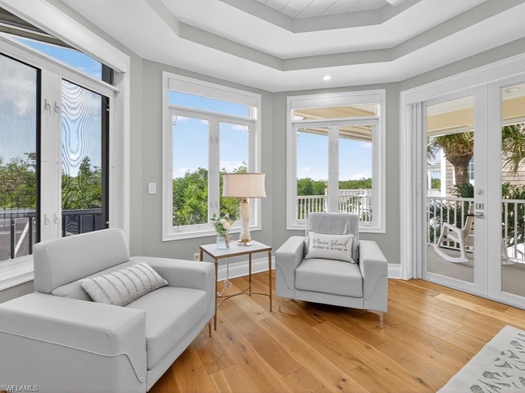 An architectural masterpiece, this Frank Lloyd Wright-inspired estate is a one-of-a-kind sanctuary, seamlessly blending modern luxury, breathtaking design and panoramic natural beauty. Spanning over 4,600 square feet under air, this three-story marvel is in the exclusive Hideaway Beach community, offering unparalleled privacy on a rare lot with no neighboring homes on either side. Designed to bring the outdoors in, the home features floor-to-ceiling glass walls and wraparound balconies, creating a seamless flow between the stunning interiors and the breathtaking surroundings. Starlike skylights on each floor cast a soft, ambient glow, accentuating the home's timeless architectural elegance. This recently updated residence boasts four bedrooms plus a den and four beautifully appointed baths plus a first-floor media room. The chef’s kitchen is a showpiece, featuring a gas stove with warming oven, new Wolf appliances and sub-zero refrigerator with refrigeration drawers! An eye-catching blue glass backsplash with luxurious Caesar stone quartz countertops make this kitchen breathtaking complete with the Star-like skylight above! A chef's dream come true! Italian white Carrara marble floors add an air of sophistication, flowing throughout the expansive living spaces. The updated bar area with an oversized wine cooler makes entertaining effortless, while the open dining space showcases mesmerizing panoramic views. Dual laundry rooms, one in master bath and one in second master bath, provide ultimate convenience. The huge five-car garage offers ample space for car enthusiasts and extra space for Golf cart! Outside, the resort-style pool and spa create a private oasis for relaxation. The crown jewel of this extraordinary home is an incredible rooftop deck that offers un- parallel 360-degree views of Marco Island. From this exclusive vantage point, you'll never miss another sunrise or sunset, with breathtaking beach and gulf views stretching as far as the eye can see. A masterpiece of design and luxury, this home is more than just a residence, it’s an experience, an invitation to live in harmony with nature while enjoying the finest in modern living. * All windows may not be Miami Dade Impact windows*