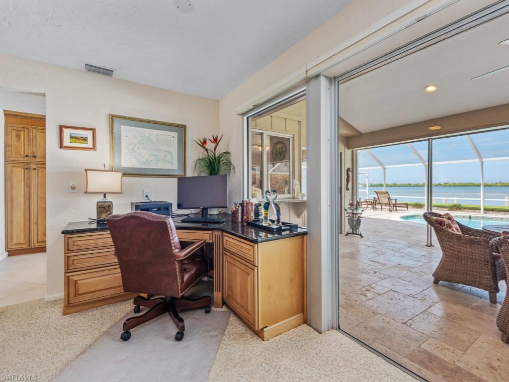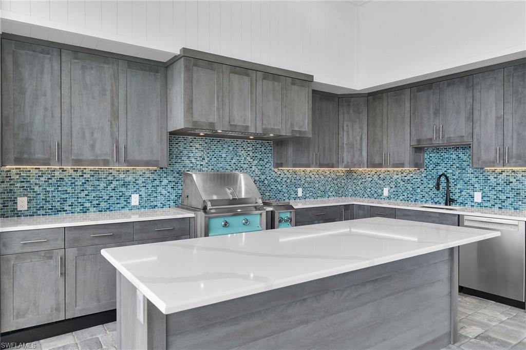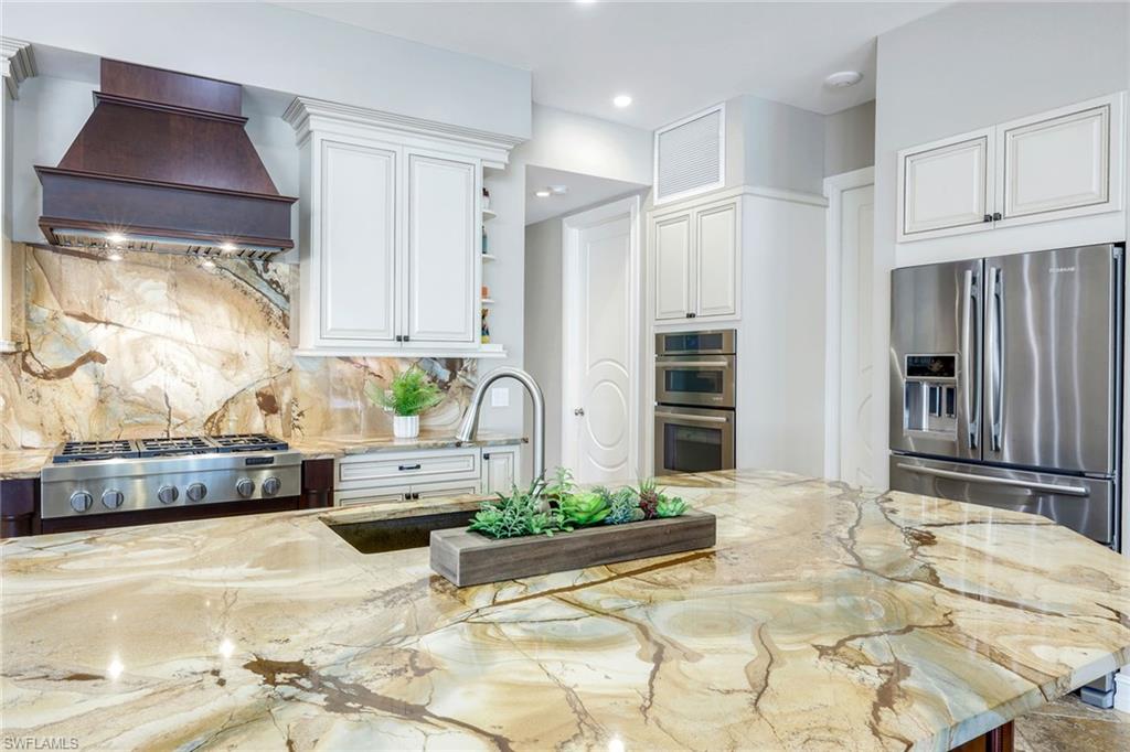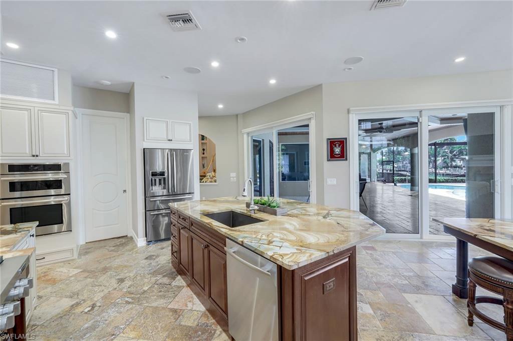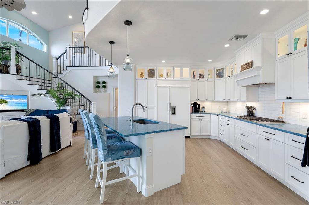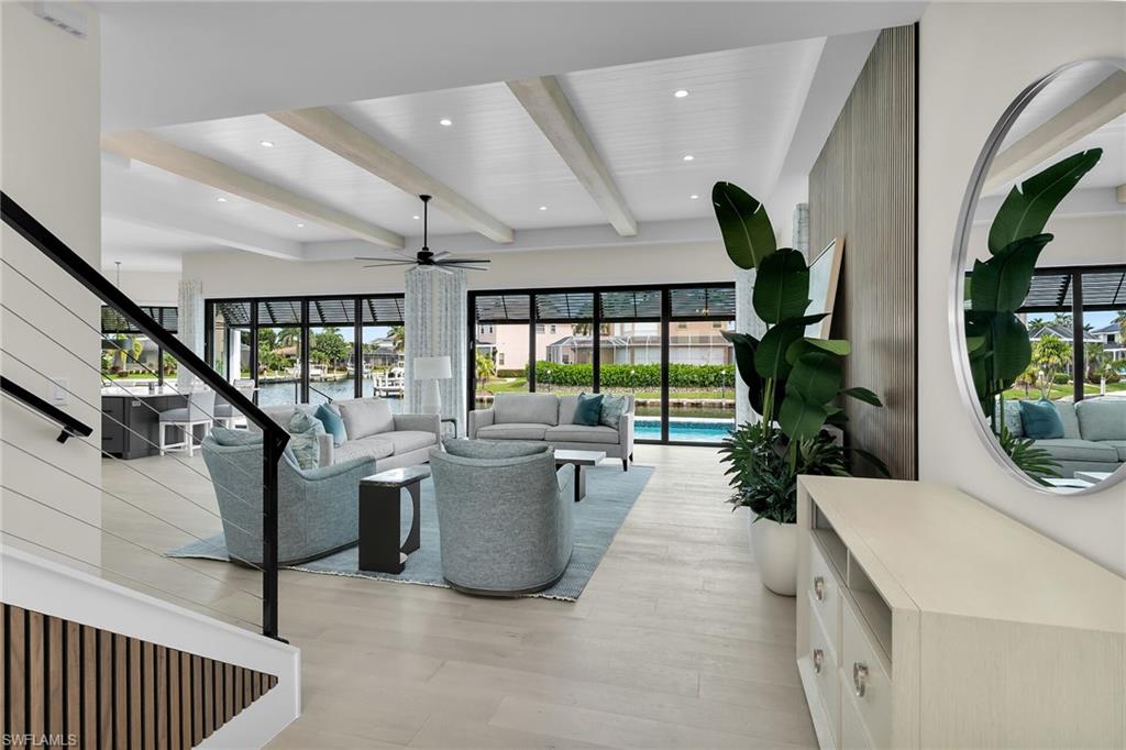 This newly updated home on an oversized water direct-gulf access estate lot boasts six bedrooms, three baths, and a spacious den with an open concept living area. The well-equipped designer kitchen features Cambria quartz countertops, a center island with a waterfall edge, contemporary white and navy blue cabinets, custom lighting and stainless steel appliances. The primary suite, designed to resemble a spa, includes dual sinks with a makeup vanity, a standalone tub and shower and ample space for relaxation. The lanai area offers a separate pool and spa, equipped with a new dual pool pump, heater and Aqualink system. Additionally, the estate features a new upgraded metal roof, new extra high seawall, new oversized 14,000-pound boat lift capable of accommodating a 40-foot boat, a new water heater, new upgraded air-conditioning systems and ductwork, a new screen enclosure, attic insulation, impact windows, entry door and impact garage door. Notably, the home is being sold furnished, providing potential buyers with a hassle-free move-in experience.