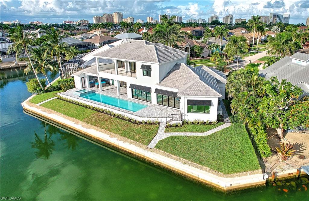 Located in the exclusive Marco Island Estates. This magnificent 3-bedroom plus den, 3.5-bath, with oversized garage, circular drive lined with Royal Palms and exquisite landscaping. Situated on nearly half an acre with 147 feet of prime waterfront, this exceptional Divco custom designed residence offers over 3,800 square feet under air and more than 4,000 total square feet of exceptional living space. The spacious home features soaring volume ceilings enhanced by exquisite custom moldings and features throughout, creating an atmosphere of elegance. The gourmet kitchen serves as the heart of the home, highlighting custom cabinetry, a generous center island with breakfast bar, and a complete suite of stainless-steel premium appliances and a large pantry. The luxurious master suite features a spacious bedroom with private sitting area, two large, oversized closets and master bathroom with dual vanities, soaking tub, and separate shower. Home has separate formal dining room for entertainment and a breakfast area with bay view. Living room and family room have fantastic water views and open to an impressive lanai with even better water views, multiple seating areas and resort style pool and hot tub. Covered lanai extends the entire length of the home, enjoy year-round sunshine, spectacular sunsets, continual parade of boats, and many playful dolphins to watch. Boating and fishing enthusiasts will appreciate the private marina featuring three boat lifts, including two 16,000-pound lifts for larger boats and one 8,000-pound lift for smaller boats or jet skis. Great fishing off the docks or the deep-water canal provides quick access to the Gulf of America, placing world-class fishing waters and the 10,000 Islands just minutes away. Additional premium amenities include a central vacuum system, new roof in 2018, 30 KW liquid cooled generator with underground 500-gallon propane storage tank. Mature, well-maintained landscaping, including banana trees thrive throughout the estate. Marco Island's finest dining, shopping, and pristine beaches within minutes of this exceptional waterfront estate home.