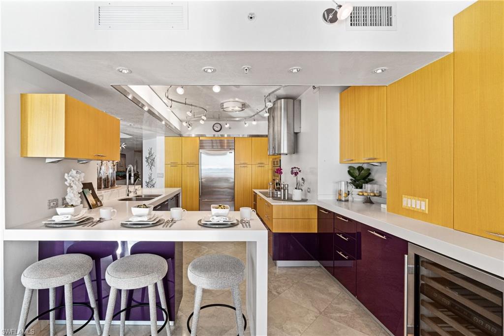 Experience Miami Modern in Marco Island in this extraordinary REMODELED PENTHOUSE WITH POOL CABANA AND 2 CAR GARAGE located in the exclusive GATED GULF-FRONT COMMUNITY of Mirage on the Gulf. This stunning residence offers over 3,100 square feet of beautifully updated living space with panoramic views of the Gulf of Mexico, Caxambas Pass, and the 10,000 Islands. From soaring sunsets to dolphins and manatees gliding by, the views begin the moment you walk in. The light-filled open floor plan flows effortlessly to an expansive gulf-front lanai designed to maximize indoor-outdoor living. At the heart of the home, the chef’s kitchen features premium Italian cabinetry, swing-out storage, a large pantry, and a top-tier appliance package: Sub-Zero refrigerator, Sub-Zero wine cooler, Thermador cooktop, JennAir built-in oven, two Faber hoods, and four dishwasher drawers. A breakfast bar and separate dining area make hosting simple and seamless. The primary en suite offers a private balcony, sitting area, large walk-in closet with custom built-ins, dual water closets (one with a bidet), a walk-in shower, and a soaking tub. Guest rooms are spacious and well appointed, including features such as built-in office cabinetry, a guest Murphy bed, and a surprise bedside "televator." A major highlight is the just-remodeled PRIVATE POOLSIDE CABANA with a half bath—ideal for relaxing by the pool with added privacy and convenience. The residence also includes its own PRIVATE, UNDERGROUND TWO-CAR GARAGE, providing secure, weather-protected parking rarely available in condo living. Mirage on the Gulf offers exceptional amenities, including a resort-style pool and spa, expansive sundeck, fishing pier, fitness center, tennis and pickleball courts, and a welcoming social room. This penthouse combines luxury finishes, thoughtful upgrades, and unmatched water views—an opportunity to experience the best of Marco Island living with elevated Miami Modern style.