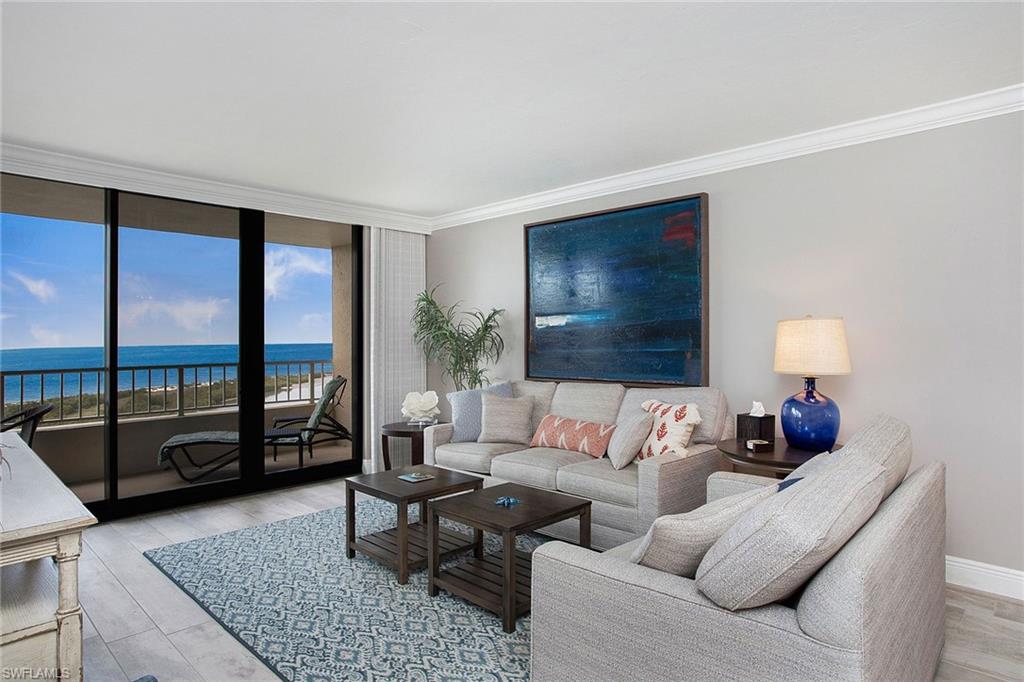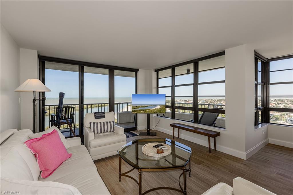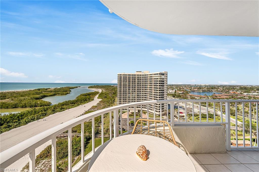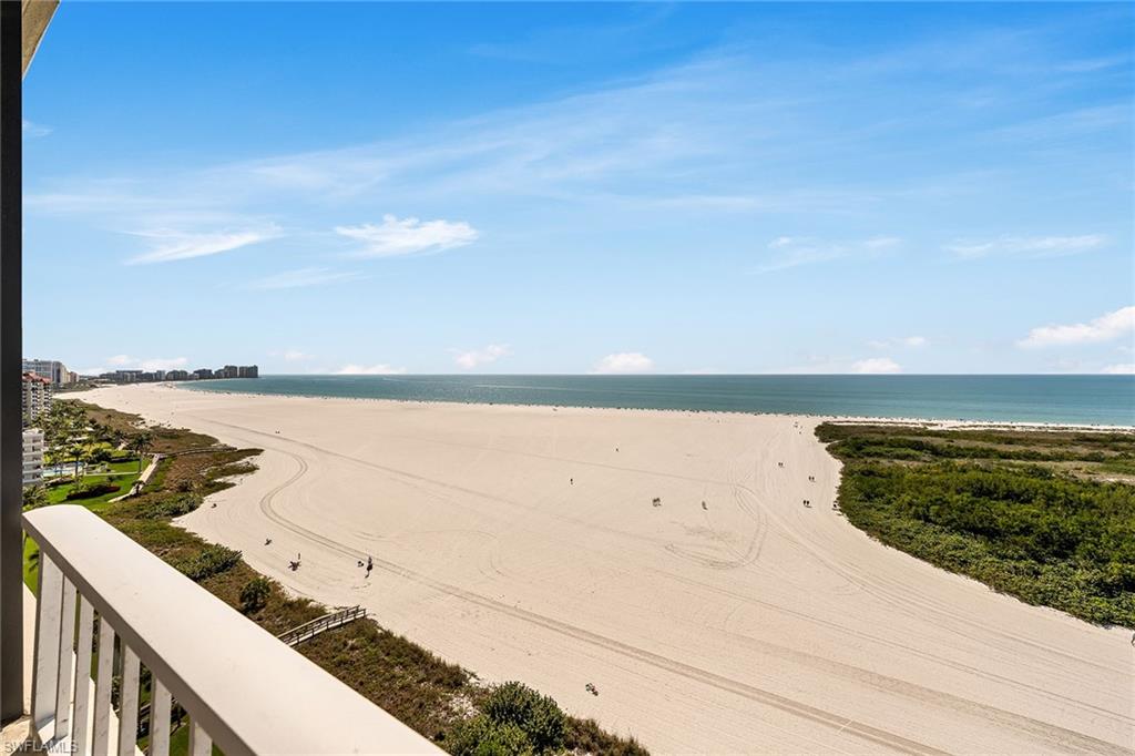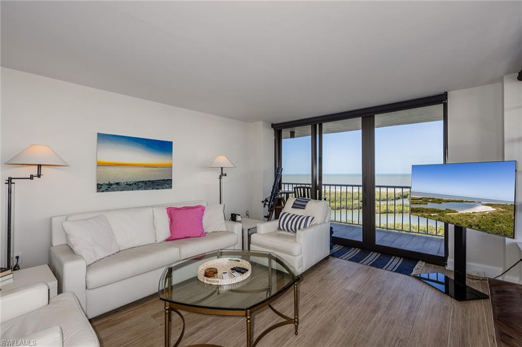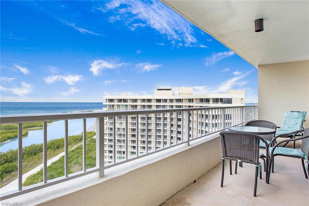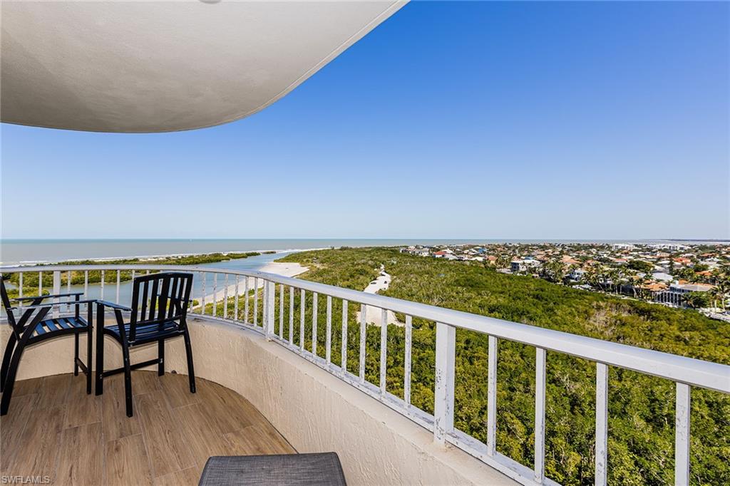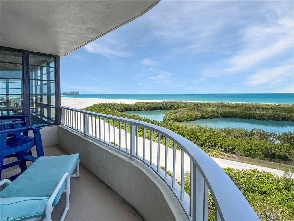 Sweeping views of beach and island all the way to Naples. End wraparound unit with balconies looking over island and Gulf. Updated unit, ready to move in, turnkey furnished. Electric sunshades throughout for privacy and beachfront darkening during turtle nesting season. Weekly rentals allowed. Common boat docks, tennis, pickleball, shuffleboard, bocce courts and large pool. Private beach entrance. Gated community for security.