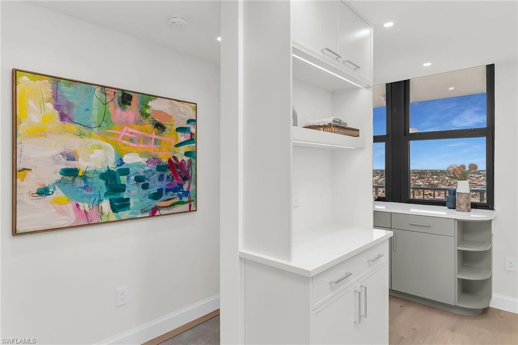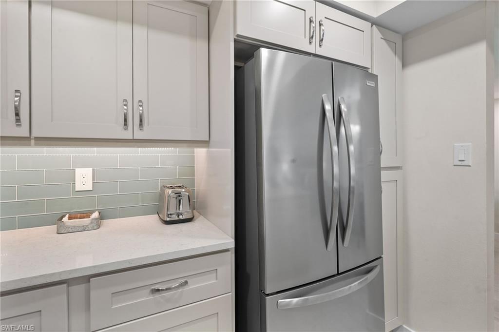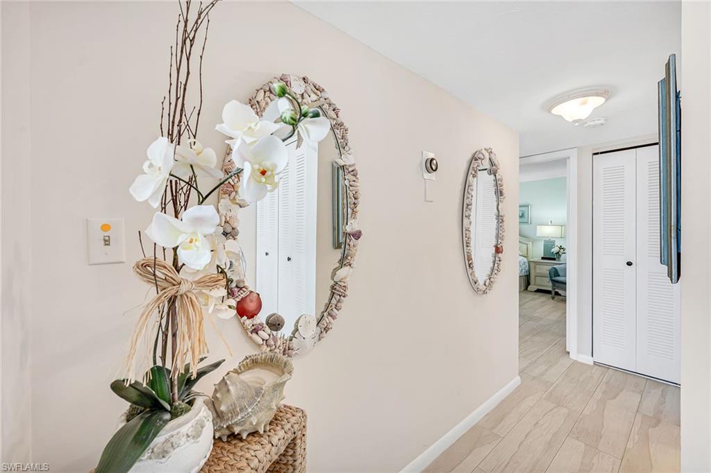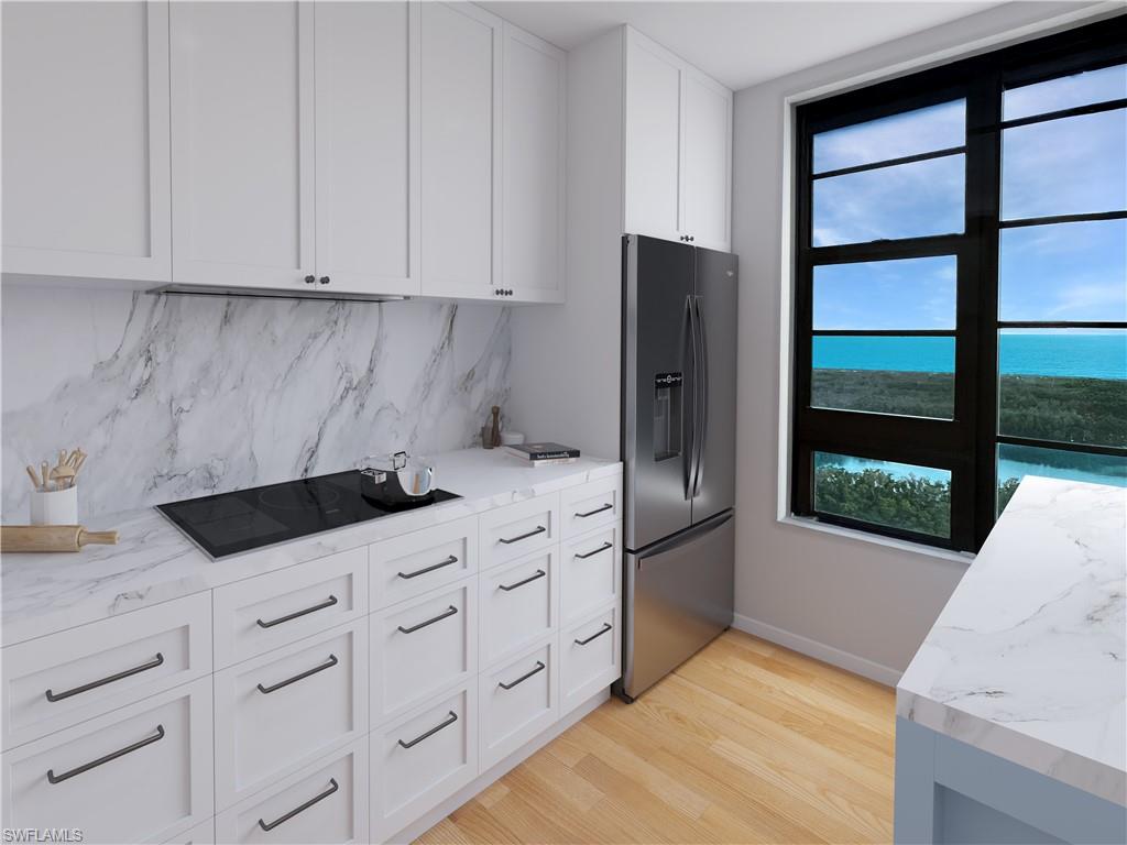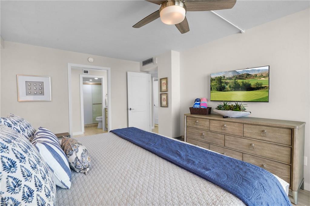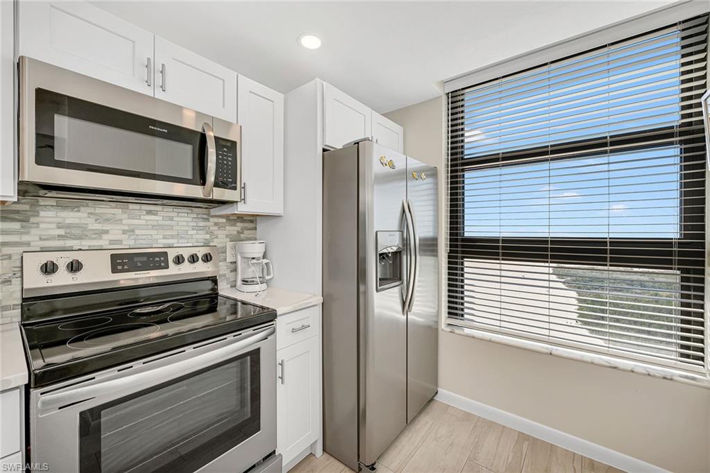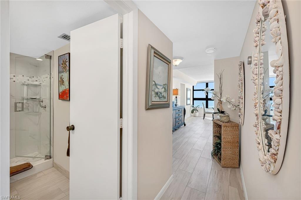 This beautifully furnished waterfront residence in the high-rise South Seas Condominium offers a rare opportunity to enjoy coastal living with Gulf access and sweeping water views. Designed to combine comfort with style, the home is positioned in one of Marco Island’s sought-after communities, placing you moments from the beach and surrounded by luxury amenities, fine dining and endless opportunities for recreation. Inside, the thoughtfully designed floor plan features two bedrooms and two baths, with impact-resistant doors and windows for security and peace of mind. Recessed lighting highlights the interiors, while laminate flooring in the main living areas creates a warm, inviting atmosphere, and tile flooring in the baths adds durability and function. The living room is enhanced with crown molding and opens through a glass slider to the balcony, where stunning views of the Gulf provide the ideal backdrop for morning coffee or evening sunsets. The kitchen is thoughtfully designed with white shaker-style cabinetry, a decorative tile backsplash, GE stainless steel appliances, and a bar counter with seating for casual dining or entertaining. A pantry provides excellent storage, ensuring style and practicality. The primary suite serves as a private retreat, featuring its balcony access and an en-suite bath with dual vanities and a walk-in shower with floor-to-ceiling tile walls. The guest bedroom is generously sized, with an adjacent bath showcasing another walk-in shower with matching tile detailing. As a resident of the desired South Seas community, you'll have exclusive access to a private beach, bike storage, community pool, tennis court, a state-of-the-art fitness center and library. Beyond the residence, the community offers the ideal balance of coastal luxury and an active lifestyle. Just minutes away are Marco Island’s pristine beaches, boutique shopping, world-class golf, parks and museums. Whether you prefer kayaking, paddleboarding, tennis, pickleball, biking, or even yoga on the beach, the possibilities are endless. With convenience of the nearby executive airport, travel is effortless.