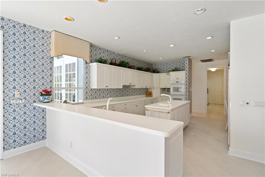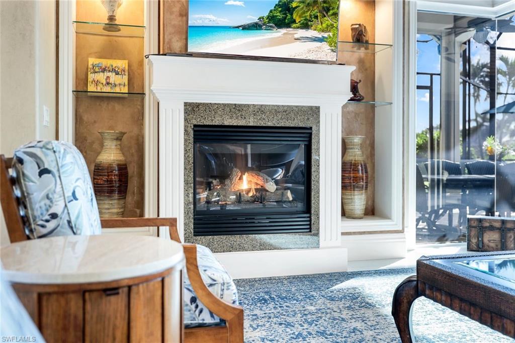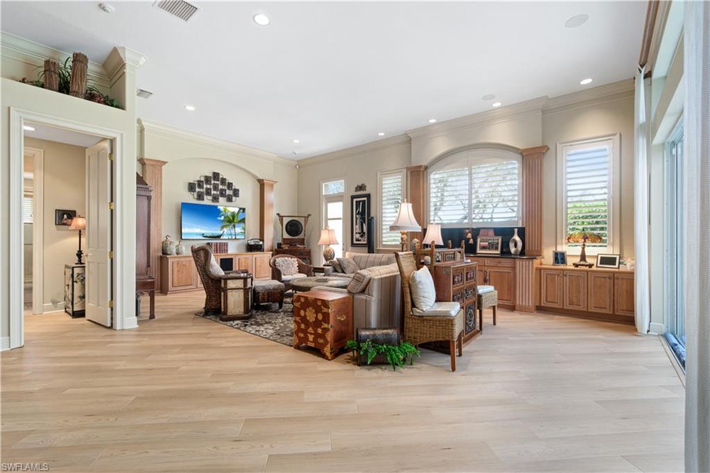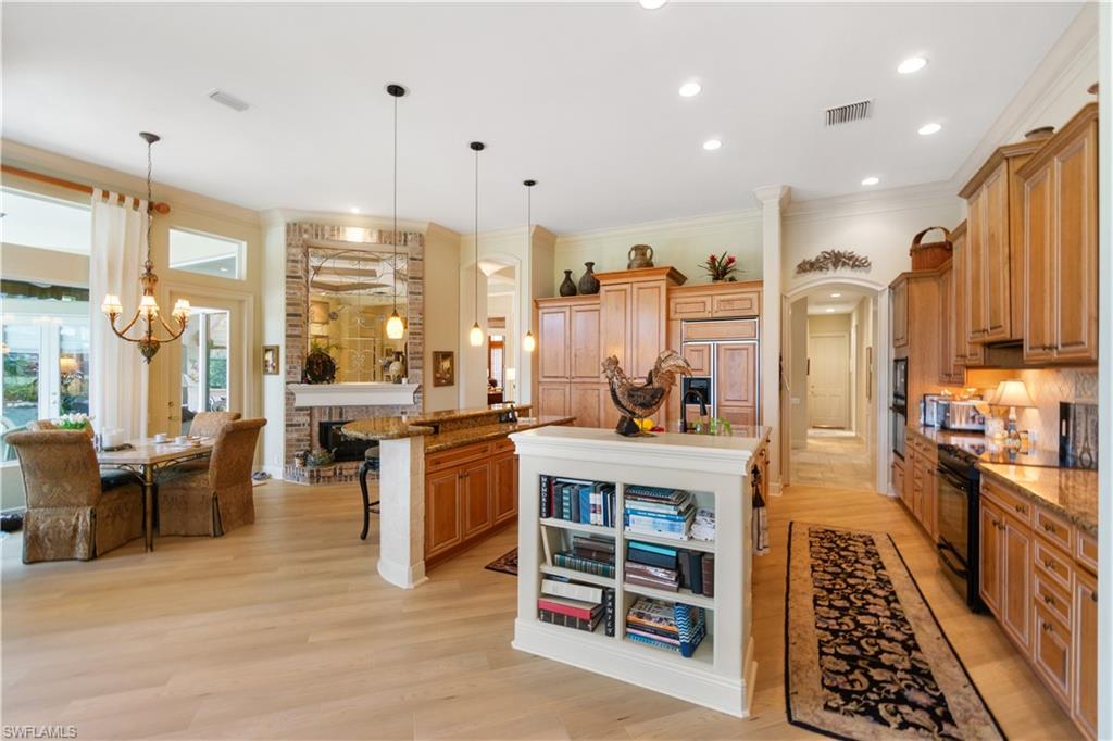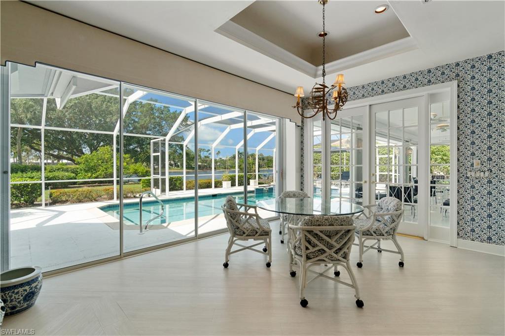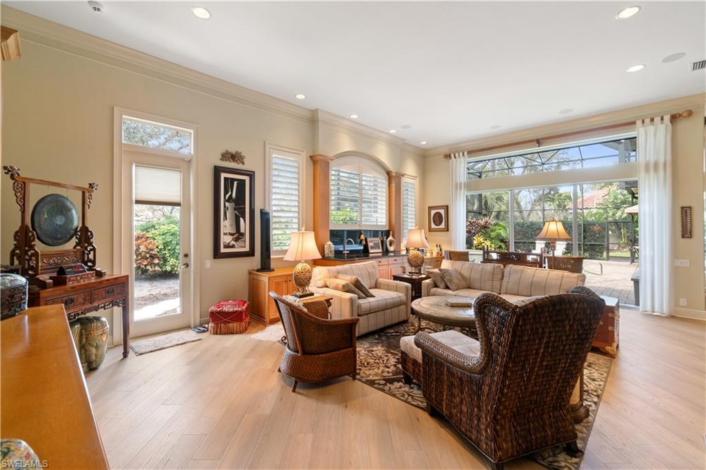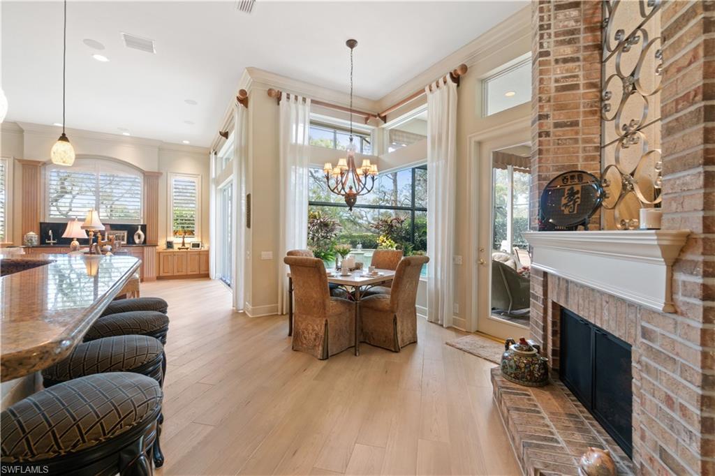 This extraordinary residence offers stunning lake and deep-preserve views. Impeccably updated, the home features rich hardwood floors and custom 8-foot doors, with 3 bedrooms, a versatile den, a lake-facing sunroom and 4 bathrooms. The high-ceilinged living room centers around a fireplace and flows seamlessly onto a lanai/screened porch overlooking the saltwater pool and spa, with nature's beauty just steps away. Equally sophisticated, the formal dining room boasts French doors, and there's a nearby den lined with custom library bookcases. The newly reimagined kitchen and family room impress with their airy and sophisticated style. Highlights include a dramatic beamed ceiling, top-tier European appliances, dual extra-wide quartz islands, custom-designed cabinetry with hardwood polished maple interiors as well as a gas cooktop, making it a dream space for culinary enthusiasts and entertainers alike. The adjoining family room features custom built-ins, while the sunroom offers a sun-drenched & serene space to unwind, with breathtaking views of nature often visited by white egrets and blue herons. The spacious primary suite includes a walk-in closet, wall of custom cabinetry, and a luxurious bathroom. The home is fully storm-ready, featuring hurricane-rated protection, a whole-house generator, and a newer roof. The garage accommodates two cars plus a golf cart. Located in the prestigious Audubon Country Club, this home provides access to an array of amenities and social activities/events, including an 18-hole golf course, tennis, pickle ball, croquet, bocce ball, a large community pool, a fitness and lifestyle center, and a clubhouse with multiple dining options. Immediate afternoon golf play available, and short waiting list for full golf membership. Enjoy the boardwalk to the bay with kayaks, and relish Naples’ finest beaches, restaurants, and shopping only minutes from Audubon.