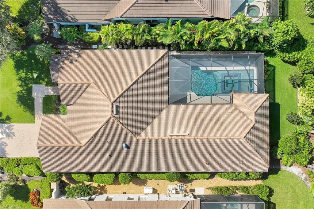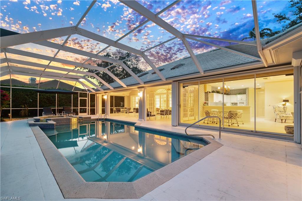 Nestled on a lot and a half, this exceptional estate offers stunning views of the golf course and pristine nature preserves, all within the highly coveted Audubon Golf & Country Club in North Naples. Enjoy the sought-after western exposure, providing breathtaking sunsets and optimal sunlight over the pool. This expansive residence boasts three generously sized bedrooms, two dens, three and a half bathrooms, a built-in bar, and a spacious three-car garage, plus a detached, insulated, and air-conditioned two-car garage. This additional two car garage could easily be converted into a luxurious Cabana for guests. The opportunities are endless with this large space. Additional highlights include a new roof (2022), hurricane impact windows and sliders, a new water heater (2024), a whole-house dehumidifier and air purifier, soaring ceilings with custom wood beams, and elegant travertine flooring. The beautifully landscaped grounds are enhanced with stunning landscape lighting in both the front of the house and behind the pool area. The expansive lanai is an entertainer’s paradise, offering unmatched privacy and featuring a rare infinity-edge saltwater pool and spa, complemented by an electric and gas heater that ensures both can be quickly heated for year-round enjoyment. Ample lounging areas and a summer kitchen make outdoor dining and entertaining effortless. The fully pocketing sliders seamlessly blend the indoor and outdoor spaces, making entertaining effortless. The beautifully renovated chef’s kitchen features pristine white quartz countertops, sleek white cabinetry, dual sinks, double ovens, and a breakfast bar for casual dining. The luxurious primary suite boasts private lanai access, a den, and a spa-like bathroom with dual vanities, a wraparound walk-in shower with multiple showerheads, and a separate soaking tub. Audubon’s prime location is just 5 minutes from Mercato and world-class beaches, and the community offers a gated/guarded entrance, an 18-hole championship golf course, tennis, pickleball, a Bayside boardwalk, and a newly renovated clubhouse with dining and a second beautiful poolside club and café.