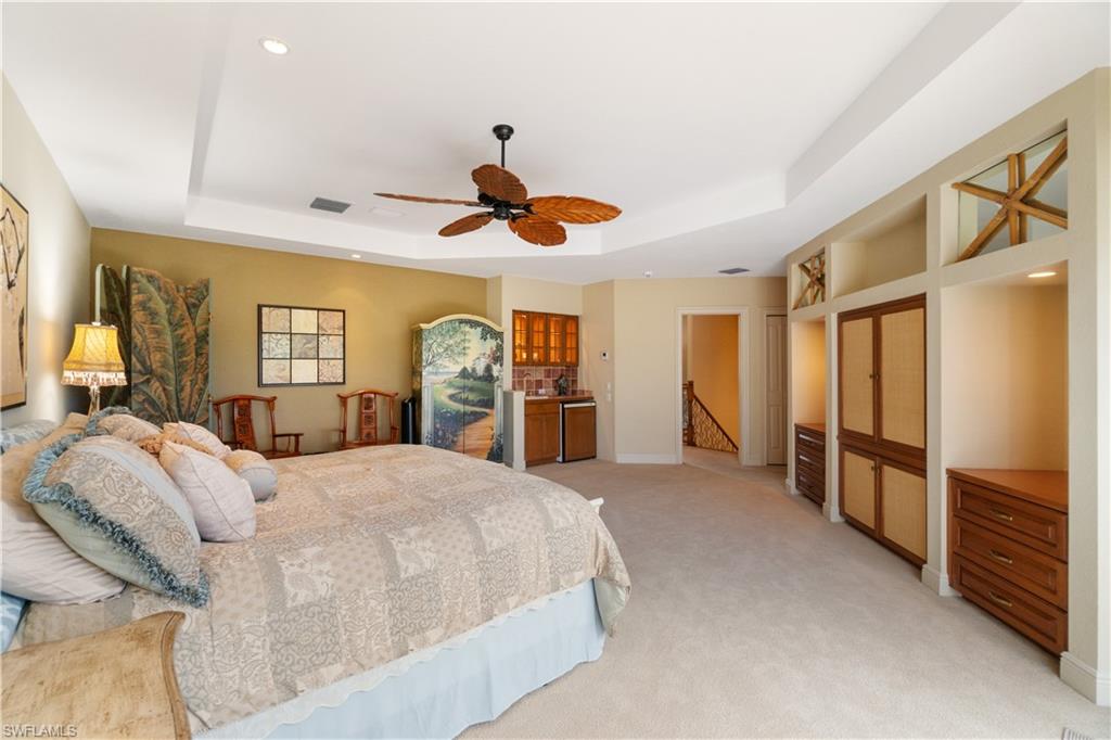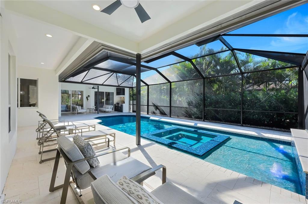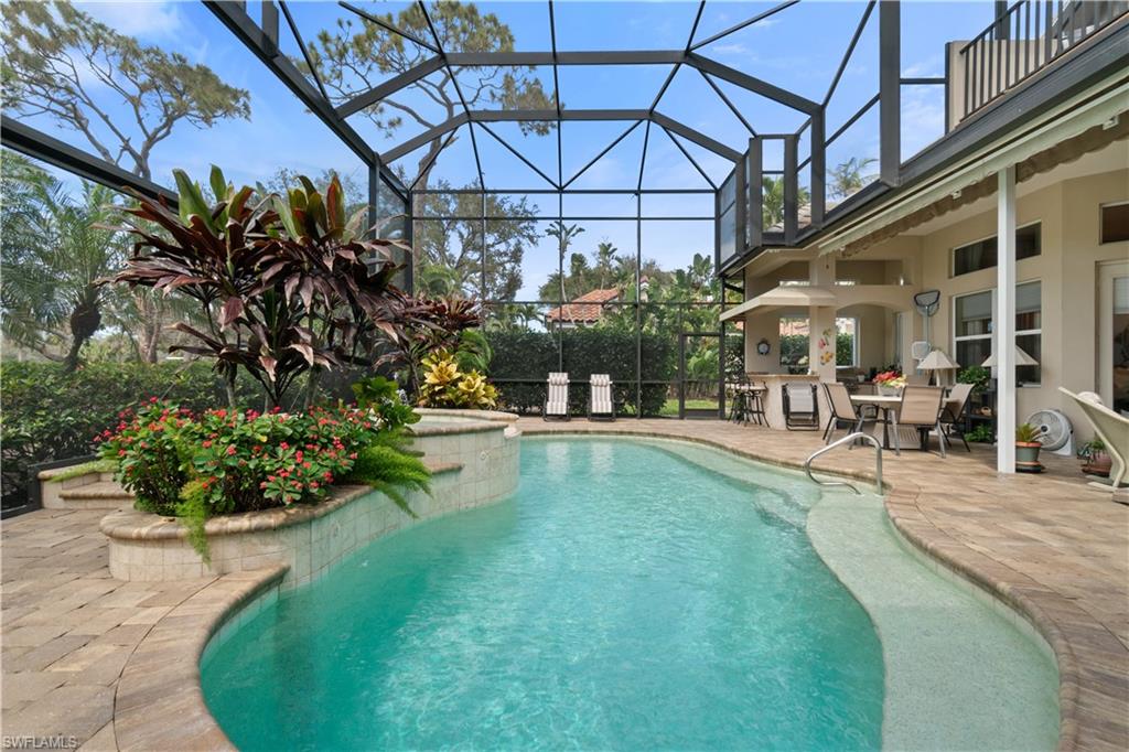 Located in the highly coveted Audubon Golf & Country Club in North Naples, this exceptional estate offers beautiful golf course views and ideal western exposure for prime sun over the pool and breathtaking sunsets. This beautiful residence offers 4,645 sq ft of luxurious living space, a new roof (2019), 3-car garage, soaring ceilings, a spacious open floor plan, & an incredible amount of storage. The main level includes a den and three private bedrooms (including the primary suite), each with its own ensuite, while the second floor offers an expansive guest suite complete with a wet bar, sundeck, and separate leisure room—ideal for entertaining family and friends. The beautiful chef’s kitchen boasts dual islands, granite countertops, custom wood cabinetry, an eat-in area, and a breakfast bar perfect for casual dining. Step outside into your own private oasis, where you'll be greeted by a spacious pool, spa, and a new picture-screen enclosure (2020), offering stunning golf course views. The outdoor space is enhanced with ample lounging areas and a summer kitchen complete with a grill, sink, bar seating, and an electric awning for added convenience. The generous primary suite offers direct access to the pool deck and a spa-like bathroom, featuring dual vanities, a large walk-in shower, and a separate jetted soaking tub, creating a tranquil retreat. Audubon’s prime location is just 5 minutes from Mercato and world-class beaches, and the community offers a gated/guarded entrance, an 18-hole championship golf course, tennis, pickleball, a Bayside boardwalk, and a newly renovated clubhouse with dining and a second beautiful poolside club and café.