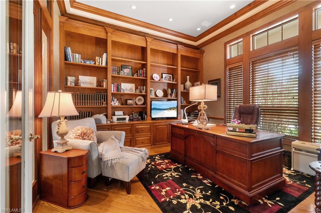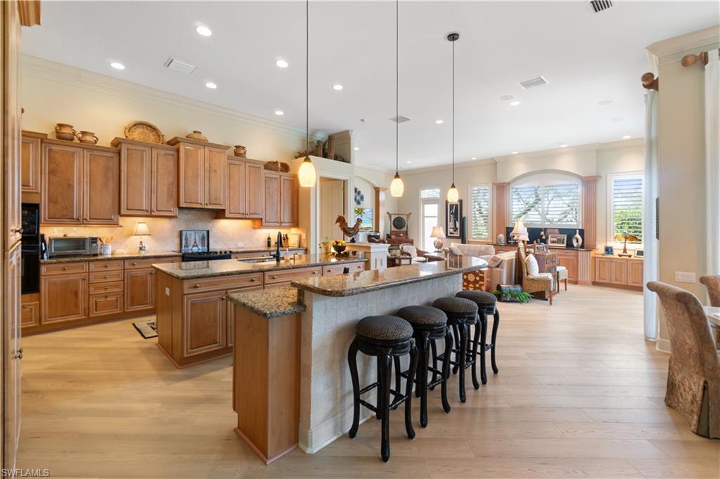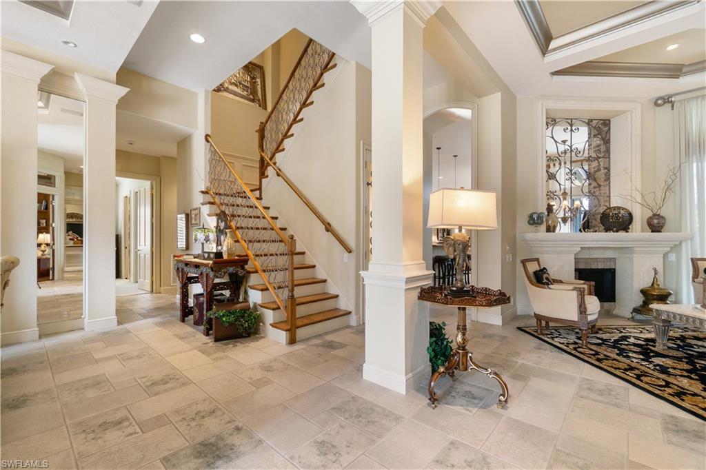 Experience Resort-style living in this gorgeous 5-bedroom plus den home perfectly situated on the golf course. The spacious open floor plan welcomes you with high ceilings, abundant light, and elegant finishes throughout. Five generously sized bedrooms, 3 are ensuites offer ample space for family and guests, while the versatile den is ideal for a home office, media room or extra guest accommodations. The roof was replaced in 2023 along with the gutters and the exterior of the home was painted in 2023. A whole house generator was installed in 2023. Step outside to your private outdoor entertaining oasis complete with a large, covered lanai and outdoor bar with refrigerated drawers and built in grill. Enjoy relaxing evenings hosting friends and family with a dedicated dining area, and plenty of room for grilling and outdoor activities. The seamless indoor -outdoor flow makes every gathering memorable, whether you are watching the sunset over the golf course or enjoying a quiet morning coffee. The 3-car garage with epoxy flooring and built in cabinets is an added plus. Audubon is one of Naples premier communities featuring an 18-hole Troon Managed golf course, Courtside café including indoor/outdoor dining, state-of-the-art fitness facility, community lap pool, bocce courts, tennis courts, Pickleball and a boardwalk down to the water. Currently there is a very short waitlist for golf membership, and social waiting golf members enjoy golf privileges immediately. Audubon Country Club is conveniently located to Vanderbilt Beach and Barefoot Beach.