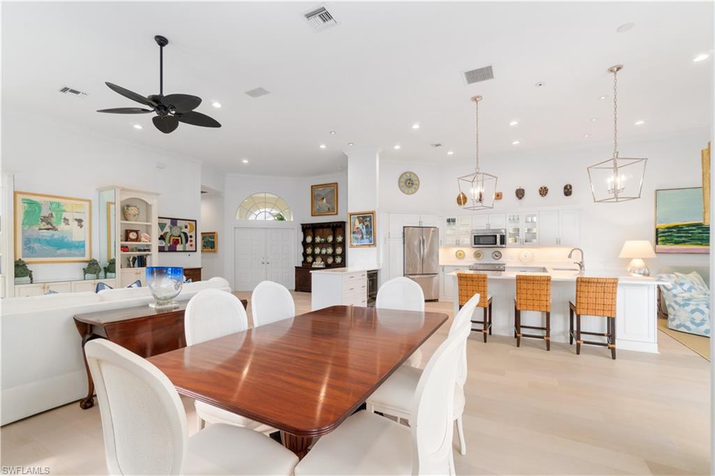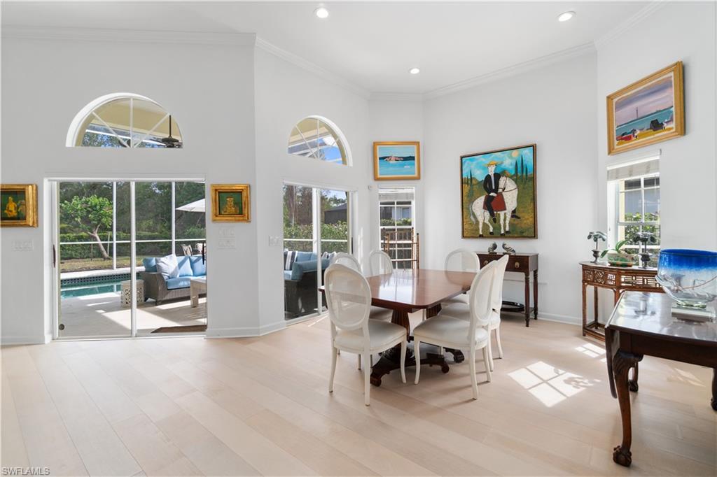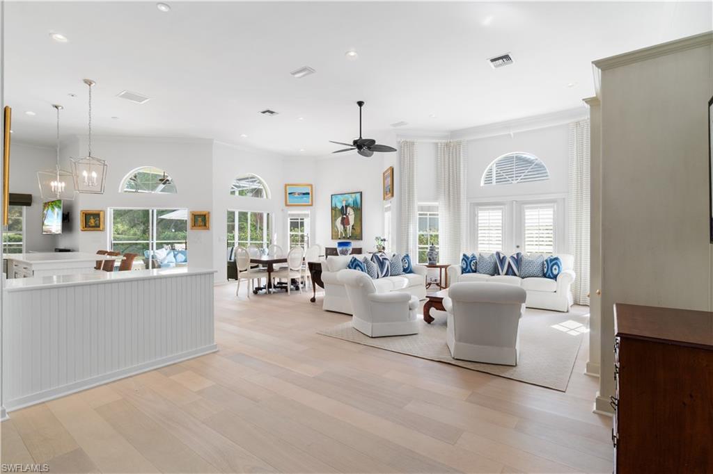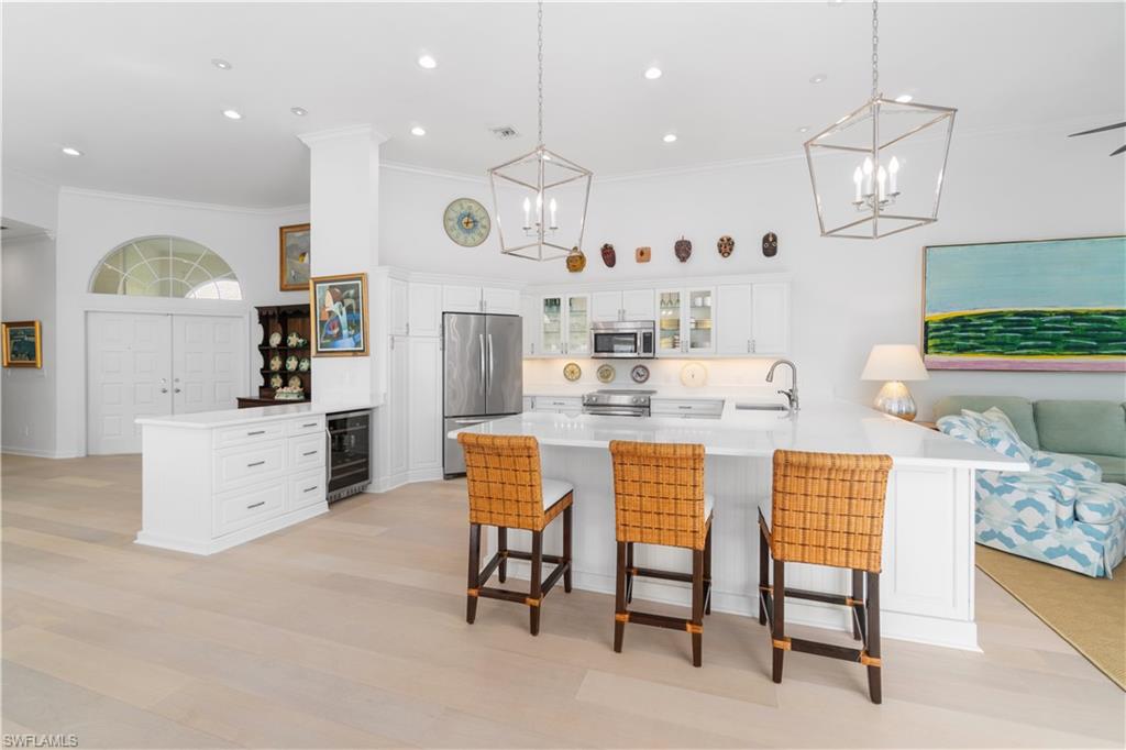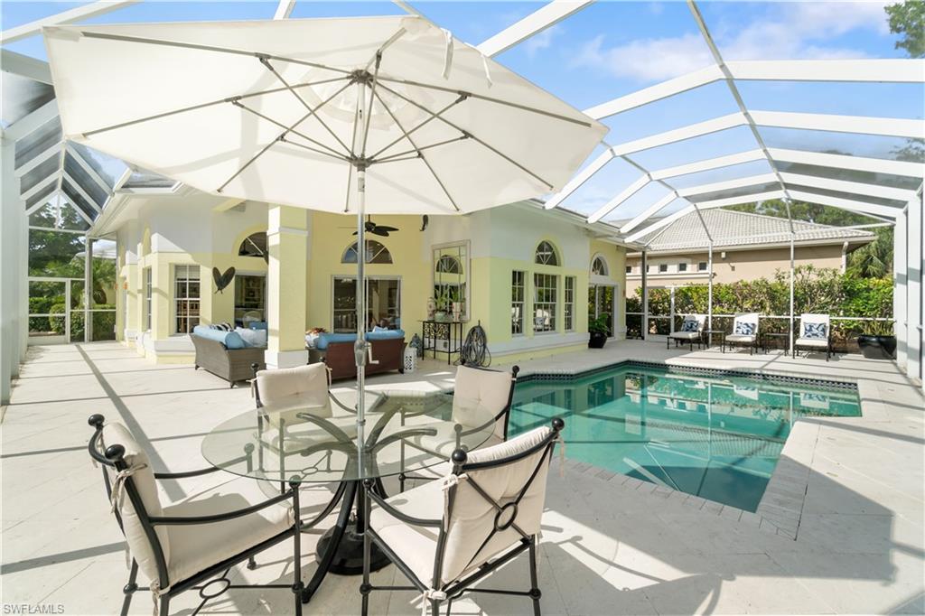 Beautifully renovated coastal contemporary home with spectacular golf course views located in North Naples’ coveted “Audubon Golf & Country Club”. Enjoy the sought-after Southern exposure, providing breathtaking sunsets and optimal sunlight over the pool. This beautiful residence showcases a fabulous open floor plan with 4 bedrooms, 3.5 bathrooms, a light & bright interior, soaring high ceilings, & beautiful new engineered hardwood floors and sleek ceramic tile. Notable upgrades include a new roof (2021), electric hurricane shutters, hurricane impact windows (front of home), new sliding glass doors, a hurricane rated garage door, and a brand-new HVAC (2025). Step outside to the expansive screened-in lanai, where a resurfaced saltwater heated pool awaits, complete with new pool tile and travertine decking (2024). Surrounded by lush landscaping, this outdoor retreat provides multiple lounging areas and stunning golf course vistas — offering the perfect space to relax in privacy. Inside, the kitchen boasts light cabinetry, white countertops, and premium Bosch appliances, including a new induction cooktop (2023). A separate wet bar with a built-in beverage cooler adds convenience for entertaining. The generous primary suite is a private retreat featuring a spa-like bathroom with dual vanities, a spacious walk-in shower, and a freestanding soaking tub for ultimate relaxation. Audubon’s prime location is just 5 minutes from Mercato and world-class beaches, and the community offers a gated/guarded entrance, an 18-hole championship golf course, tennis, pickleball, a Bayside boardwalk, and a newly renovated clubhouse with dining and a second beautiful poolside club and café.
