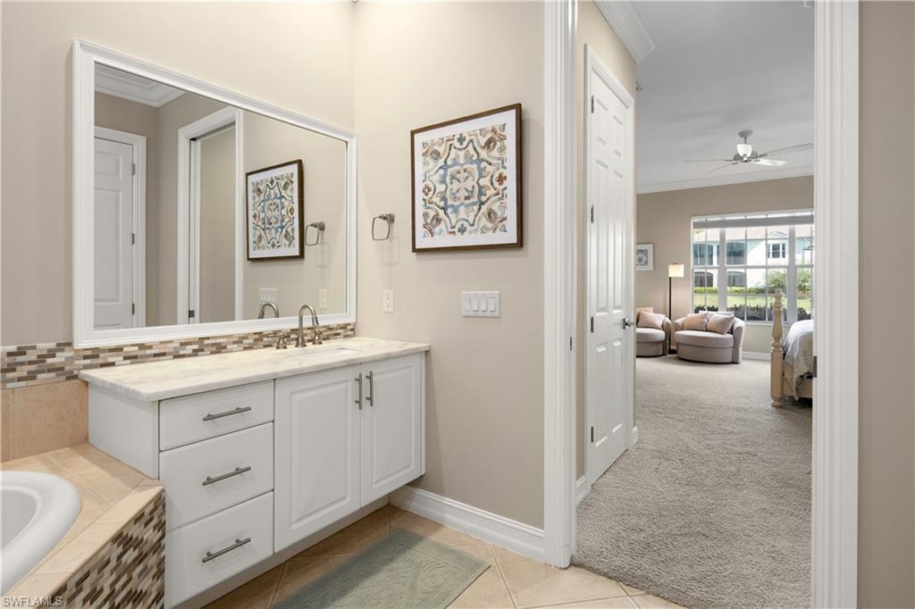 This first-floor coach has three bedrooms, two baths, an updated kitchen with white quartz countertops and stainless appliances. The kitchen is open to the great room, and lanai for socializing with family and guests. Plantation shutters and crown molding accentuate the upgrades to the unit! Wood floors in the living and dining rooms, and halls. Its 8-foot doors and 10-foot-high ceilings add to the spacious feeling of this coach home! A private two-car garage has a new epoxy floor. Enjoy a beautiful view of the pool and spa near the screened lanai. All exterior maintenance is covered in The Reserve Association dues. A new exterior paint and roof was installed in 2024 with no assessments. The gated community of Banyan Woods has amenities that include a community fitness center, a clubhouse, playground and basketball court. Great location within minutes to Gulf beaches, wonderful dining and shopping.
