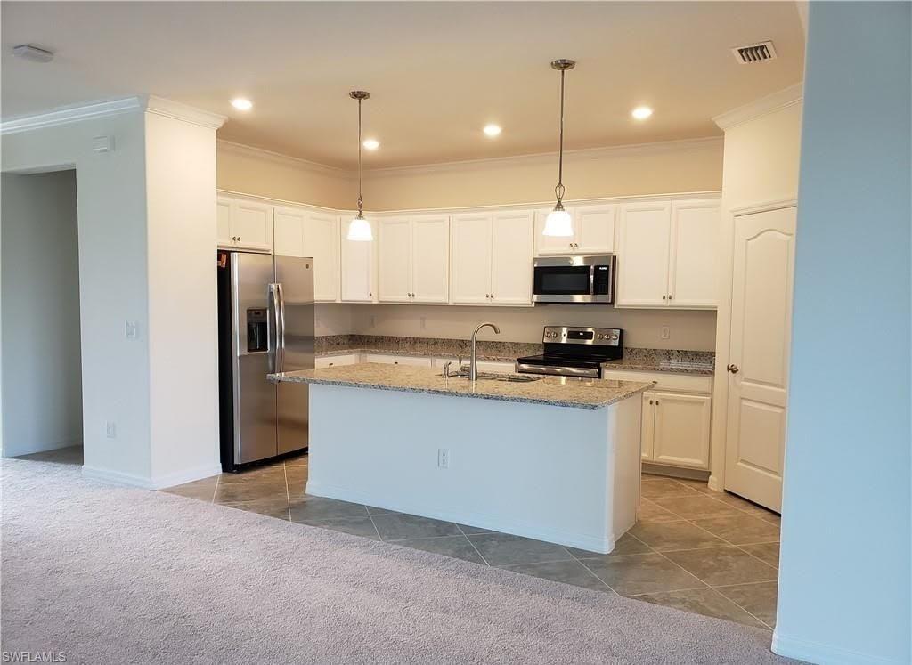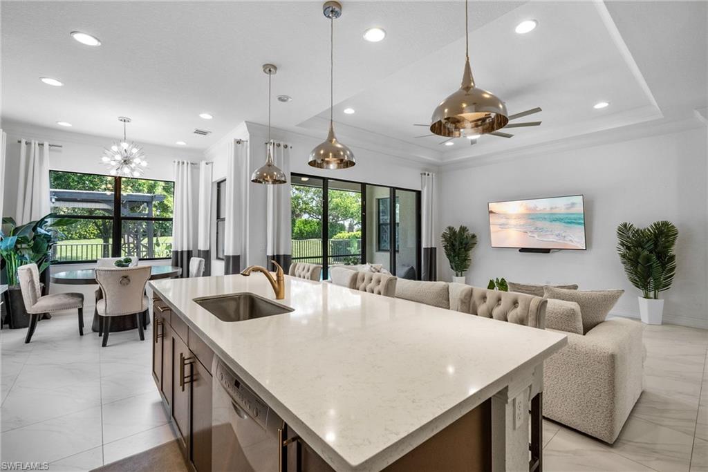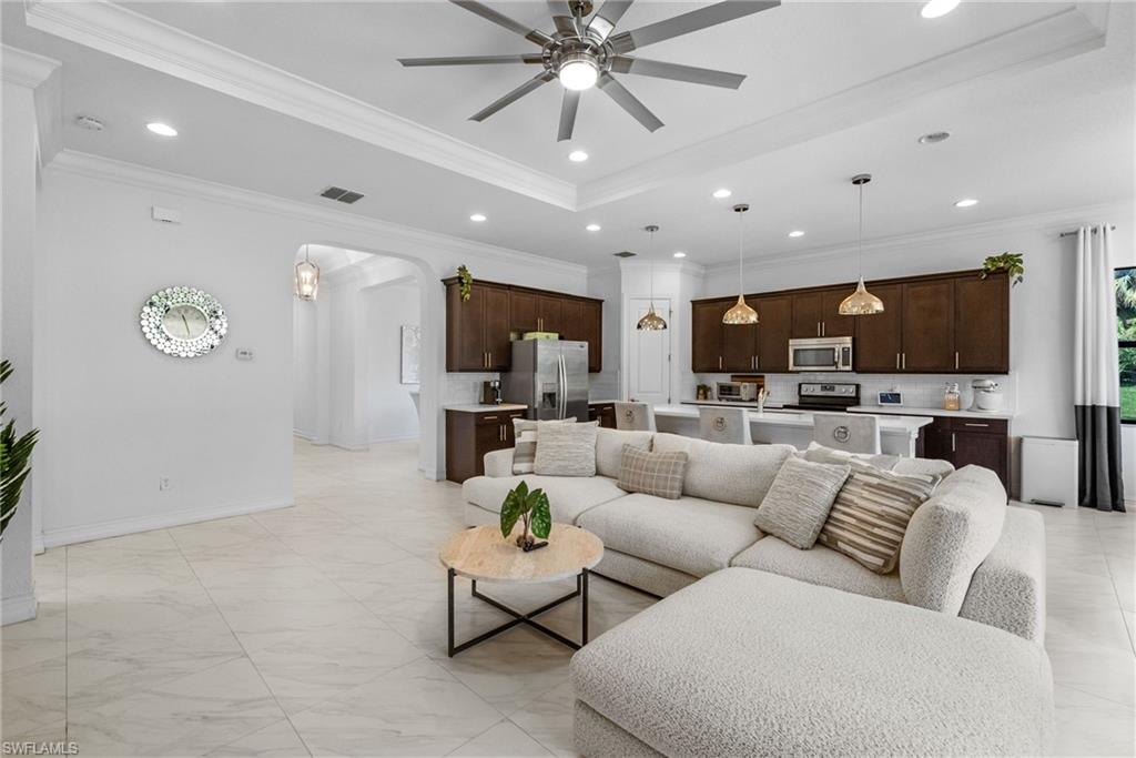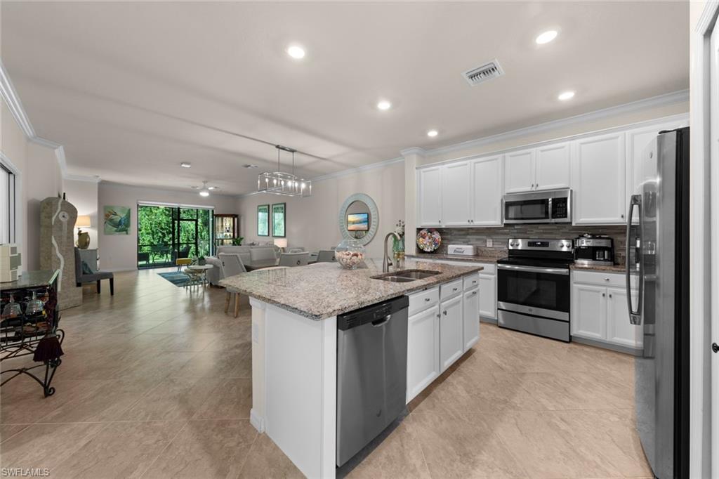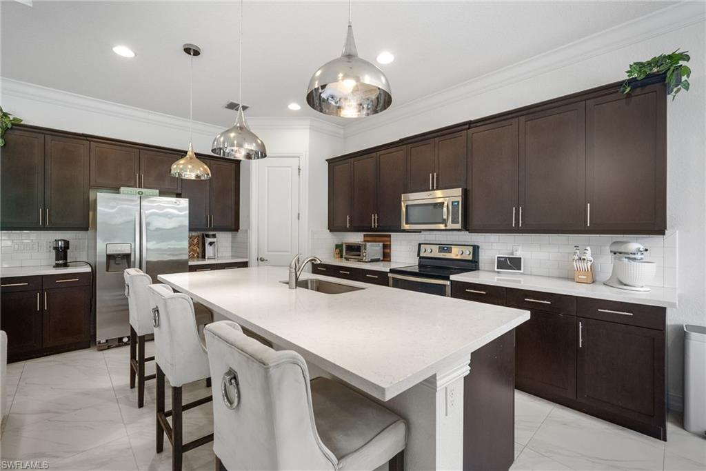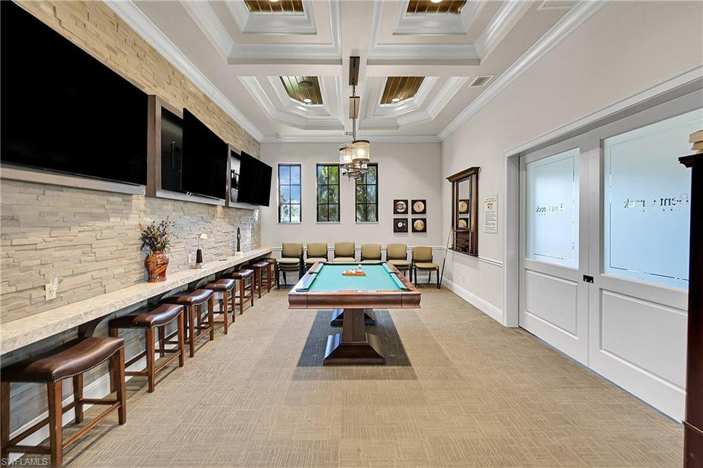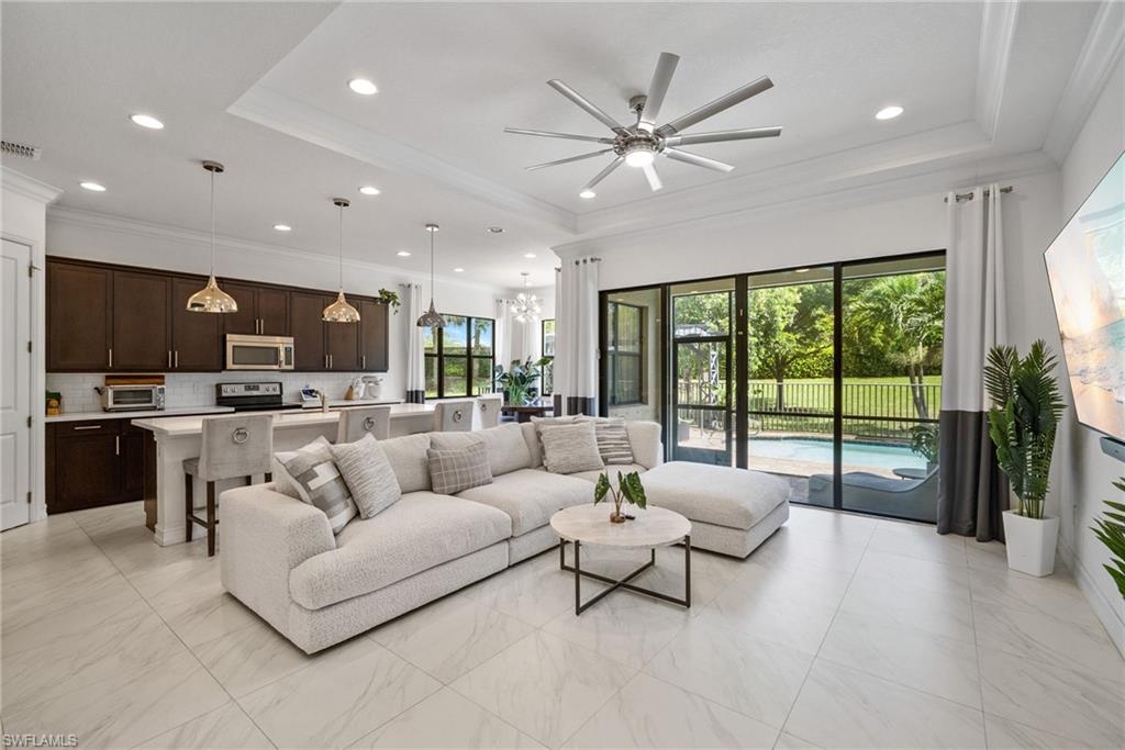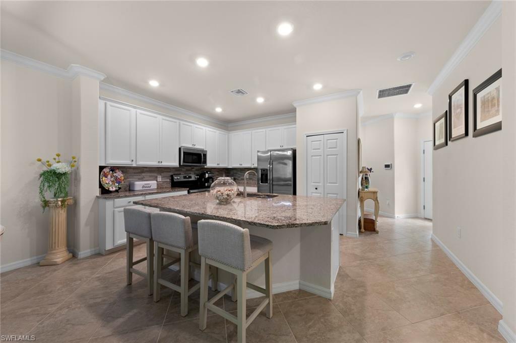 Welcome to Your Naples Oasis! This stunning 3-bedroom, 3-bathroom home with a 2-car garage and extended driveway offers the Naples lifestyle you’ve been dreaming of. Featuring soaring ceilings, an open floor plan, and a large lanai with a private pool, spa, and outdoor kitchen, this residence is perfect for both relaxation and entertaining. Inside, the sleek kitchen showcases white cabinetry, quartz countertops, a stylish backsplash, a massive island with seating for four, stainless steel appliances with hood, and a spacious walk-in pantry. The open kitchen, living, and dining areas flow seamlessly together under a detailed tray ceiling, with windows and sliders filling the home with natural light and views of the pool and lanai. The owner’s suite is bright and expansive, offering two custom walk-in closets, a linen closet, and a spa-like bath with dual vanities, soaking tub, and an oversized glass-enclosed shower. Step outside to your resort-style lanai, complete with a sparkling pool, spa, and fully equipped outdoor kitchen with grill and refrigerator—perfect for Florida living. Additional highlights include: • Impact-resistant windows and doors • Tile flooring throughout main living areas; carpet in bedrooms • Garage with built-in shelving Located in Bent Creek Preserve, residents enjoy a lakeside clubhouse with event space, billiards, fitness center, resort pool & spa, tennis, pickleball, bocce, basketball, playground, and a social calendar. Conveniently, the community also connects to Founders Square, a hub for premier dining and entertainment. This is more than a home—it’s a lifestyle! Comes with Home Warranty at closing.