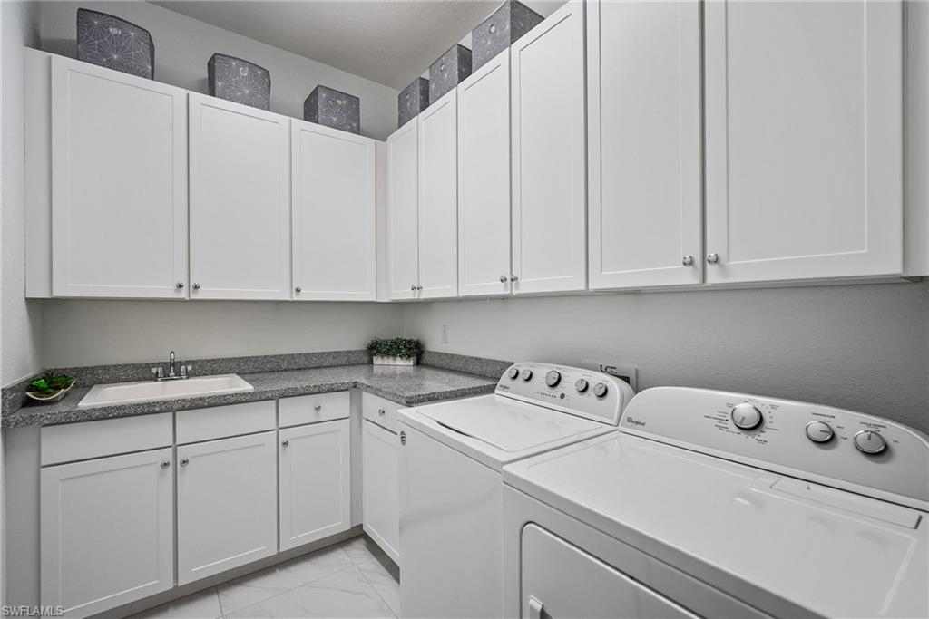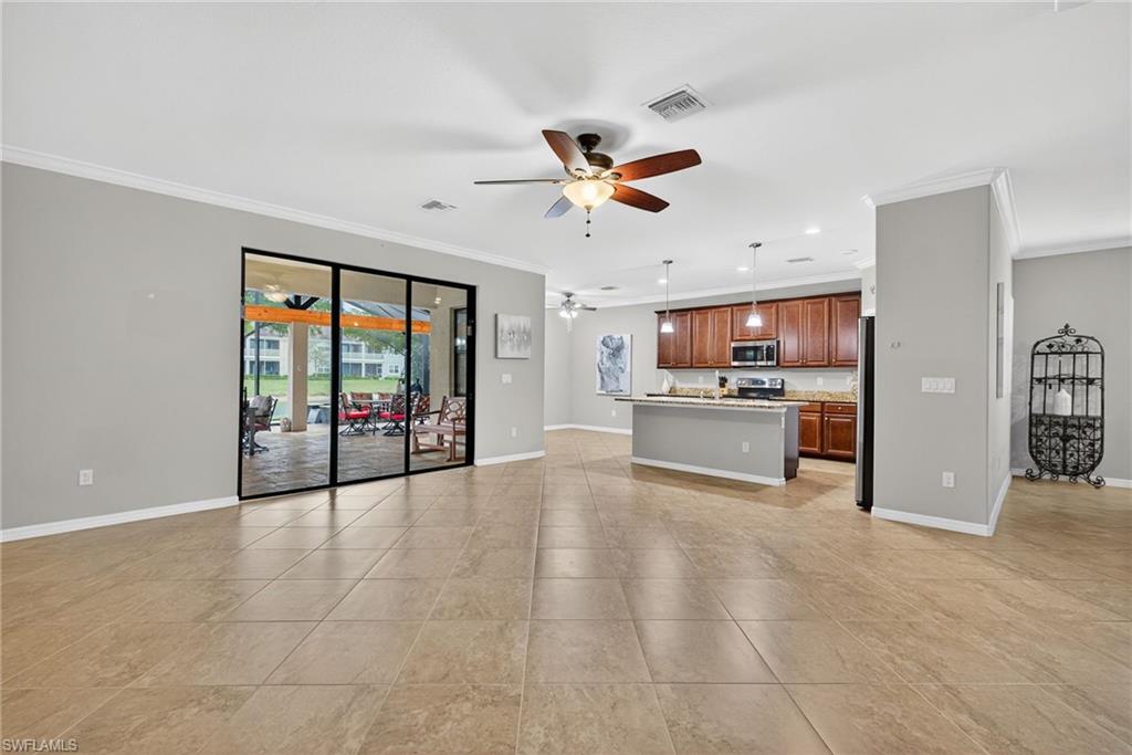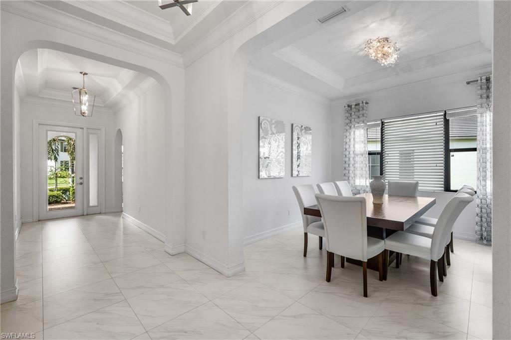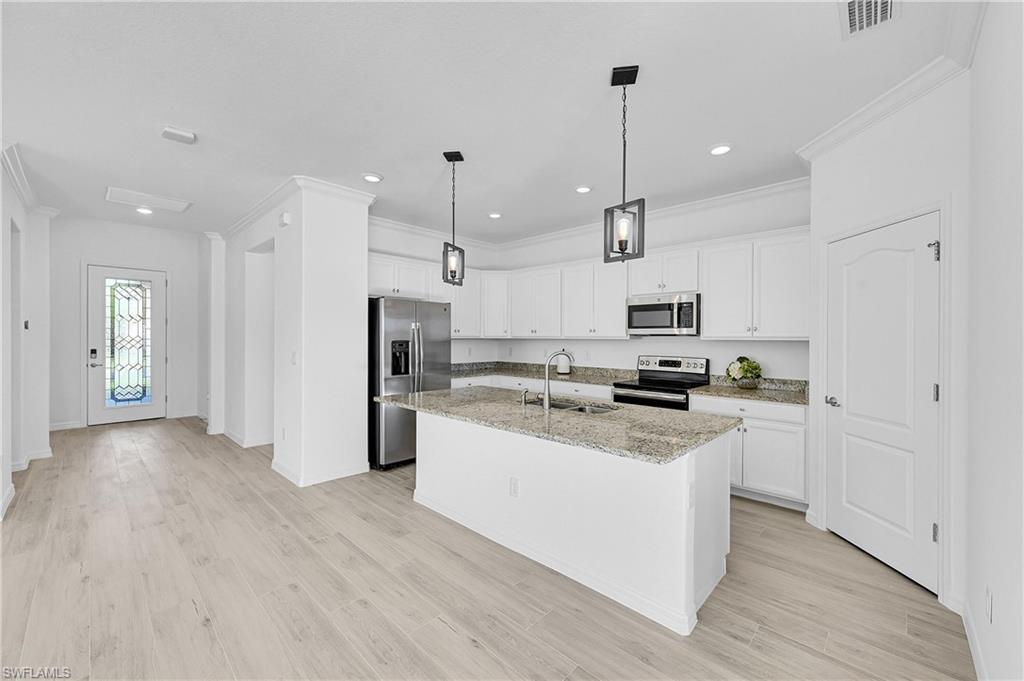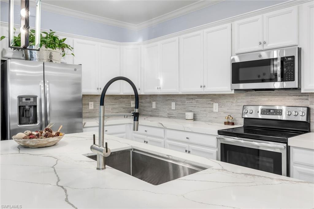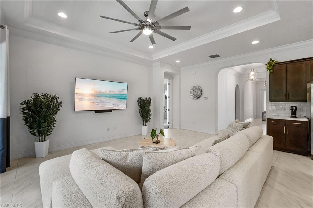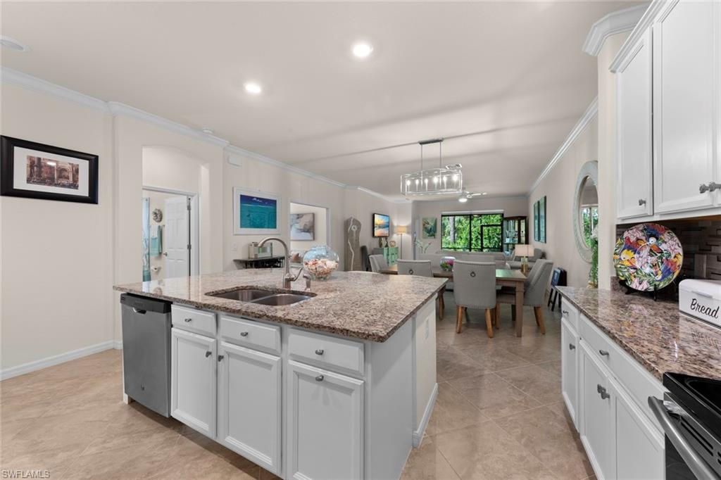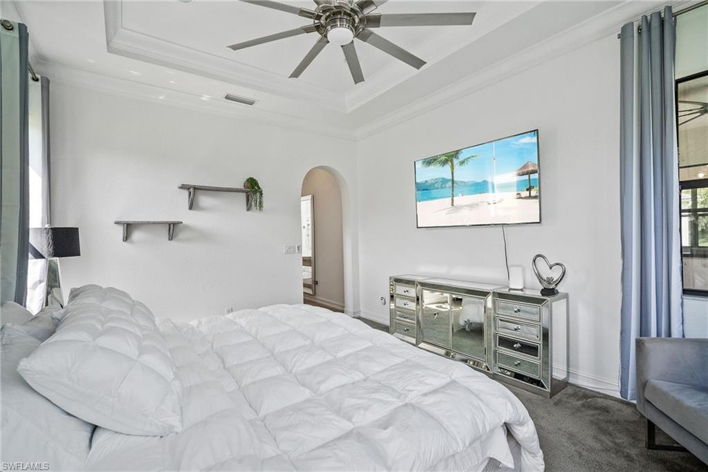 Welcome to Your Naples Oasis! This stunning 3-bedroom, 3-bathroom home with a 2-car garage and extended driveway offers the Naples lifestyle you’ve been dreaming of. Featuring soaring ceilings, an open floor plan, and a large lanai with a private pool, spa, and outdoor kitchen, this residence is perfect for both relaxation and entertaining. Inside, the sleek kitchen showcases white cabinetry, quartz countertops, a stylish backsplash, a massive island with seating for four, stainless steel appliances with hood, and a spacious walk-in pantry. The open kitchen, living, and dining areas flow seamlessly together under a detailed tray ceiling, with windows and sliders filling the home with natural light and views of the pool and lanai. The owner’s suite is bright and expansive, offering two custom walk-in closets, a linen closet, and a spa-like bath with dual vanities, soaking tub, and an oversized glass-enclosed shower. Step outside to your resort-style lanai, complete with a sparkling pool, spa, and fully equipped outdoor kitchen with grill and refrigerator—perfect for Florida living. Additional highlights include: • Impact-resistant windows and doors • Tile flooring throughout main living areas; carpet in bedrooms • Garage with built-in shelving Located in Bent Creek Preserve, residents enjoy a lakeside clubhouse with event space, billiards, fitness center, resort pool & spa, tennis, pickleball, bocce, basketball, playground, and a social calendar. Conveniently, the community also connects to Founders Square, a hub for premier dining and entertainment. This is more than a home—it’s a lifestyle! Comes with Home Warranty at closing.