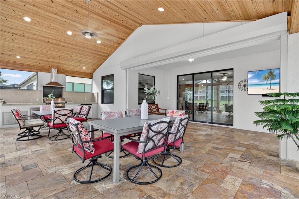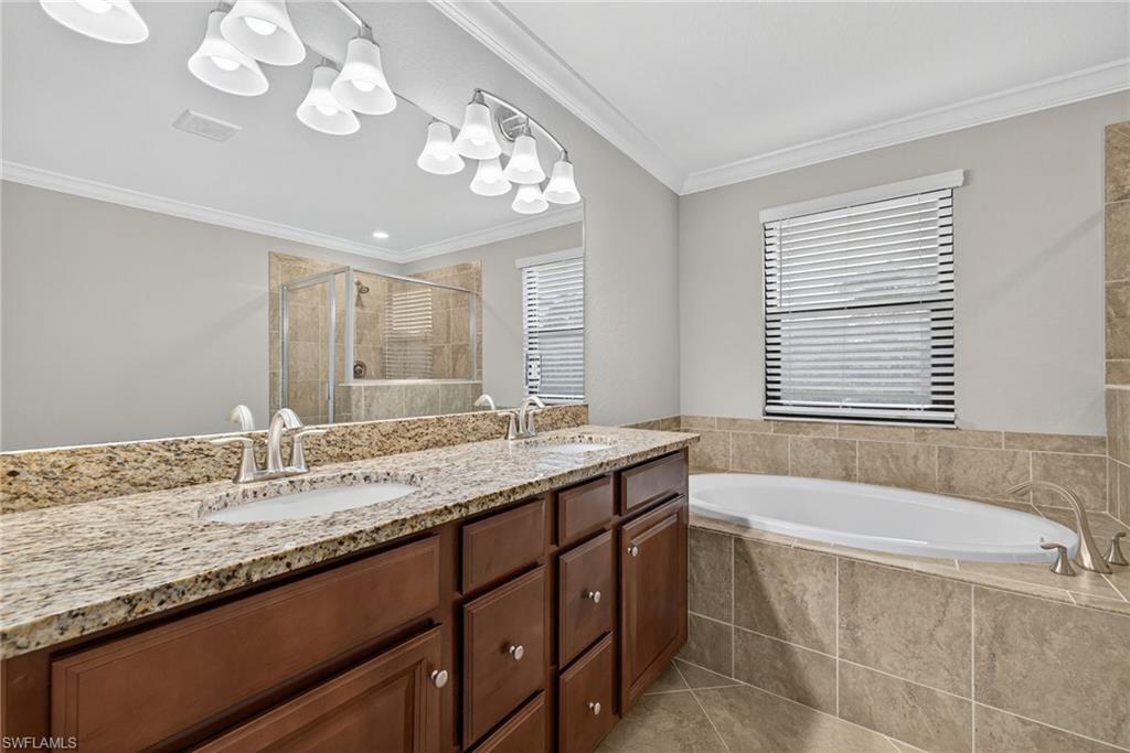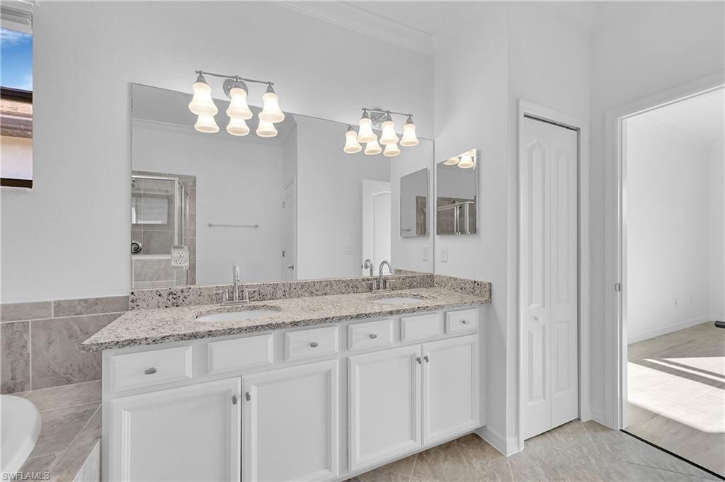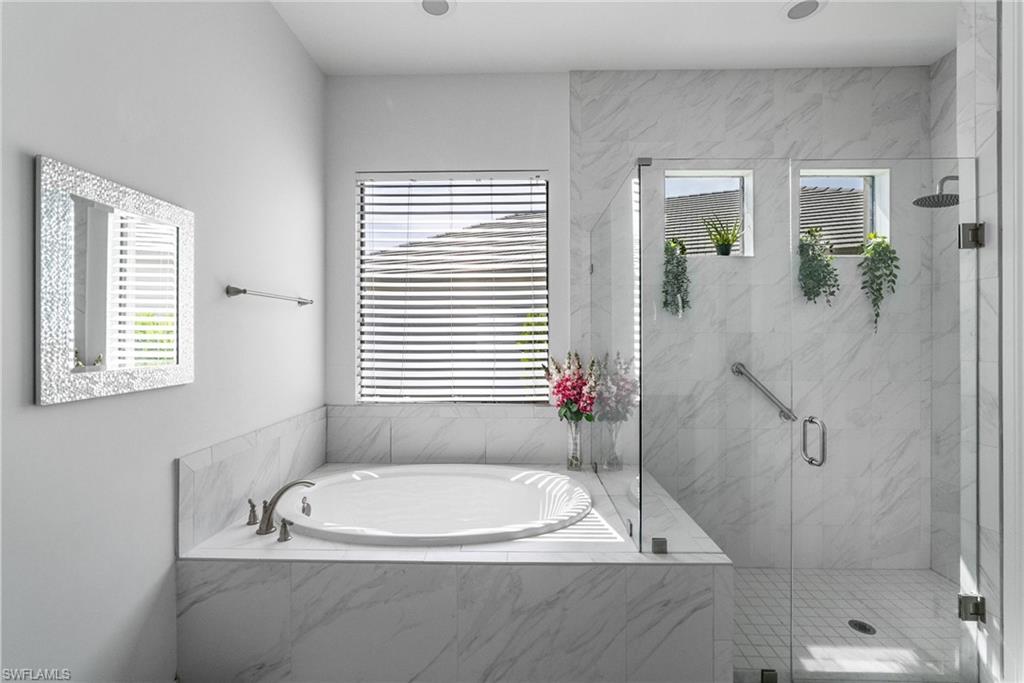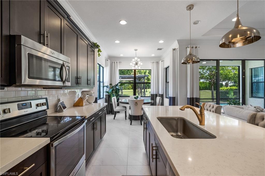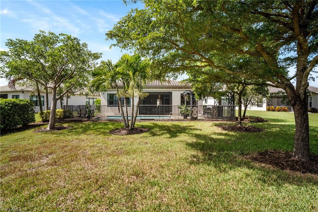 Are you searching for a private, resort-style retreat in North Naples with sunset views and lush tropical ambiance? This stunning four-bedroom, three-bath residence in Bent Creek Preserve offers western exposure, tranquil privacy, and beautifully manicured landscaping surrounding a screened-in lanai and heated pool, the ideal perfect setting for relaxed luxury living. Go inside to a bright open floor plan featuring plank tile flooring in the main living areas, crown molding and white plantation shutters that create a cohesive and upscale interior. The kitchen is designed to impress with granite countertops, a glass tile backsplash, white shaker-style cabinetry with soft-close drawers, a large island with pendant lighting and GE stainless steel appliances. A spacious pantry, breakfast area and formal dining space with statement lighting complete this inviting gathering area. The living room blends style and comfort with custom wall trim, a designer chandelier, lanai access, and a stunning brick accent wall that elevates the ambiance. Outside, the covered outdoor living area features a modern ceiling fan, brick paver flooring and a fully equipped outdoor kitchen with a built-in gas grill, hood and beverage cooler, all overlooking lush landscaping for total privacy. The owner’s suite is a peaceful sanctuary with a large walk-in closet featuring custom-built-ins and a spa-inspired en-suite bath offering a dual granite sink vanity, frameless glass walk-in shower and a separate soaking tub. Two guest bedrooms share a well-appointed full bath with a shower-tub combination, while the fourth bedroom features its en-suite bath, making it ideal for guests or flexible use as an office or private retreat. The laundry room is equipped with overhead shelving and a GE washer and dryer, and the three-car garage includes durable epoxy flooring. Residents of Bent Creek Preserve enjoy access to award-winning amenities, including a resort-style pool, lakeside clubhouse, state-of-the-art fitness center with steam rooms, Har-Tru tennis courts, pickleball, bocce, basketball and a kids’ playground. With gated access directly into Founders Square, you're just moments from dining, shopping and medical offices. Mercato, Naples white sandy beaches and top-rated schools are all within easy reach, offering the ideal blend of convenience and lifestyle. Schedule your private showing today to experience the best of North Naples living.