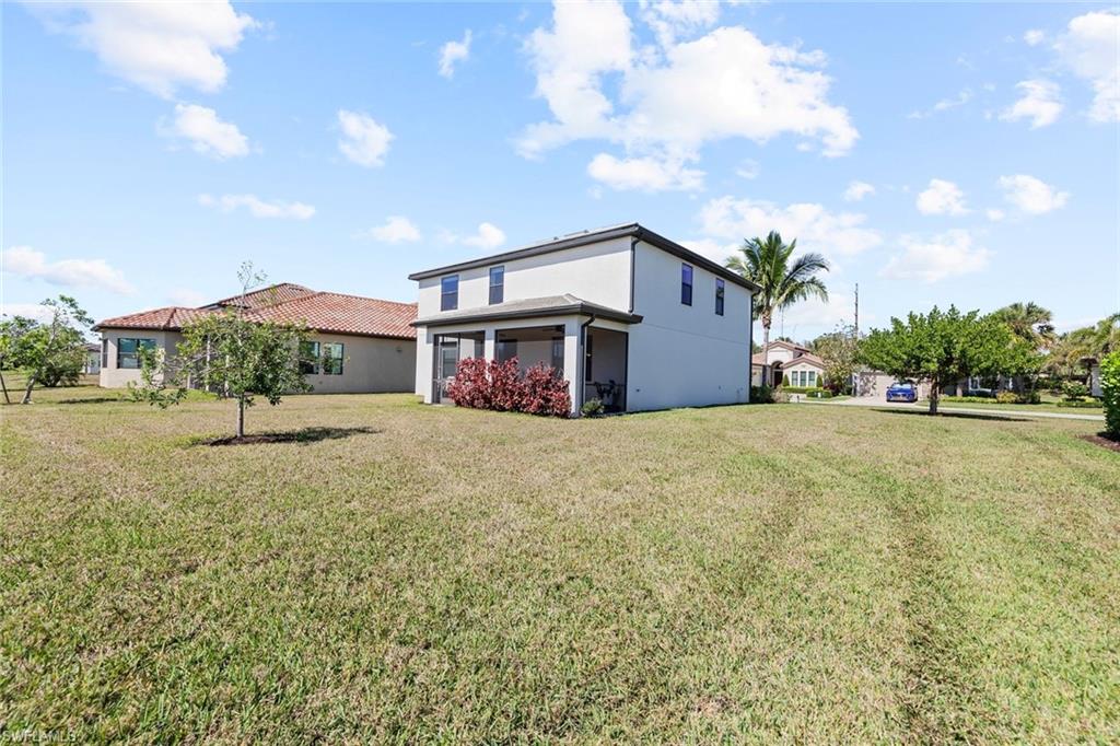 Have you been searching for a spacious family home with serene preserve views and ideal western exposure for unforgettable sunsets? This beautifully maintained two-story residence in Bent Creek Preserve delivers privacy, functionality and room to grow, all in a prime North Naples location with access to top-rated schools, shopping and dining. Designed for modern living and effortless entertaining, this five-bedroom, three-bath home with a den and a rare three-car garage showcases a thoughtful layout and elegant finishes. The open-concept main level features diagonal tile flooring, crown molding, arched walkways, and a seamless flow between living, dining and kitchen spaces. The kitchen is stylish and functional, offering white shaker-style cabinetry, granite countertops, recessed lighting, a built-in desk, pantry and a center island with breakfast bar seating. Stainless steel appliances include a refrigerator with icemaker, range, microwave and dishwasher. Glass sliders lead from the living area to a screened lanai with a covered outdoor space, offering tranquil preserve views and a brick paver patio with a fire pit, ideal for outdoor gatherings. A guest bedroom and full bath with granite vanity and shower-tub combination are conveniently on the first floor. Upstairs, the owner’s suite offers two walk-in closets with shelving and a spa-like en-suite bath featuring a dual-sink granite vanity, full-width mirror, soaking tub and a walk-in shower with glass enclosure. Three additional guest bedrooms share a full bath with a dual-sink vanity and shower-tub combo, while the spacious den/media room with double doors and floating shelves offers flexibility for work or relaxation. The laundry room includes a GE washer and dryer with overhead shelving for storage. Outside, a wide brick paver driveway complements the tandem three-car garage, offering ample space for vehicles and storage. Manual shutters provide storm protection, and a security system adds peace of mind. Bent Creek Preserve is a resort-style, gated community offering unmatched amenities including a lakeside clubhouse, fitness center, steam room, showers, billiard room, event center, resort pool and spa, tennis, pickleball, bocce ball, half-court basketball and a playground. With gated access into Founders Square and easy proximity to Mercato, Gulf beaches, and Interstate 75, this home offers a blend of luxury, privacy and convenience. Schedule your private showing today.