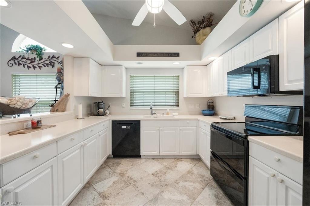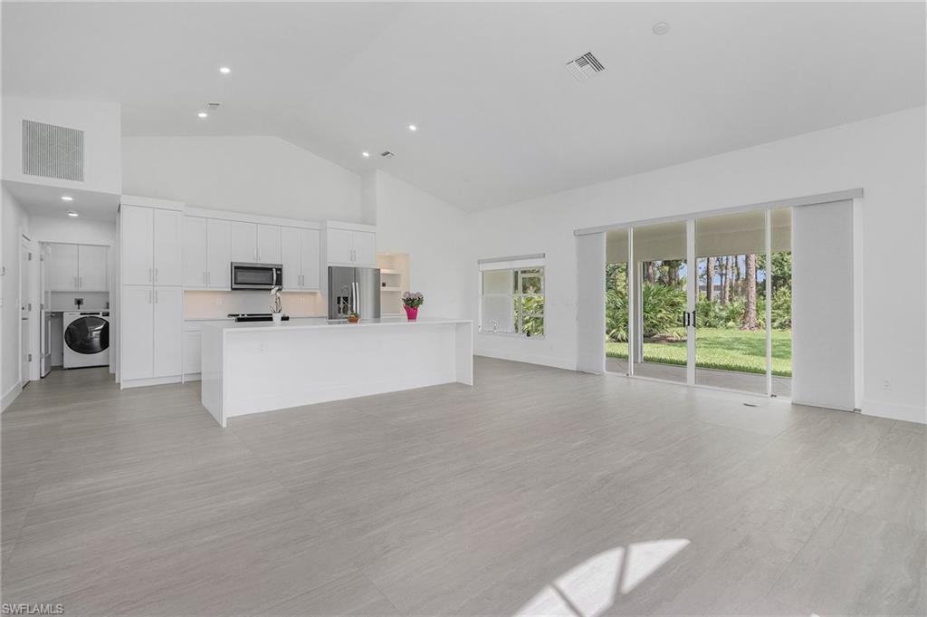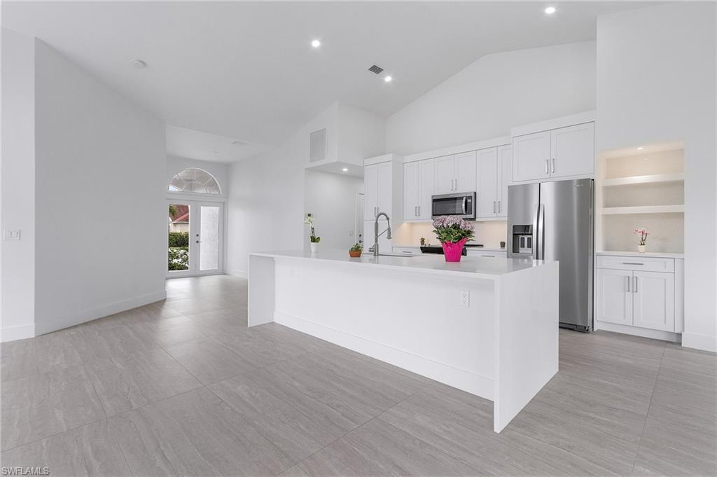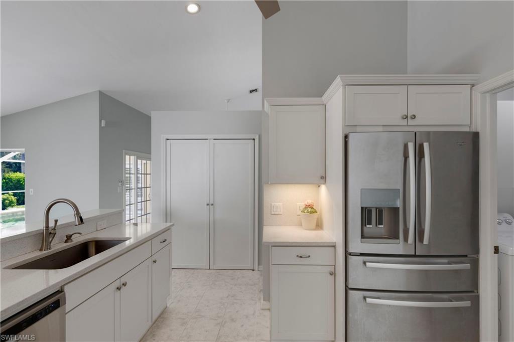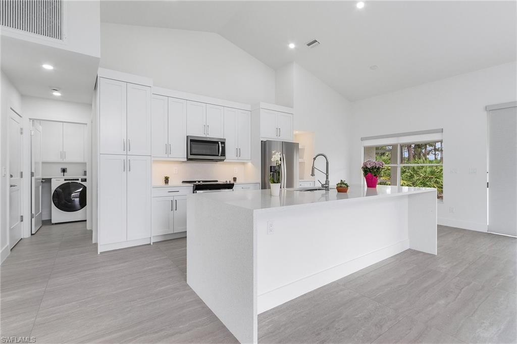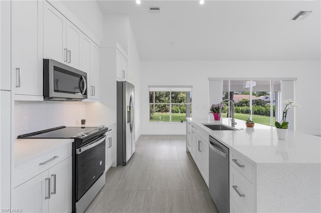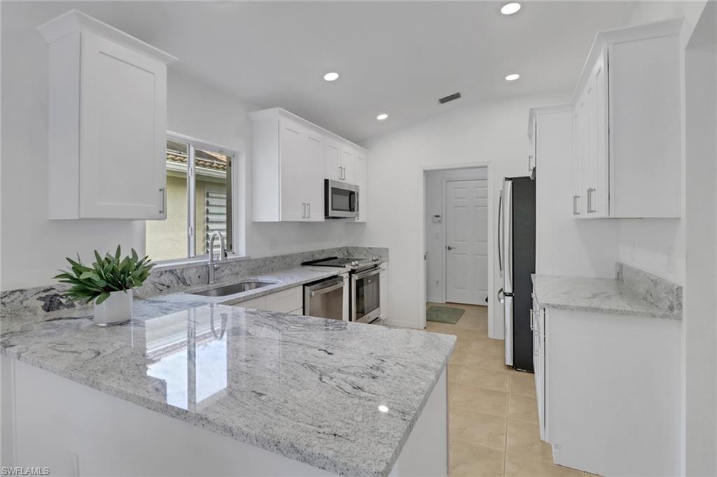 NEW NEW NEW! Enjoy countless upgrades in this home for a lasting low-maintenance lifestyle! Featuring a new tile roof, this spacious 3 bedroom home has great curb appeal with new landscaping and an oversized and expanded, freshly painted screened patio. Inside, discerning buyers will enjoy new paint throughout, a brand new, never used kitchen with white shaker cabinetry, attractive quartz countertops, and brand new stainless steel appliances. Offering a popular eat-in kitchen plan, this home has ample room for entertaining and abundant light from two oversized sliders in the great room and dining area leading out to the patio. The spacious master suite features volume ceilings and a large custom window, along with 2 walk-in closets and a spa bathroom with dual sinks, large soaker tub and separate tiled shower. The 2 guest bedrooms can easily support king beds and share a spacious guest bathroom with updated vanity. Interior laundry offers additional storage and a wash sink. The 2 car garage was also freshly painted and features a brand new AC system and newer hot water tank. This gated community offers boutique amenities including a community pool, clubhouse, playground, tennis and pickleball courts and two convenient entrances/exits. Premiere location close to Publix, shops and restaurants, and is just 6 miles to beautiful downtown Naples/5th Ave, famous beaches, and the best of what Naples has to offer.