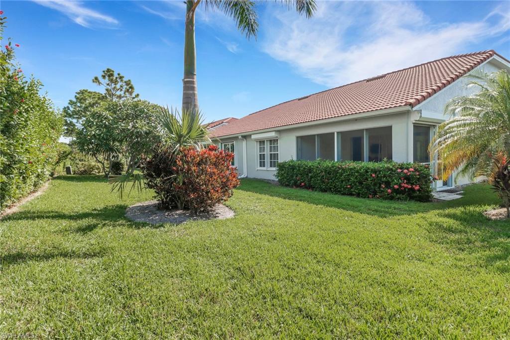 Discover a rarely available, spacious villa in the peaceful, beautifully maintained community of Melrose Gardens with LOW fees! This 3-bedroom, 2-bath home with a 2-car garage with an extra long driveway offers a thoughtfully designed split-bedroom floor plan with vaulted ceilings, large walk-in closets, a soaking tub and dual sinks in the primary bath, and generous storage throughout. Recent updates since 2023 include a brand-new AC system, REPLACED POLYBUTYLENE PLUMBING, interior painting and duct cleaning. The spacious kitchen features resurfaced countertops, and updated appliances including dishwasher, microwave, and refrigerator. Enjoy outdoor living on the screened lanai with new screens, a new lanai screen door, and added privacy from a Silverbutton Tree in the backyard. NEW IMPACT RESISTANT WINDOWS and electric shutters on the lanai provide peace of mind and storm protection. The roof was replaced in 2019 and the exterior was recently painted. Just a short walk to the Melrose community pool/ pavilion and the amenities (tennis, pickleball, community room) of Berkshire Lakes. Ideally located near I-75, downtown Naples, pristine Gulf beaches, East Naples pickleball park, shopping, dining, and entertainment. Don’t miss this great investment opportunity!