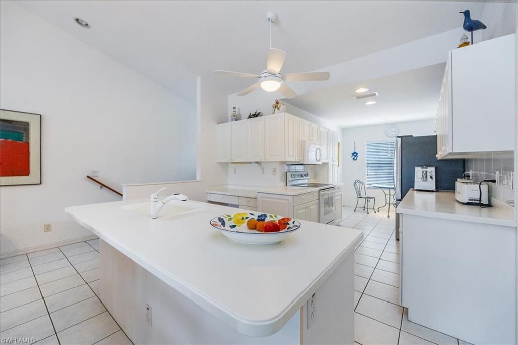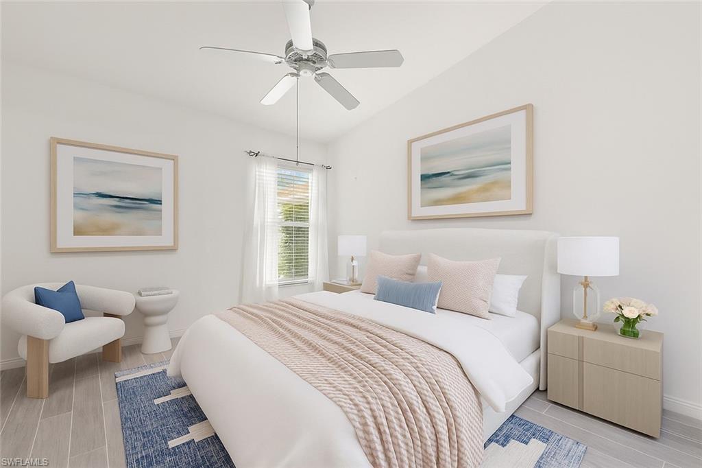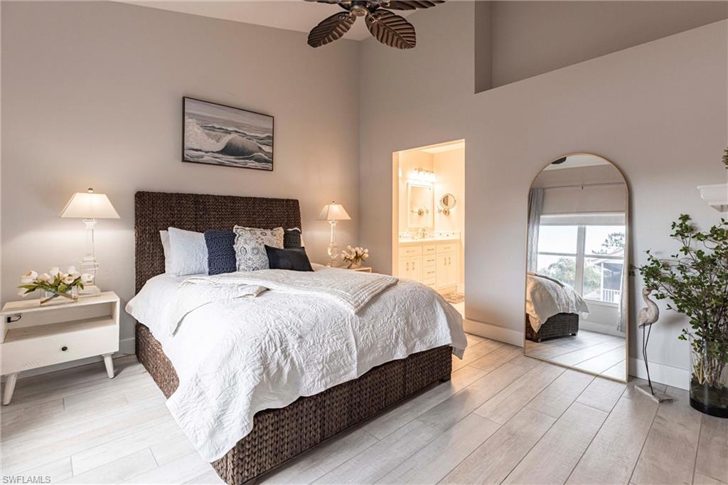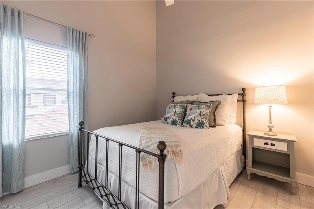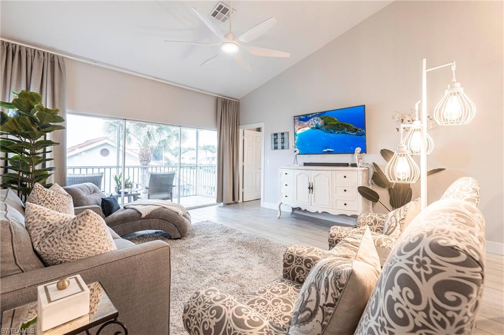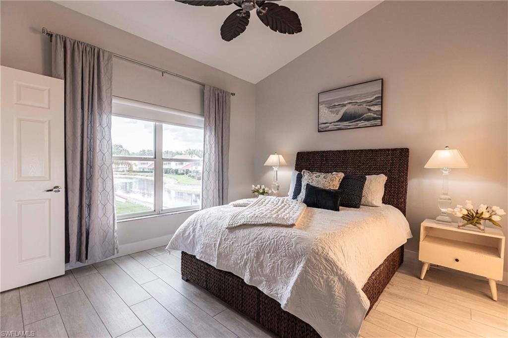 This top-floor, 3-bed, 2-bath coach home in Windsor Place at Berkshire Lakes offered turnkey furnished has been thoughtfully updated with designer touches, peaceful lake and fountain views, and the kind of quiet comfort only an upper-level unit can offer. With no neighbors above and volume ceilings throughout, this home is filled with natural light and an airy, open feel. Located at the front entry of the community with easy in-and-out access and additional guest parking just across the street, convenience is built right in. From the living room, lanai, and primary bedroom, you’ll enjoy serene western lake views and majestic sunsets—a true highlight of this special home. Inside, the home shines with a long list of upgrades, including Italian porcelain wood-style tile flooring throughout (2018), including the lanai, updated light fixtures, and fresh paint throughout. The split floor plan provides privacy for both bedrooms, and the primary suite boasts a large walk-in closet and an updated en-suite bath with dual sinks. The fully renovated kitchen (2018) boasts granite countertops, glass tile backsplash, soft-close cabinetry with pullouts, a custom pantry and garbage disposal (2020), and stainless steel GE appliances with a Bosch dishwasher. There’s also a coffee and wine bar for added convenience. The updated guest bathroom includes newer fixtures and toilets replaced in 2019. Essential improvements provide peace of mind, from the water tank (2018), washer/dryer set (2018), and new roof (2019) to the UV window film (2019) and A/C unit (2020). Other improvements include recessed lighting and a modern ceiling fan (2021). The attached 1-car extended garage includes extra cabinet storage and ample guest parking is located nearby. Beyond the home itself, Windsor Place offers a truly appealing lifestyle. You’re just steps from the community pool, yet tucked away for peaceful living, along with your choice to play tennis or pickleball. One of the most beloved features of this community is its network of walking paths around several large, picturesque lakes—perfect for morning jogs, evening strolls, or walking your dog. The location is ideal—just a short walk or bike ride to Publix, dining, a fitness center, bank, fast food, and more, with quick access to I-75, Marco Island, and downtown Naples. You’re also less than 7 miles from the world-renowned white sand Gulf beaches. Whether you're seeking a full-time residence or a seasonal escape, this move-in ready condo blends comfort and convenience in one exceptional Naples package.