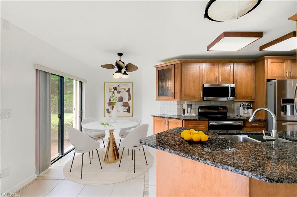 Are you looking for a light-filled, first-floor end unit with private garden views and a low-maintenance lifestyle in a prime Naples location? This beautifully maintained residence in the gated community of The Preserve at The Shores offers a rare blend of privacy, comfort and convenience, complete with low HOA fees and pet-friendly living. With abundant natural light, landscaped surroundings, a newer roof and HVAC system, and a recently painted building exterior, this turnkey furnished home delivers outstanding value just minutes from downtown and the beaches. This two-bedroom plus den, two-bath unit features a one-car garage and a screened lanai with tile flooring, garden views and pocketing sliders for seamless indoor-outdoor living. Hurricane-rated windows and doors provide added peace of mind. Inside, diagonal tile flooring flows through the main living areas. The kitchen offers recessed lighting, shaker-style cabinetry, a tile backsplash and white appliances including a range, microwave, dishwasher and refrigerator/freezer. A cozy breakfast area with built-in bench seating enjoys peaceful garden views, while a formal dining space adds flexibility for entertaining. The living room features direct lanai access, ideal for enjoying the outdoor scenery. The owner’s suite overlooks the gardens and includes a walk-in closet with shelving and an en-suite bath complete with dual vanities, a walk-in shower with glass enclosure and a separate soaking tub. The guest bedroom sits adjacent to a full bath with a shower-tub combo, while the den, with pocket doors, offers the ideal setting for a home office or study. The laundry area includes overhead shelving and a washer and dryer for everyday convenience. The Shores is a well-established, amenity-rich community offering a resort-style pool with a sunny deck, tennis and pickleball courts, fitness center, bocce, children’s play area, clubhouse, billiards room, library, meeting rooms, and scenic paths for biking or recreation. Ideally just off Santa Barbara Boulevard with easy access to Interstate 75, Davis and Radio Road, this home is only 15 minutes to Lowdermilk Beach and shopping, dining and cultural offerings of downtown Naples.