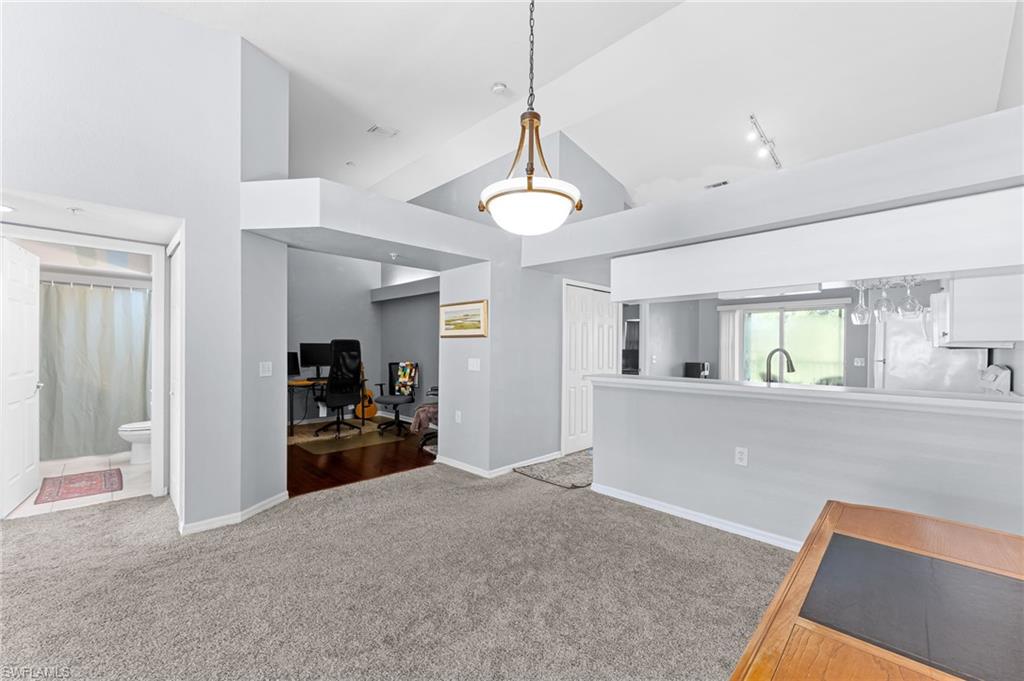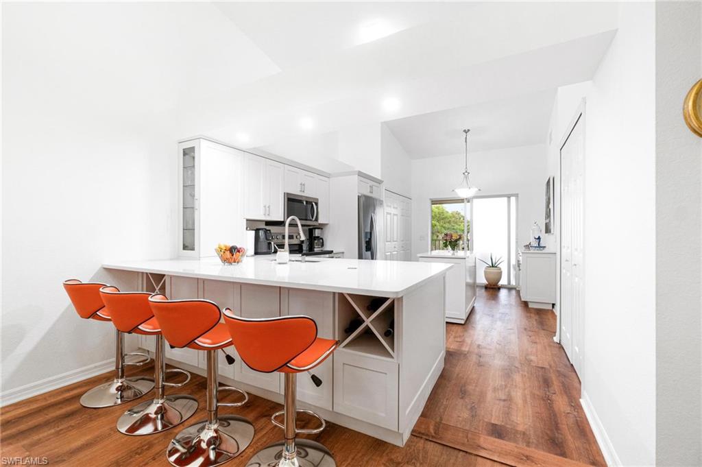 LOWEST PRICED unit with a GARAGE in Bermuda Palms!! EXQUISITE 2bed+den lake view condo with 1-car garage in highly-desired North Naples location. The den could easily serve as a third bedroom. Meticulously maintained by its only owner, this second floor condominium truly shows like a model home! The Seller spared no detail with the stunning kitchen renovation. Boasting quarts countertops, white shaker soft-close cabinetry, oversized breakfast far, island with great storage space, a fabulous coffee/beverage bar area, built-in wine storage, convenient pop up electrical outlets and much more. BRAND NEW A/C SYSTEM (Nov. 2025)!! A spacious, NEWER closet system in the primary bedroom was completed by Inspired Closets (Dec. 2023). The vinyl laminate flooring in the unit was installed approx. 3 yrs. ago. Roof is NEW as of 2023. Another perk is the detached 1-car garage featuring Epoxy flooring (Dec. 2023) and great attic space perfect for extra storage. Additionally, the unit conveniently has an assigned parking spot. Located steps away from Seed to Table, shopping, dining, I-75 and less than 7mi. from our Famous White Sand Beaches! This lovely unit is guaranteed to make you feel right at HOME! Very easy to show.