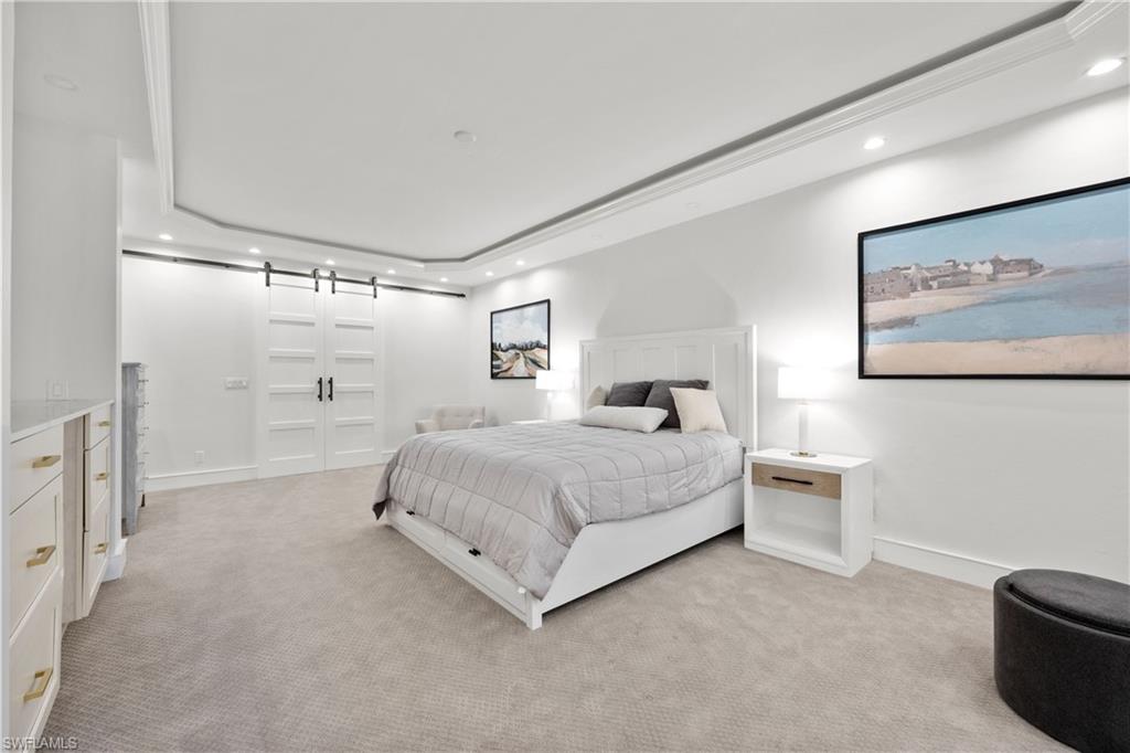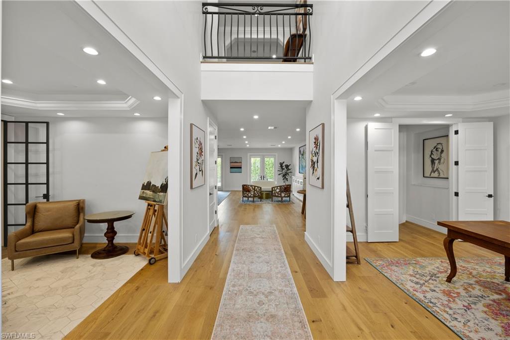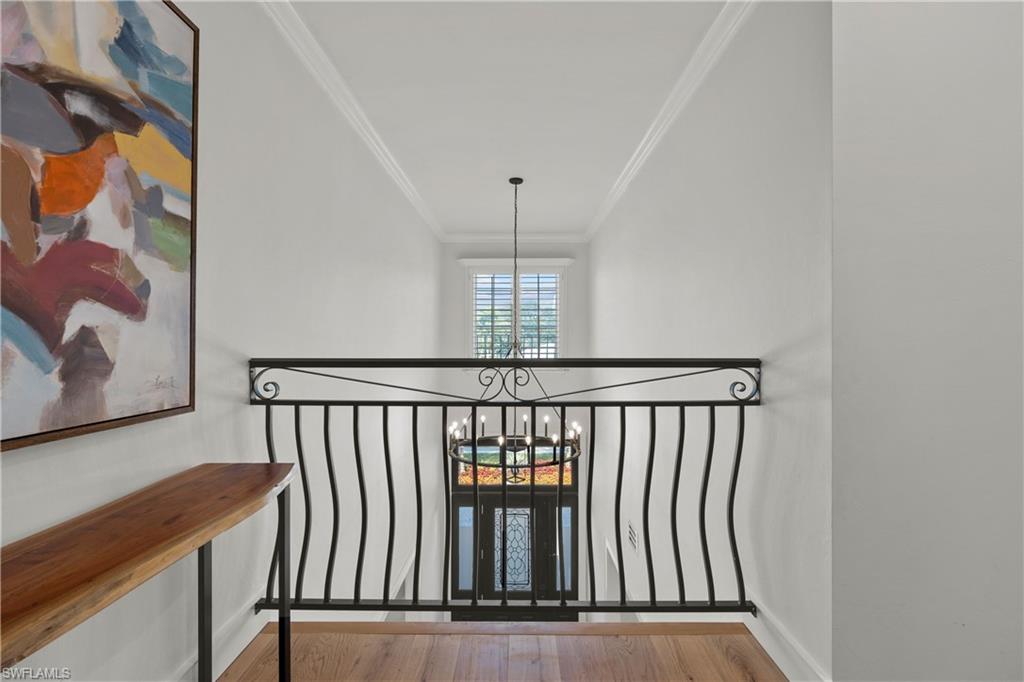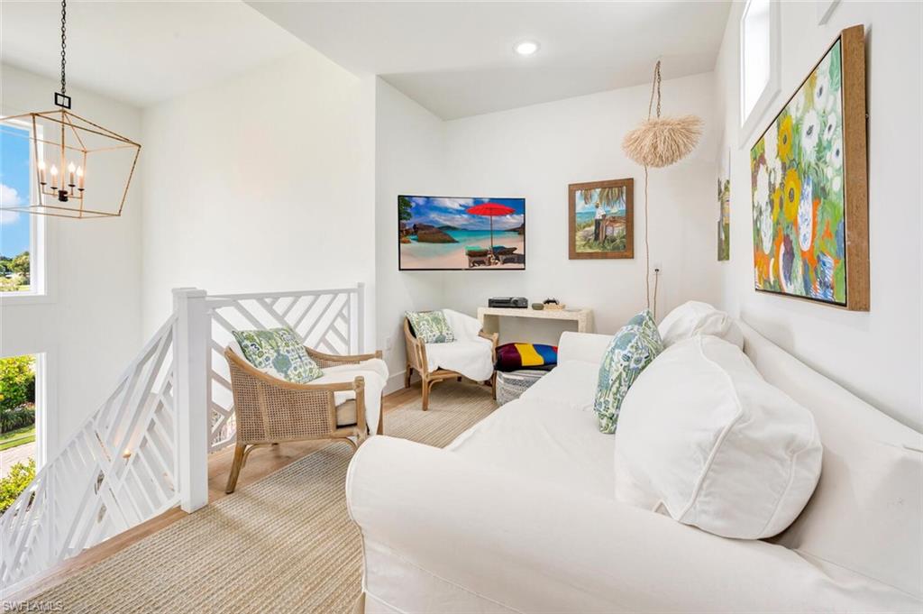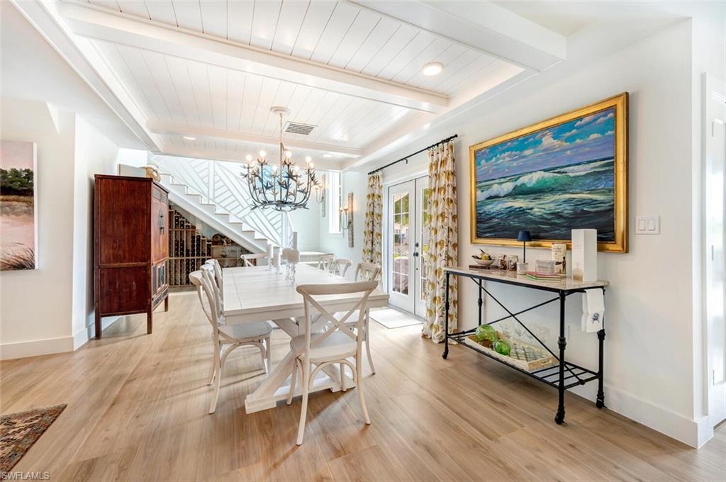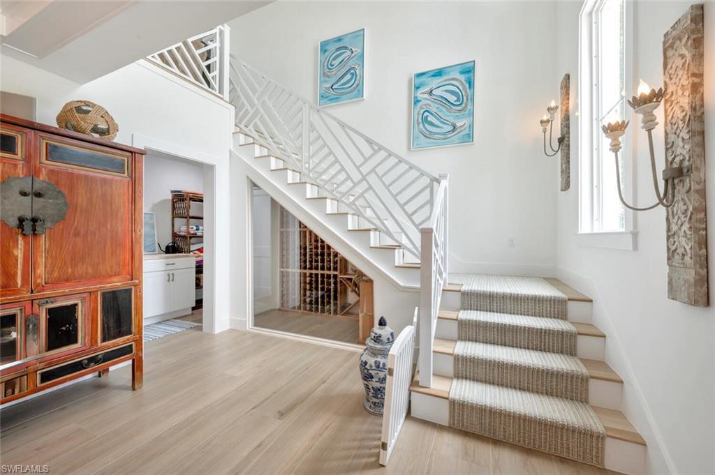 Gorgeous completely renovated home including a new roof and hurricane windows with sweeping east and west golf course views located in the heart of Naples. This coastal theme home exudes effortless style with all of the fine details; the living room displays a beautiful, coffered ceiling and fireplace, a formal dining room with a nearby wine room, and a chef's kitchen with a large island for the family to gather. The home boasts 5 bedrooms and 3 full bathrooms; a spacious layout with an abundance of natural light. The first-floor master bedroom has 2 large closets; hers opens up to the lanai. The second guest bedroom is ensuite on the first floor with a nearby office convertible to a bedroom. Upstairs, there is a cozy loft sitting area, accompanied by two bedrooms and a shared Jack/Jill bathroom. Outdoor living is elevated with a screened lanai showcasing a pool with a swim-up table, fenced yard and a separate patio area with a raised hot tub and grill. Just minutes to the beach, fine dining, and shopping. This neighborhood is a true hidden gem of Naples.